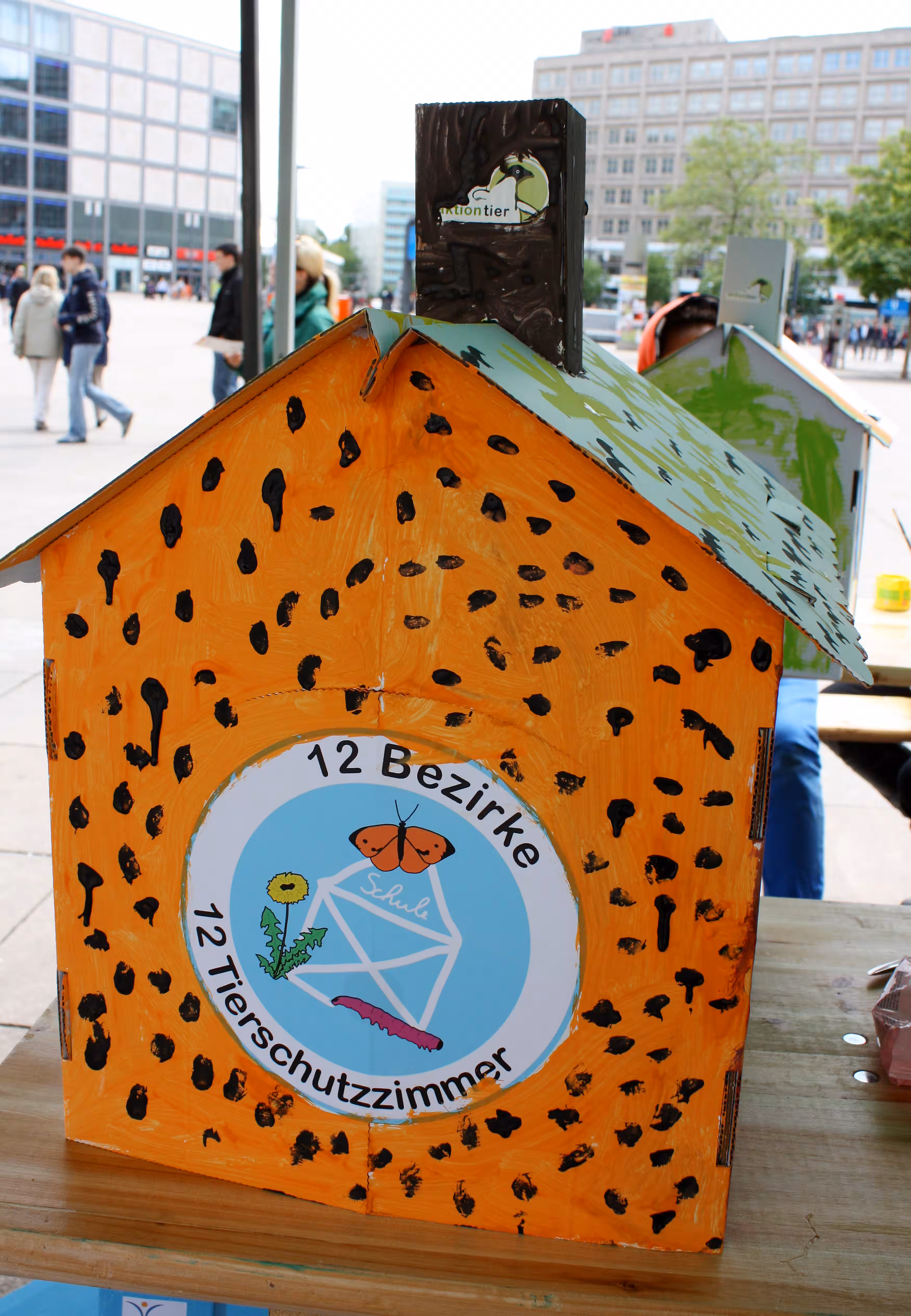 Zum Kampagnenstart am Berliner Alexanderplatz haben Schulkinder 12 kleine Häuschen aus Pappe, die unsere Tierschutzzimmer symbolisieren sollten, phantasievoll bemalt. An Infoständen konnten sich Eltern, Lehrer und Schüler über das Projekt informieren und Bewerbungsunterlagen mitnehmen. Auch das lebensgroße aktion tier- Maskottchen „Pingi“ hat wieder für gute Laune gesorgt.