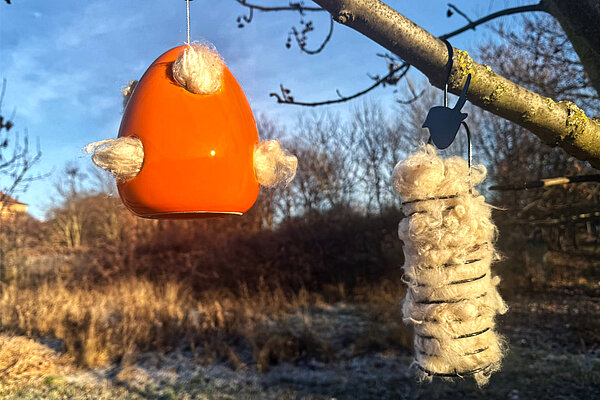 Kapok- Nistmaterial in einem speziellen Spender (li) und in einem Futterknödel-Halter (re). © aktion tier, Ursula Bauer