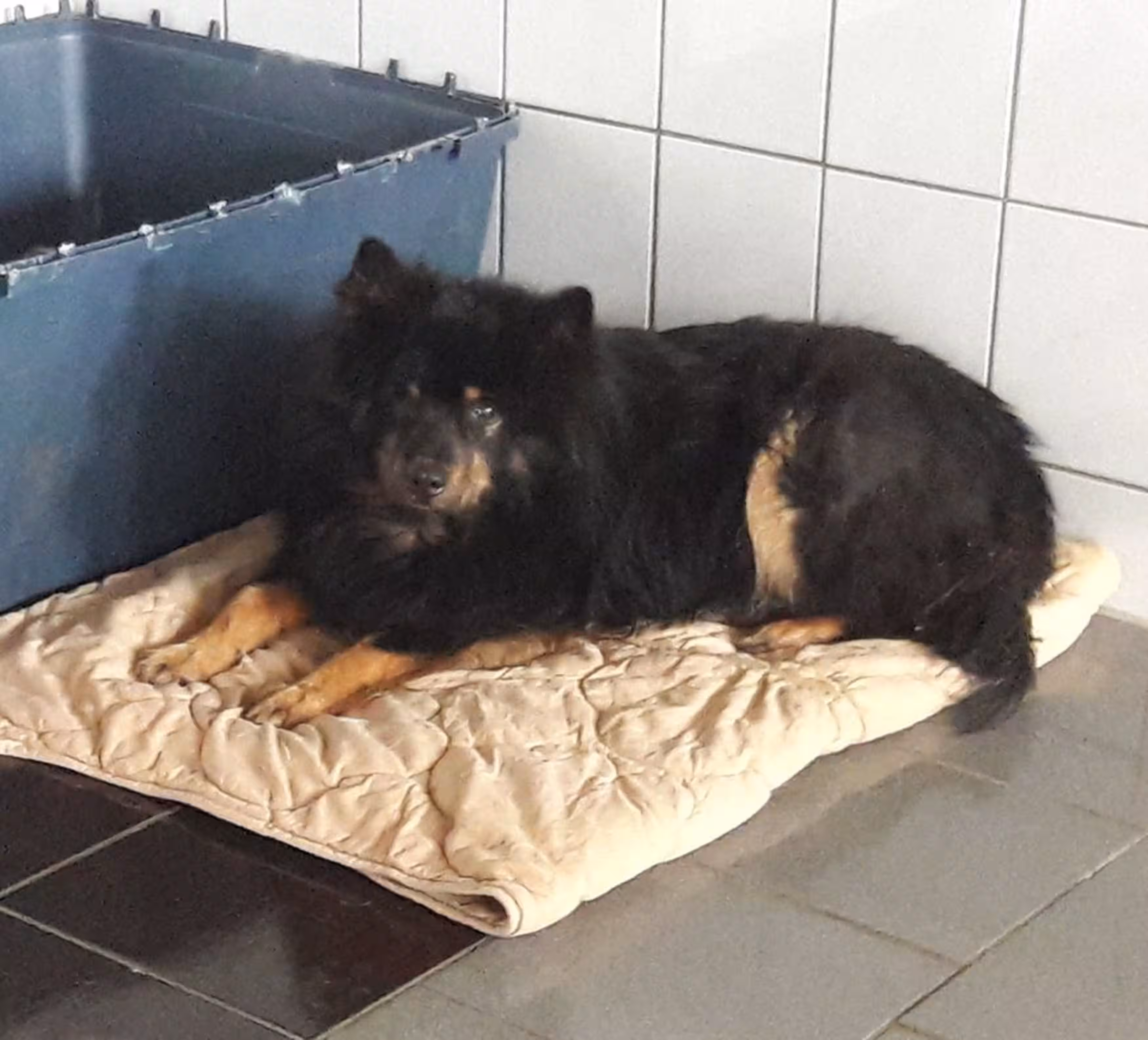 Funny (Leonberger-Kaukasemischling, 14 Jahre) ist nicht halb so lustig, wie es ihr Name vermuten lässt. Sie ist ebenfalls ein Hund, der nur mit Narkose gefangen und transportiert werden konnte. Hier pöbelt und und kläfft sie jeden voll, der sich ihrem Zwinger nähert. Bisher ist das Eis trotz tonnenweise Leckerlies und gutem Zureden nicht gebrochen – wir bleiben dran!