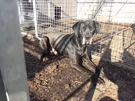 Odin (Deutsche Dogge Mix, 5 Jahre) ist ein sehr unsicherer Hund. In unbekannten Situationen oder gegenüber fremden Menschen zieht er die Lefze hoch und macht sich groß. Während der Fangaktion in Herzberg war er einer der Hunde, welche per Blasrohr von einer Tierärztin in Narkose geschossen werden musste, um ihn sicher nach Meissen überführen zu können. Hier hat er uns die ersten Tage auch deutlich spüren lassen, wie scheiße er das fand. Da wir im Einschleimen jedoch sehr gut und hartnäckig sind, hat er schnell gemerkt, dass er immer etwas Feines bekommt, wenn sich ein Pfleger nähert. Mittlerweile erwärmt er unsere Herzen mit diversen Kommandos wie Sitz, Platz etc und bettelt so förmlich um Aufmerksamkeit und viele Leckerchen. Und die bekommt er!