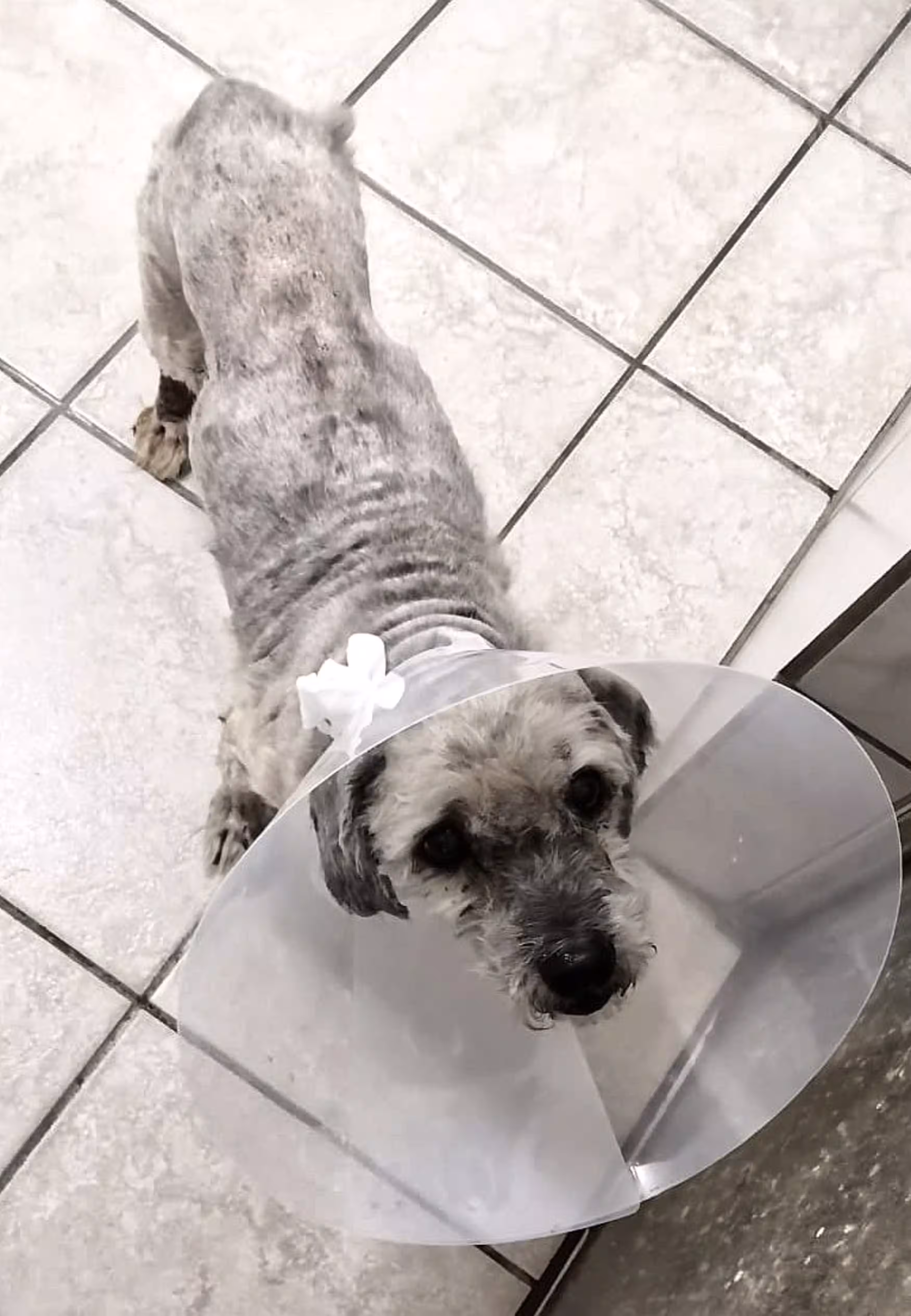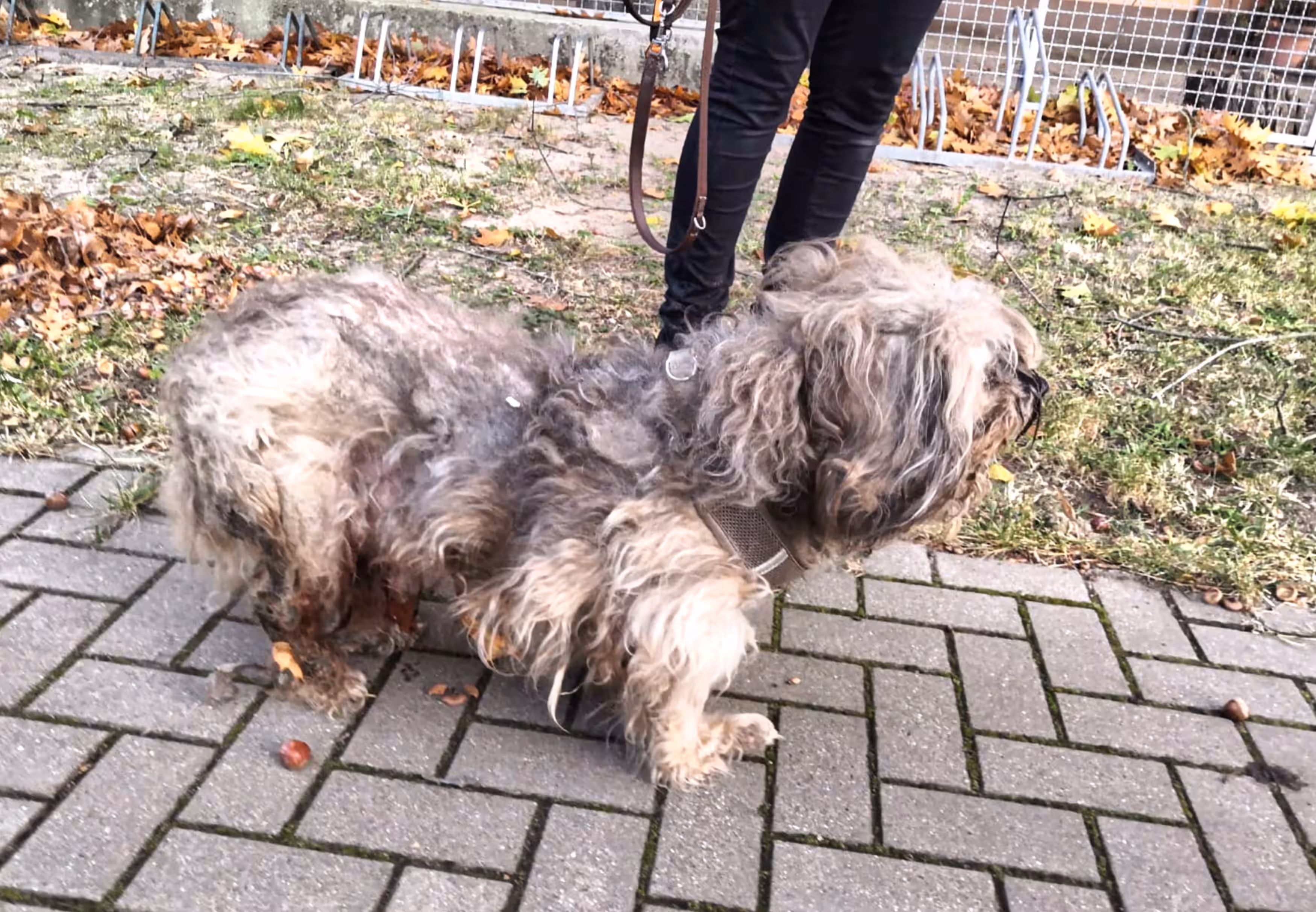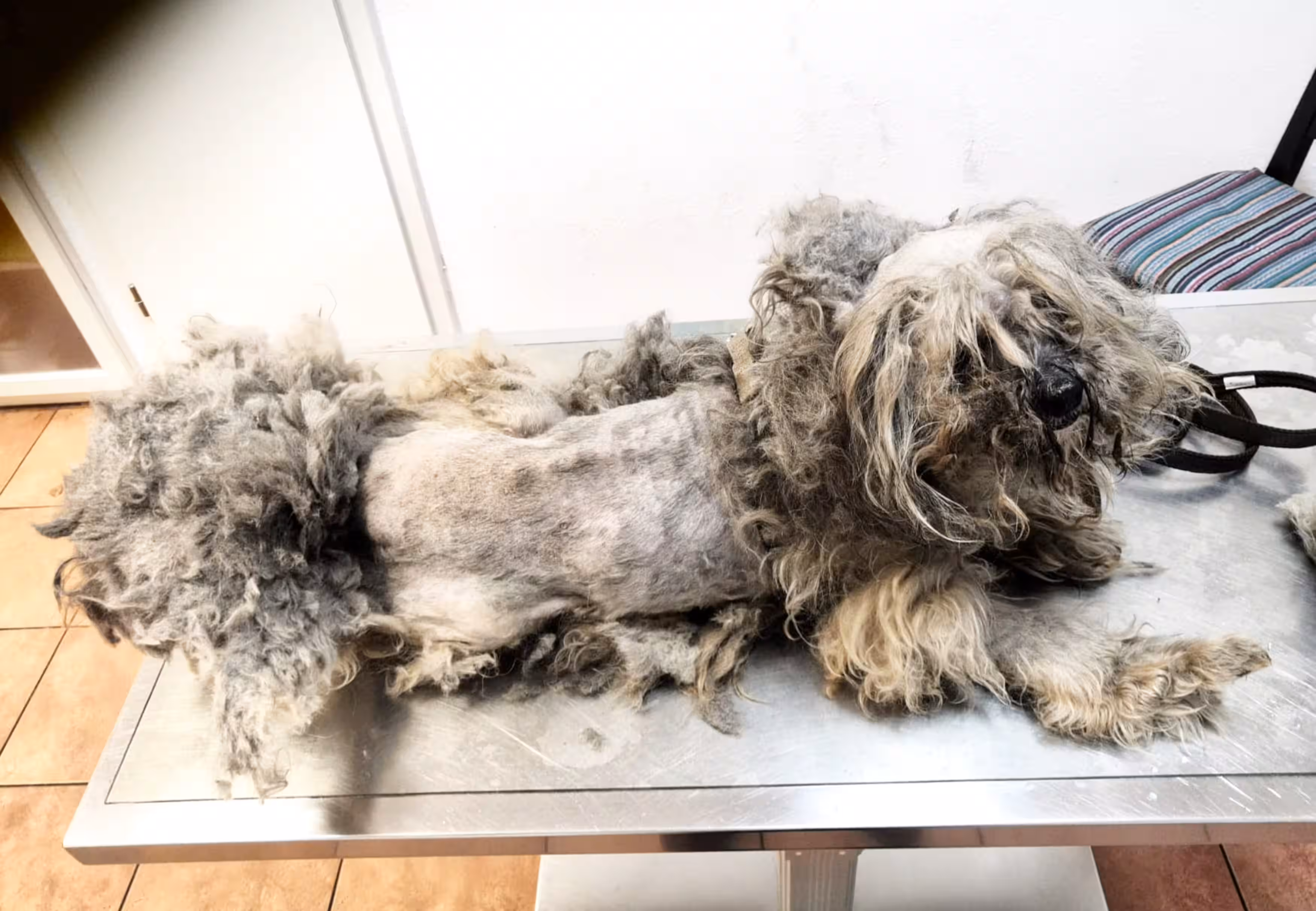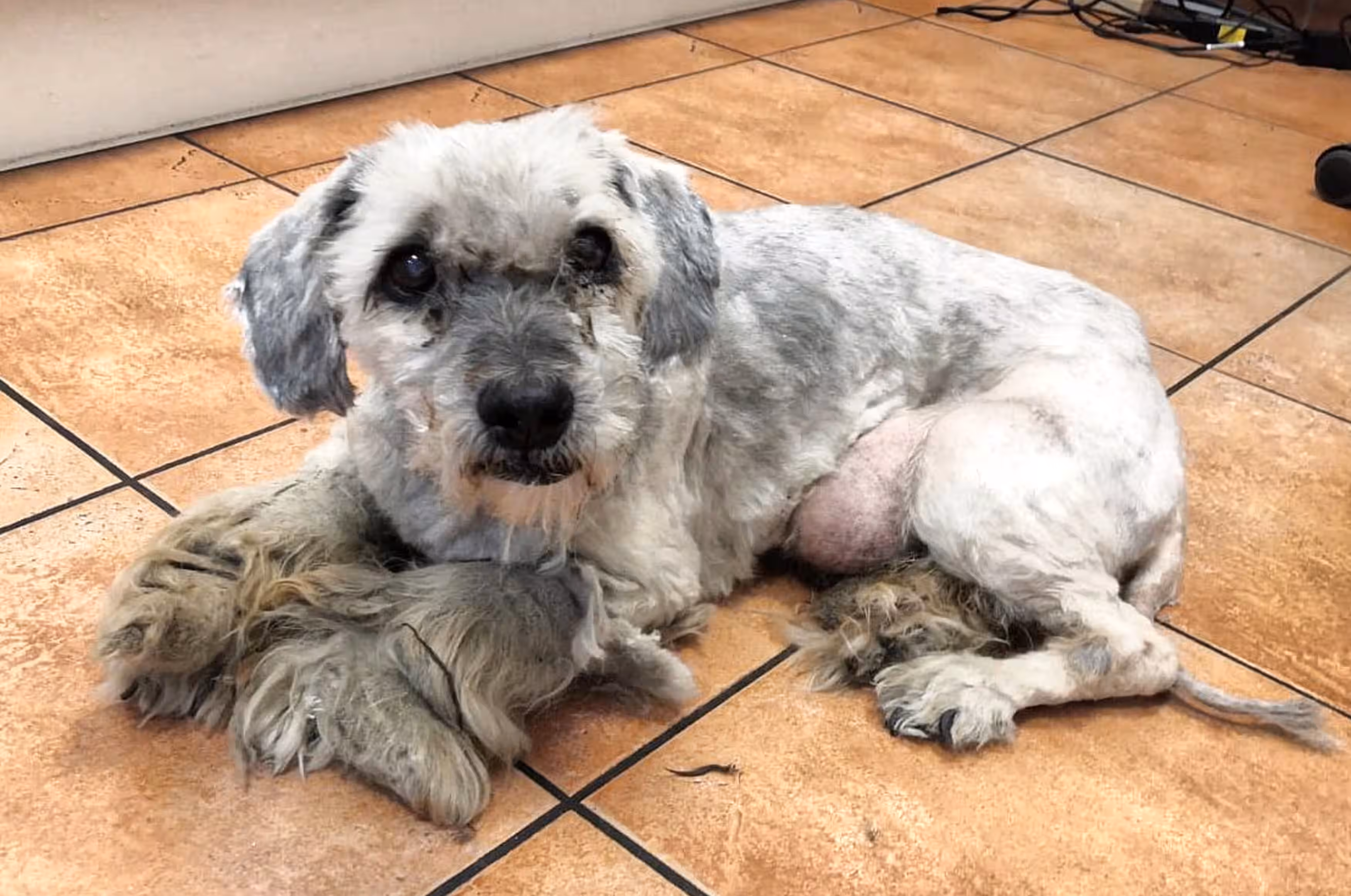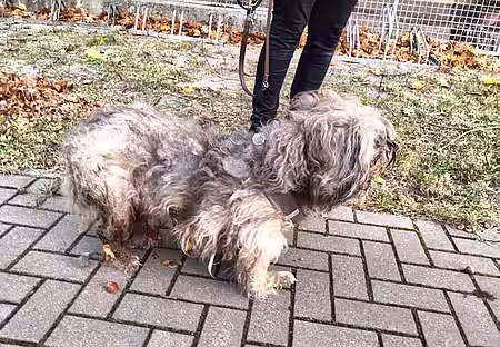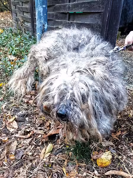 Nachdem etwa 2 kg Filz entfernt waren, kam ein hübscher, aber sehr magerer, etwa 10-jähriger Mischling zum Vorschein. Der Tierarzt stellte später noch mehrere Tumore am ganzen Hundekörper fest sowie vereiterte Augen und sehr schlechte Zähne, von denen zwei sofort gezogen werden mussten. Zudem setzt der Vierbeiner blutigen Urin ab und wird im Moment mit Antibiotika und Schmerzmitteln versorgt.