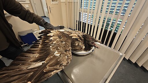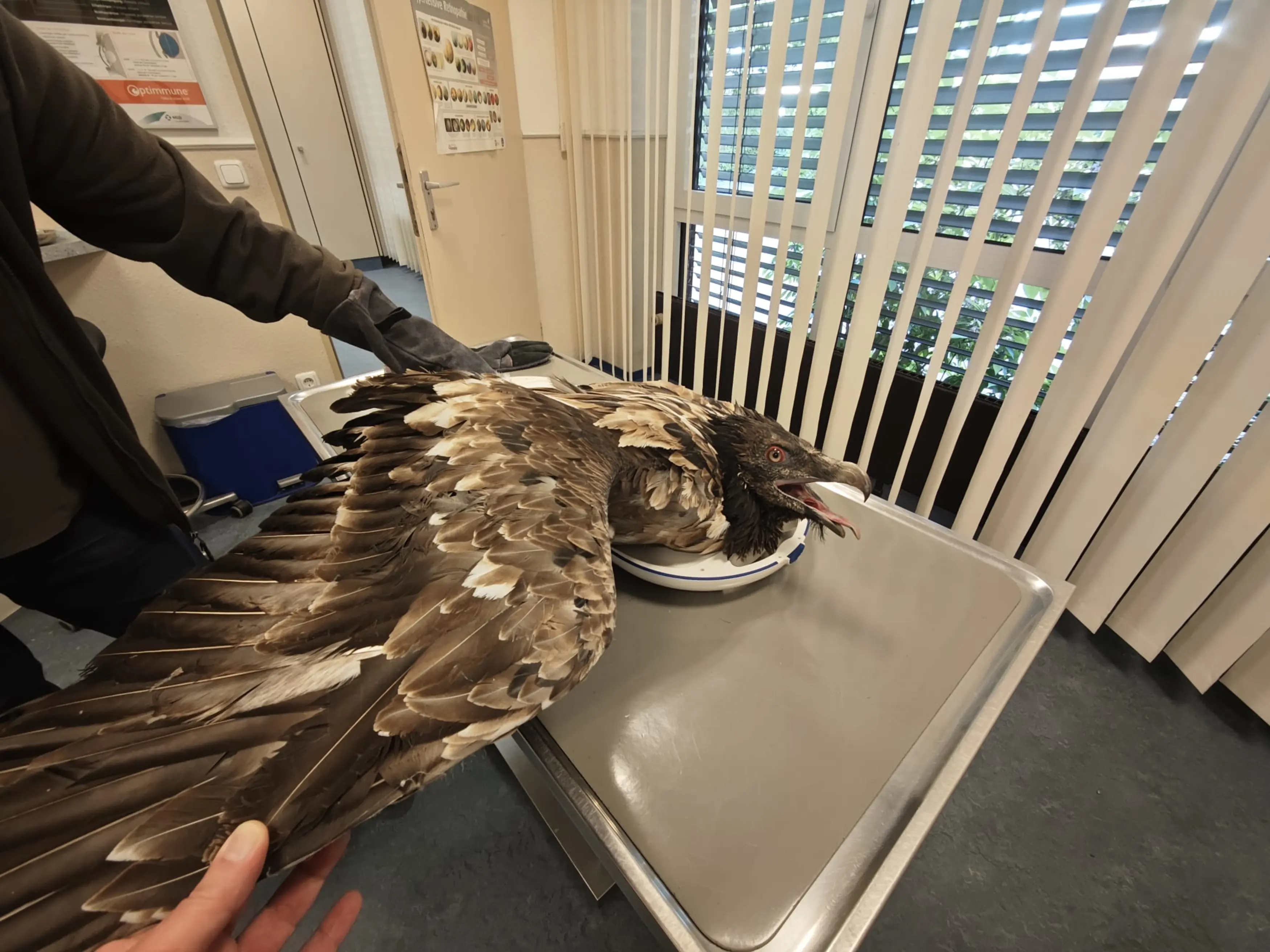 Nach seiner Ankunft fand umgehend eine erste Eingangsuntersuchung bei einem befreundeten Tierarzt der Wildtierauffangstation, Dr. Wilken, statt. Der Allgemeinzustand des Vogels war bedenklich, da er während seines Flugabenteuers fast zehn Prozent seines Körpergewichts verloren hatte. Bei weiteren medizinischen Checks und Blutuntersuchungen, unter anderem auf bleihaltige Munitionsreste, die für Greifvögel eine große Gefahr darstellen, wurden keinerlei Verletzungen oder Auffälligkeiten festgestellt.