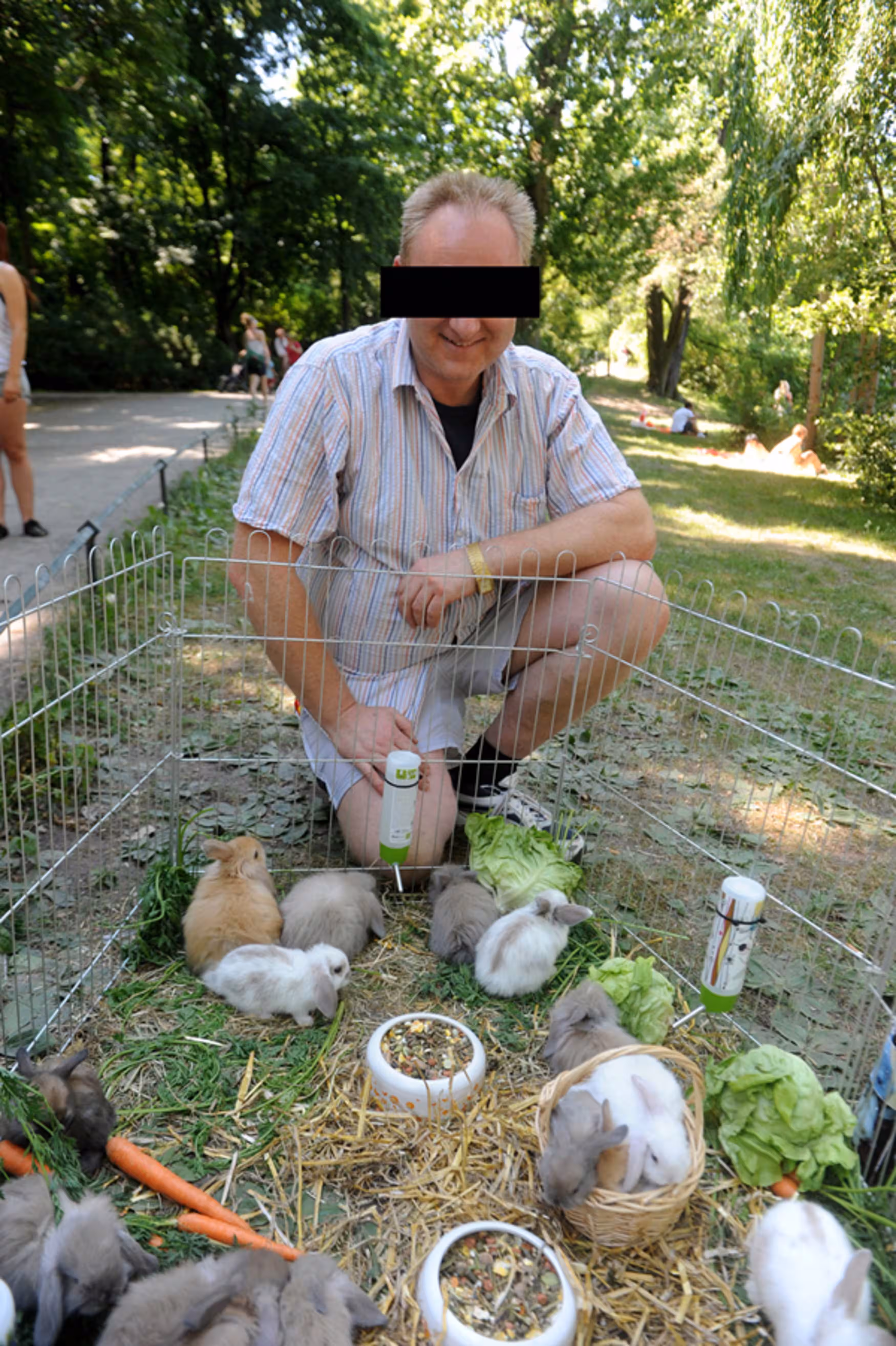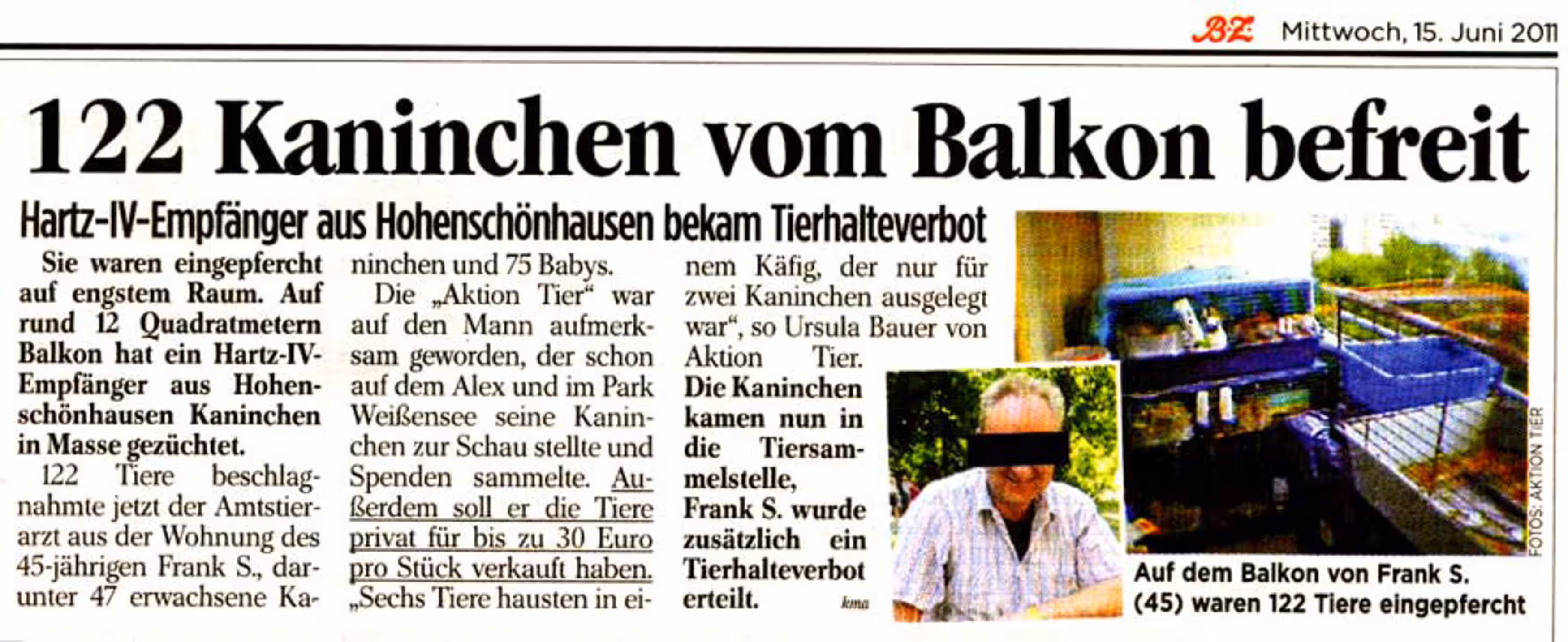 Der 45-jährige Frank S. erzählte uns auch seine persönliche Geschichte. Wie er vor einigen Jahren angeblich unverschuldet arbeitslos wurde, in ein tiefes Loch fiel, zu Trinken begann. Die Töchter wünschten sich Kaninchen, aber die beiden in der Zoohandlung gekauften Tiere waren keine Weibchen, sondern ein Pärchen. Der Nachwuchs wurde behalten, vermehrte sich munter, weitere Kaninchen wurden aufgenommen und so waren es am Ende 122 Tiere. Um den Bestand einigermaßen im Rahmen zu halten, mussten die Babys schließlich verkauft werden – das Geschäft mit den Tieren begann. Aber die Geschichte von Frank S. handelt auch von hohen Schulden, diversen Konflikten mit dem Gesetz und einer zerbrochenen Liebesbeziehung. Eine menschliche Tragödie, berufliches und privates Scheitern. Da boten die Tiere eine vermeintliche Zukunftsperspektive, Beschäftigung, ein gewisses Einkommen und ein Entrinnen aus der unerträglichen Bedeutungslosigkeit. Als „Kaninchen-Frank“ war man wer, war wichtig, wurde angerufen, hatte Termine. Vor allem die durch die Kaninchenbabys hervorgerufene Aufmerksamkeit bei den regelrecht inszenierten Aufritten in der Öffentlichkeit muss Frank S. sehr gefallen haben. Bei allem Verständnis für die menschliche Komponente des Dramas ging es uns jedoch in erster Linie um die Kaninchen, denen der Tiersammler ohne vernünftigen Grund Schmerzen und Leiden zugefügt hat.