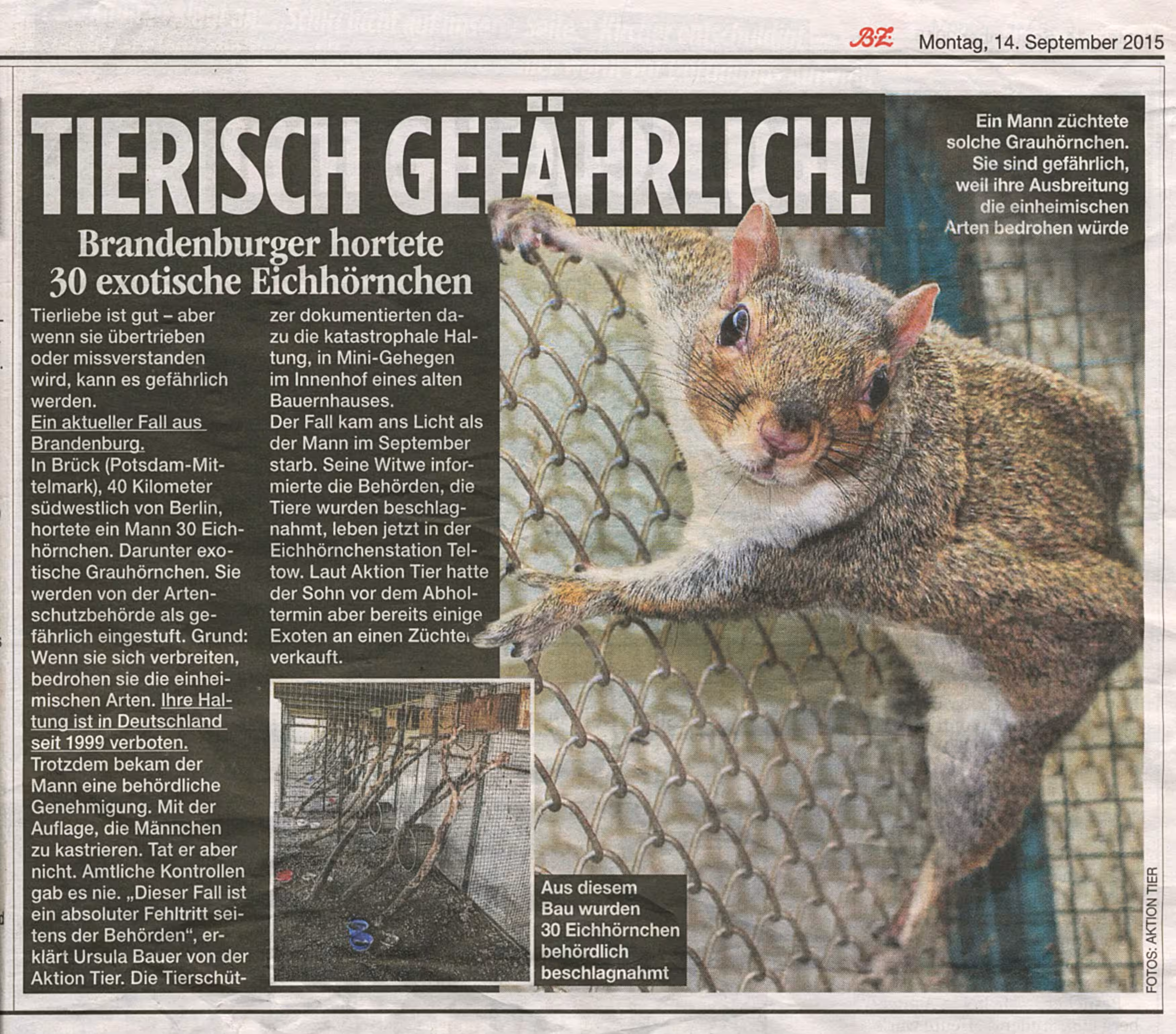 Ich begleitete Frau Lenn bei einer ersten Bestandsaufnahme. Wir fanden 30 Eichhörnchen vor, die mehreren in Deutschland nicht heimischen Arten zuzuordnen sind. Da exotische Eichhörnchen oft sehr schwer zu bestimmen sind, manche Arten in diversen lokalen Unterarten vorkommen und sich verschiedene Arten teilweise bei gemeinsamer Haltung miteinander vermischen, konnten wir nur die vorgefundenen Grauhörnchen, Prevost- Hörnchen sowie eine sibirische Unterart unseres Europäischen Eichhörnchens sicher bestimmen. Bei den übrigen Tieren nehmen wir an, dass es sich um Fuchshörnchen, Hoffmanni-Costa-Rica-Hörnchen und Rotbauchhörnchen handelt. Obwohl die Haltung von Grauhörnchen in Deutschland seit 1999 verboten ist, war seitens der Artenschutzbehörde eine Genehmigung erteilt worden mit der Auflage, die vorhandenen Tiere zu kastrieren. Eine Kontrolle fand jedoch nie statt, so dass der Halter ungehindert Grauhörnchen vermehren konnte.