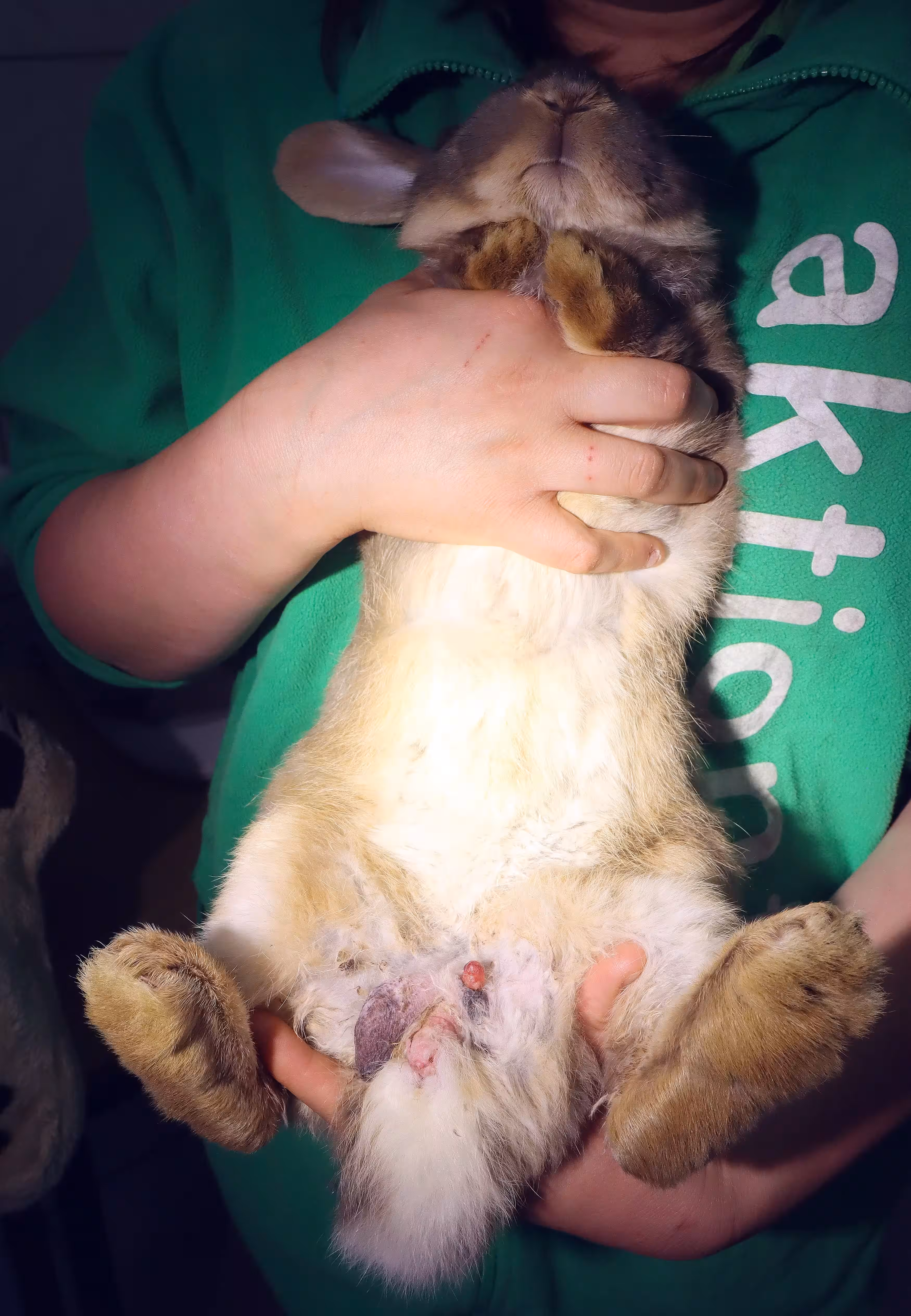 In diesen schlimmen Verhältnissen wurden die Häsinnen permanent gedeckt, konnten dann jedoch nicht in Ruhe Nester bauen und ihre Jungen zur Welt bringen. Die Neugeborenen wurden von den anderen Tieren größtenteils gefressen oder verstümmelt. Bei der Rettungsaktion wurden zwei tote Kaninchenbabys im Gehege entdeckt. Es grenzt an ein Wunder, dass einige Jungen trotzdem in der großen Gruppe überlebt haben. Bei einem fehlt ein Vorderfuß, ein anderes hat nur ein Ohr. Die Halterin gibt zu, die Schreie der malträtierten Tiere gehört zu haben, war aber außer Stande, einzugreifen.