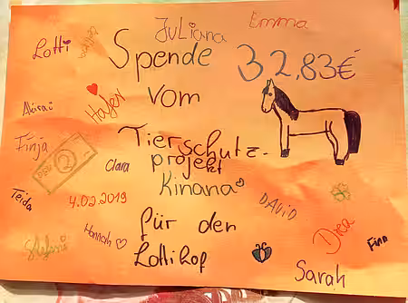 Um das Lernerlebnis abzurunden, bekamen die Schüler und Schülerinnen der Tierschutz AG gestern dann die Gelegenheit, den aktion tier Lottihof und die ehemaligen Legehennen zu besuchen. Im Gepäck hatten die engagierten jungen Tierschützer eine Spende von 32,83 EUR, die sie durch den Verkauf selbstgemachter Leckereien gesammelt hatten. Die Schüler und Schülerinnen halfen tatkräftig auf dem Hof mit, lernten etwas über die Bedürfnisse von Nutz- und Haustieren und machten anschließend einen Spaziergang mit den Eseln des Gnadenhofes.