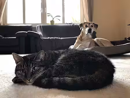 So saßen wir also bei mir Zuhause, die blinde Katze und ich. Erst einmal musste ich sie mit meinem Hund Ice bekanntmachen, den ich einst aus dem Tierheim Roggendorf geholt hatte, und mit meiner Huskymix-Hündin Neva. Die drei kamen Gott sei Dank unkompliziert zurecht. Spätestens, als Emma das erste Mal aus Ice´s Futternapf fraß, während der hungrig daneben hockte und ziemlich dösig aus der Wäsche guckte, war ich mir sicher, dass ich mir keine Sorgen machen musste. Mein „Problemhund“ würde der „Problemkatze“ nichts tun.