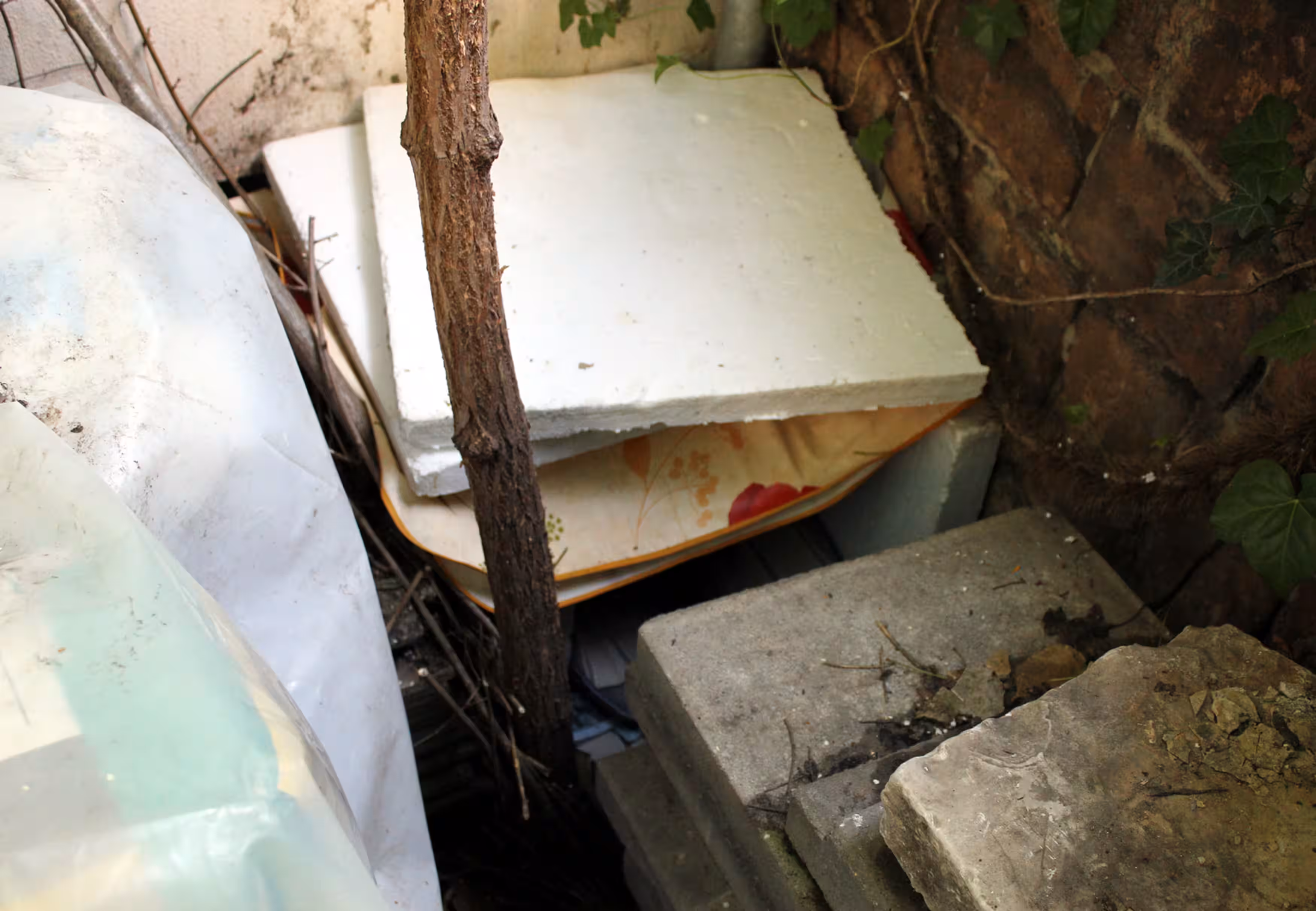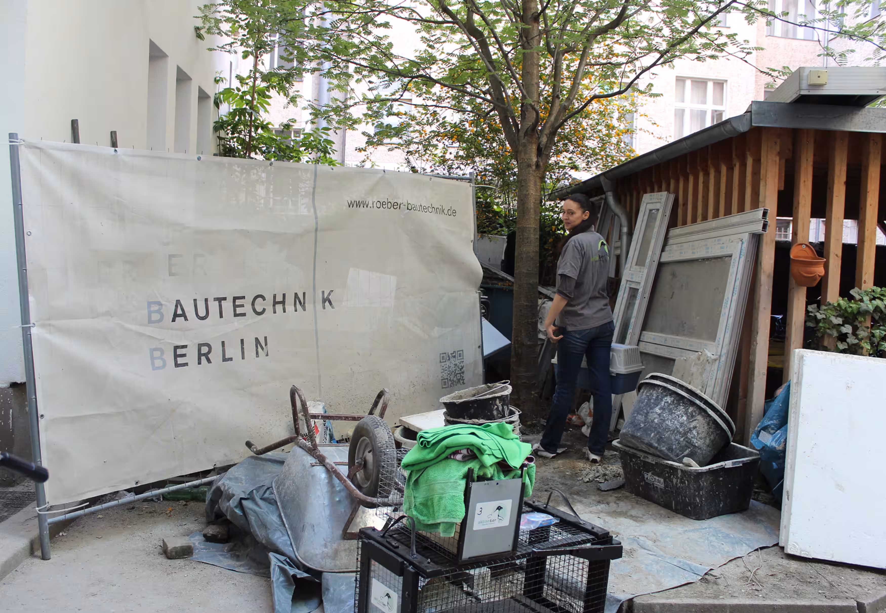 Die Mutterkatze wird hier seit längerer Zeit von Frau H. und anderen Hausbewohnern gefüttert. Dann kam der Nachwuchs. Alle haben jetzt Angst, dass die inzwischen etwa 5 Wochen alten Kitten bei ihren ersten Erkundungen zwischen Betonplatten, Mischmaschinen und Sandhaufen zu Schaden kommen.