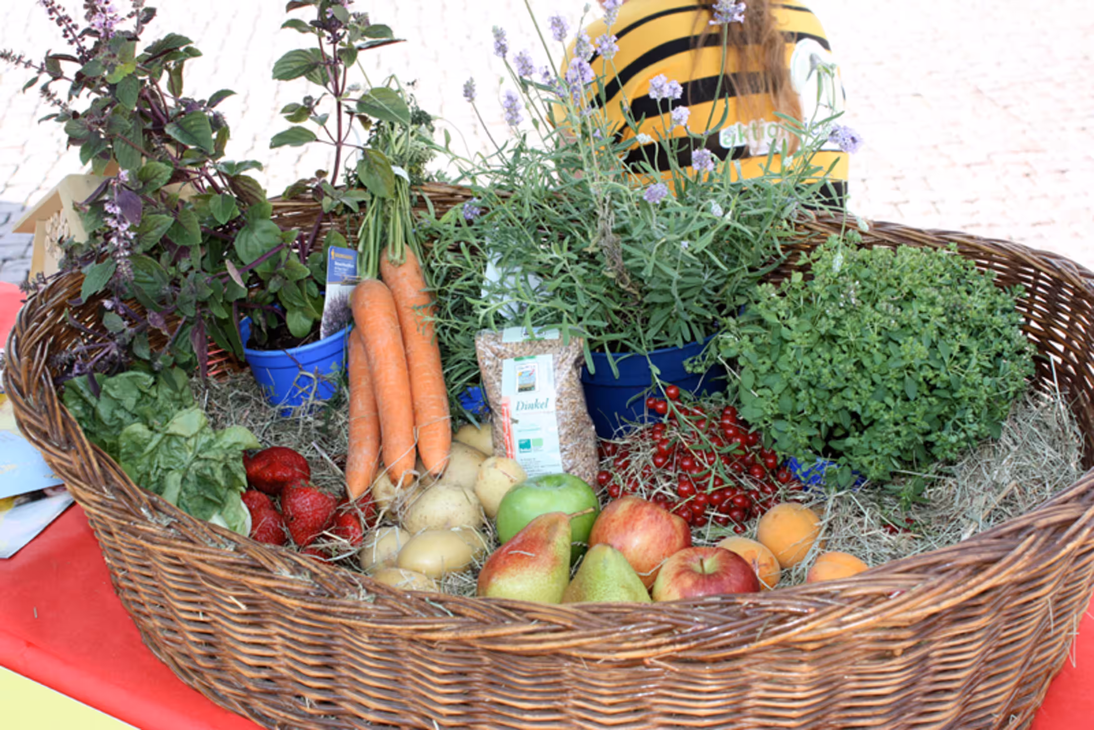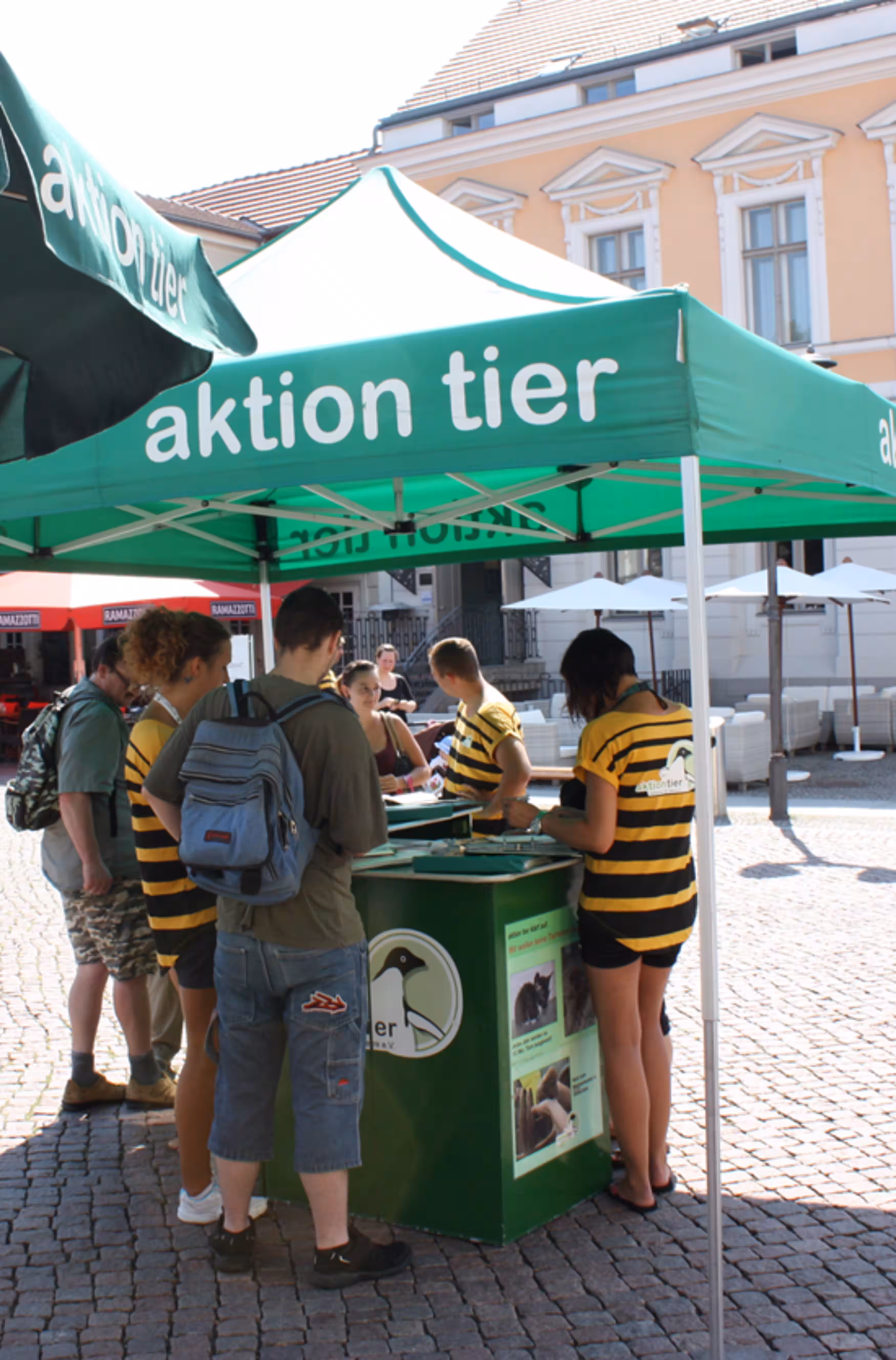 Neben einem großen Informationsstand mit allerlei Informtionsmaterial hatten die Mitarbeiter sich schwarz-gelb gestreifte Shirts angezogen und eine lebensgroße Biene verteilte Flyer an Passanten.