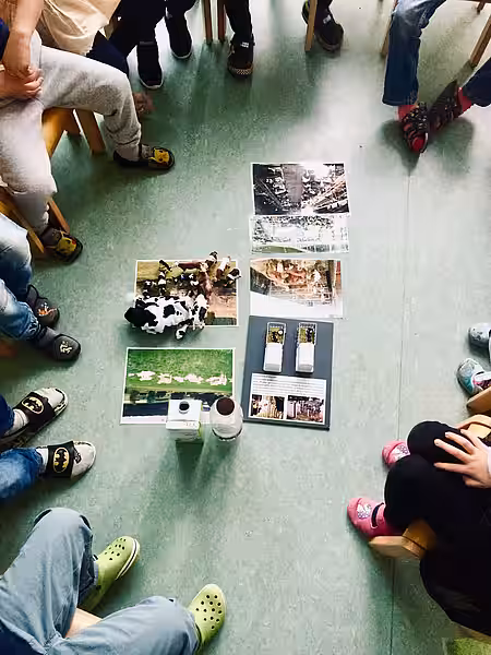 Die Kinder der Kita "Sonnenblume" stellen die Milchkühe auf die Weide