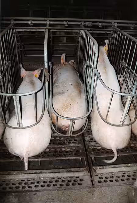 Zwischen den Gitterstäben eingezwängt, werden die Sauen jeglicher Bewegungsfreiheit beraubt, sie stehen und schlafen in ihren eigenen Exkrementen. Ein Umdrehen ist unmöglich, oft können sich die Tiere nicht einmal hinlegen und die Beine ausstrecken, ohne dass diese in den Nachbarkäfig hinein ragen. Das Ausleben arteigener Bedürfnisse wie auch die Wahrnehmung der so wichtigen Sozialkontakte ist unmöglich. Schweinezüchter begründen die Notwendigkeit von Kastenständen häufig damit, die Schweine vor Verletzungen z.B. während Rangkämpfen schützen zu wollen. Tatsächlich dienen sie jedoch vor allem dazu, möglichst viele Tiere auf möglichst wenig Raum unterzubringen und ein hierdurch verursachtes Verletzungsrisiko zu minimieren, bei gleichzeitig möglichst hohem Profit.