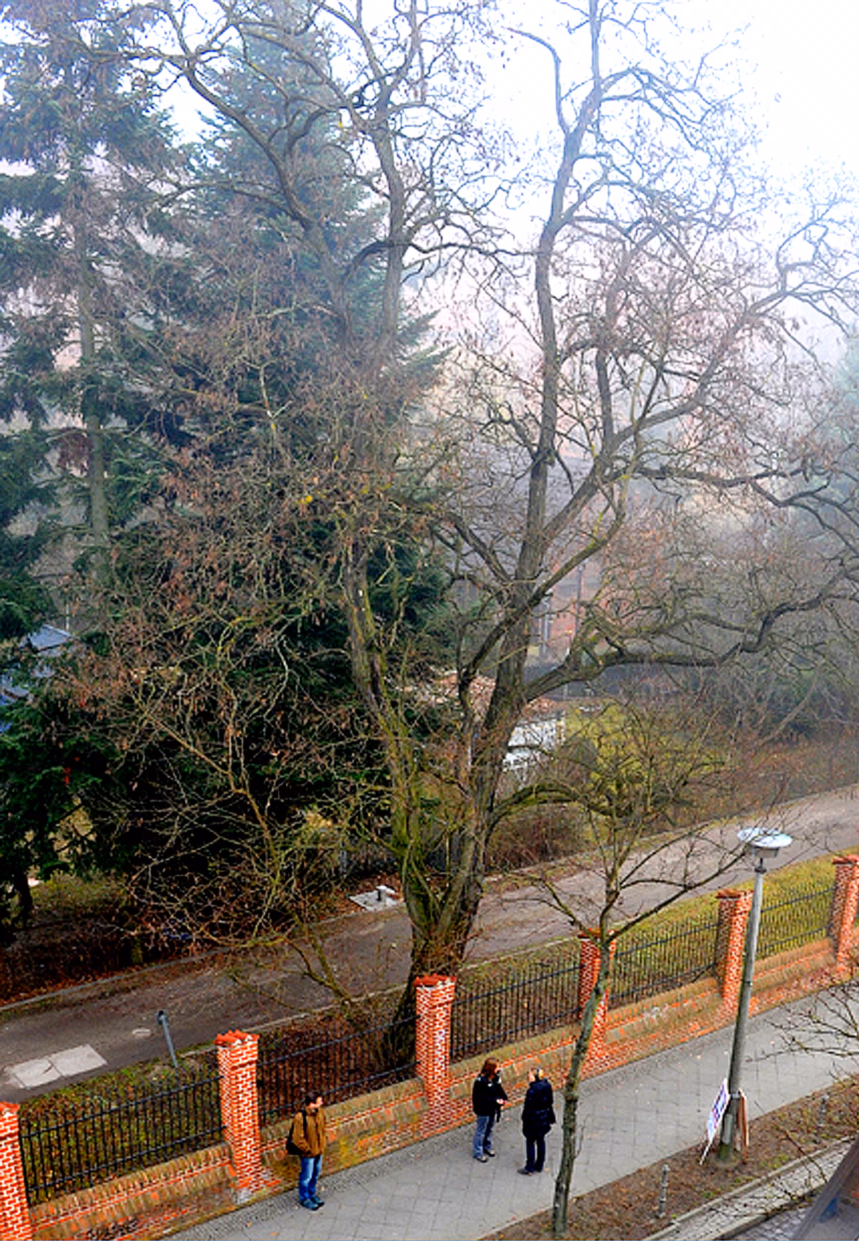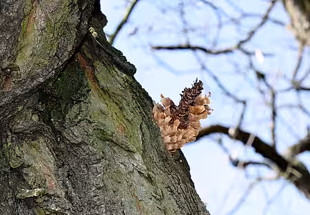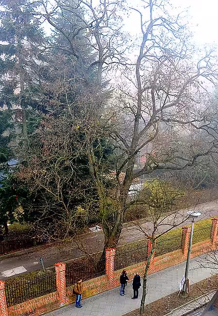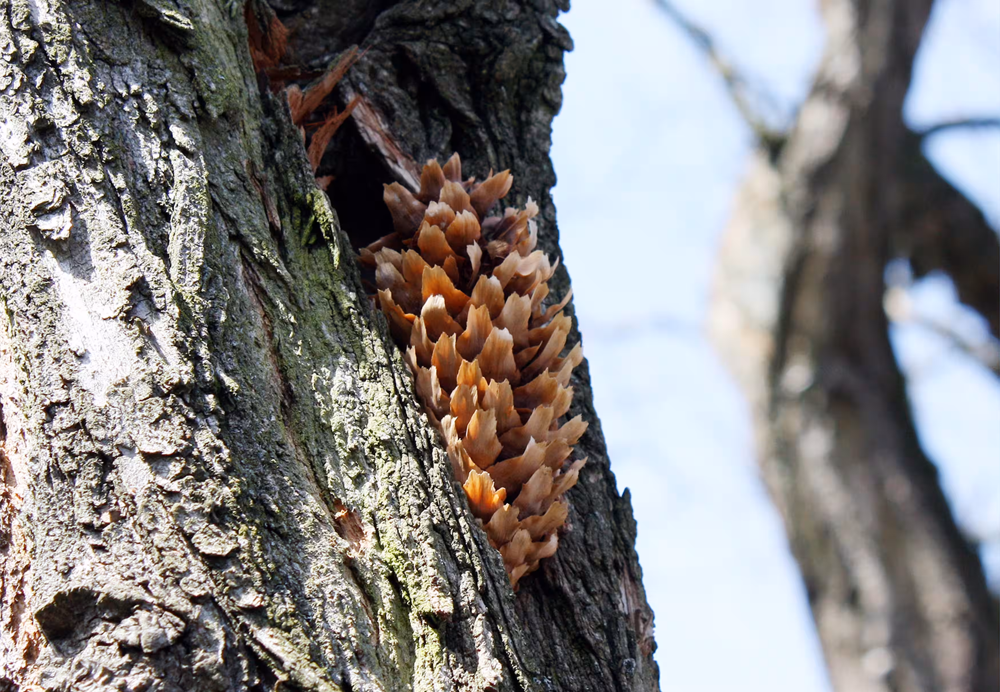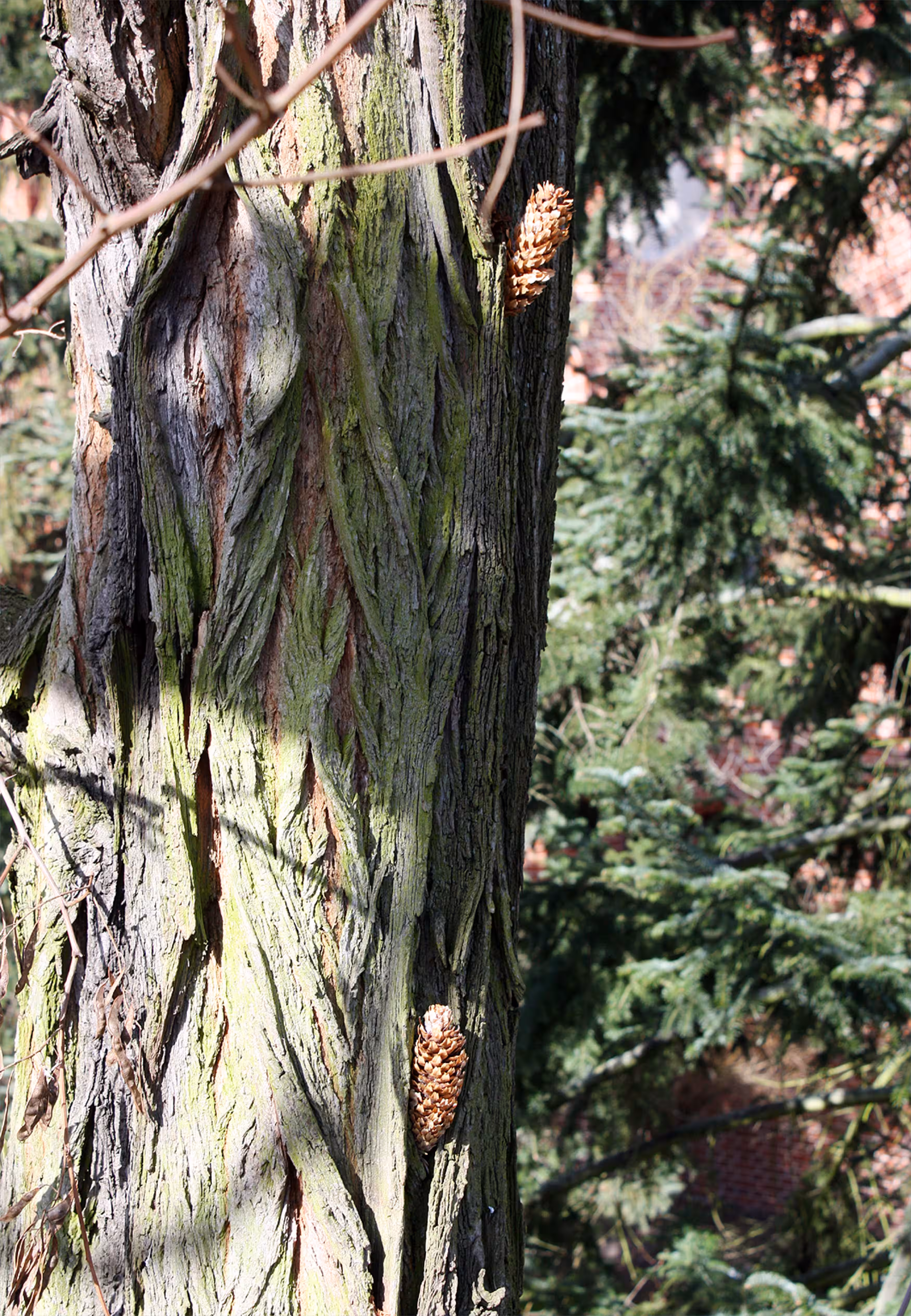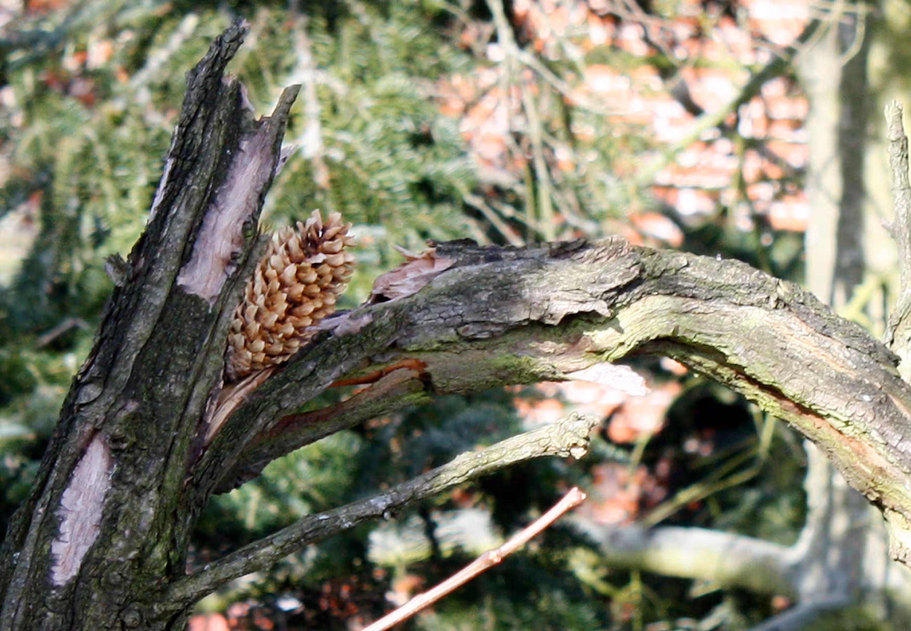 Bei näherer Untersuchung der Robinie entdeckte ich dann, dass an mehreren Stellen Zapfen in die Rinde gesteckt worden waren. Das sah lustig aus, wie eine Dekoration. Aber in der Natur hat alles seinen Sinn und auch in diesem Fall war klar, was hinter dieser vermeintlichen `Installation` steckte. Ein Tier hatte die Zapfen in den Spalten der Baumrinde verkeilt, um besser an die Samen heranzukommen. Genauer gesagt ein Vogel. Unsere Robine wird als sogenannte Schmiede genutzt.