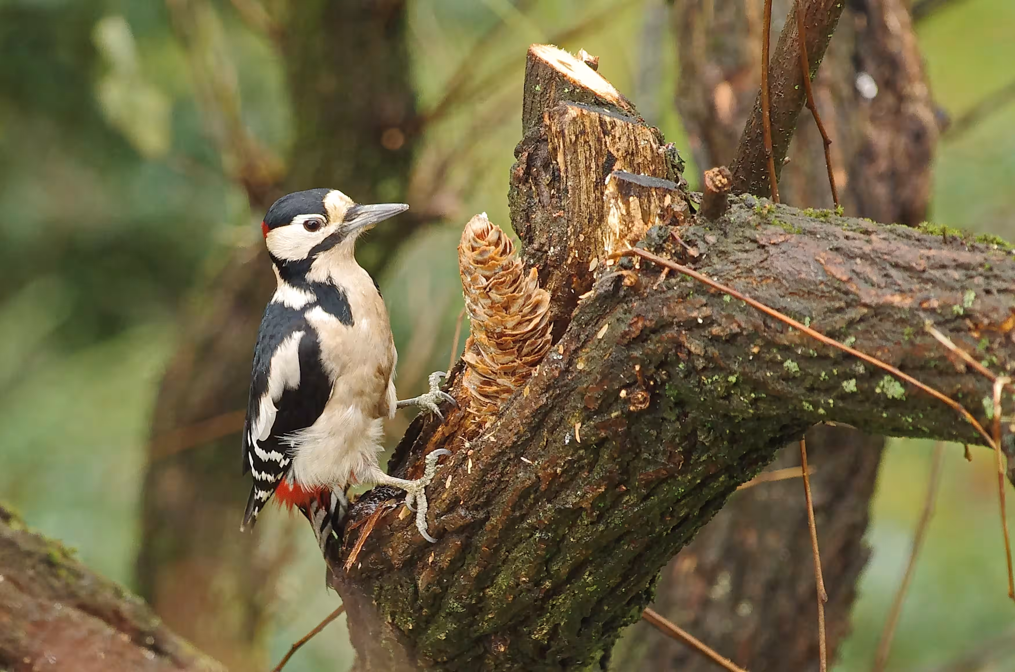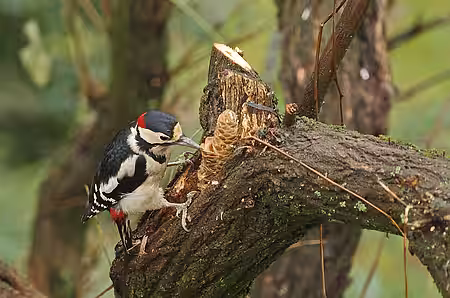 Verschiedene Vogelarten zeigen diese intelligente Art, sich Nahrung zu erschließen. Der Buntspecht ist wohl der eifrigste Schmied - daher spricht man von Spechtschmiede. Normalerweise fressen Buntspechte (Dendrocopos major) vorrangig tierische Kost. In der kalten Jahreszeit, wenn Käfer, Schnecken und Würmer in ihren Verstecken Winterruhe halten, stellt der Vogel seine Ernährung auf Beeren, Nüsse und Samen um. Um Nüsse zu knacken und an die Samen in den Zapfen von Nadelbäumen zu gelangen, trägt er die widerspenstige Beute im Schnabel zu seiner Schmiede. Oft hacken Buntspechte dafür extra ein Klemmloch in einen Ast oder einen Baumstamm. Der alte Zapfen wird entfernt, der neue in die Schmiede gestopft und mit dem Schnabel so lange bearbeitet, bis der Specht die Samen mit der Zunge herausziehen kann. Geeignete Schmieden wie unsere Robinie mit dem Eichhörnchenseil werden gerne immer wieder benutzt. Daher die vielen Zapfen am Boden.