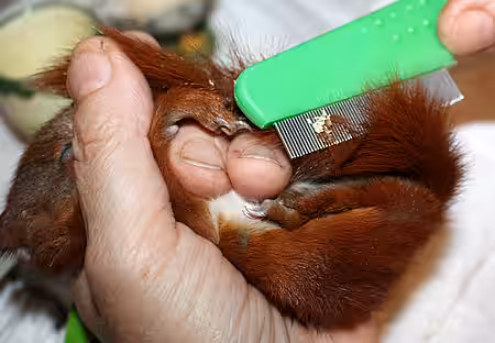 Parasiten merken genau, wenn ein Tier geschwächt ist. So hatten sich schon zahlreiche Milben und Flöhe auf dem Eichhörnchenbaby eingefunden. Weitaus schlimmer war jedoch der Befall mit Fliegenmaden. Denn diese bohren sich aktiv in die Haut und fressen ihr Opfer quasi von innen auf. Zum Glück waren bei unserem Hörnchen die Maden noch nicht in den Darm eingedrungen, denn das wäre sein Todesurteil gewesen. Trotzdem war es eine Rettung in letzter Sekunde, denn die bereits vorhandenen Parasiten hätten sich rasant ausgebreitet und vor allem den Darm zerstört, so dass das Hörnchen elend gestorben wäre. Frau Lenn entfernte alle Quälgeister, Eier und Larven vorsichtig und ließ das erschöpfte Eichhörnchen dann erst einmal ein wenig schlafen, bevor es später eine Milchmahlzeit bekam. Im Alter von sechs Wochen werden Hörnchenjunge nämlich noch von ihrer Mutter gesäugt. Erst mit etwa acht Wochen verlassen sie zum ersten Mal allein das Nest, bleiben aber auch danach noch bis zu vier Monate mit der Mutter und den Geschwistern zusammen.