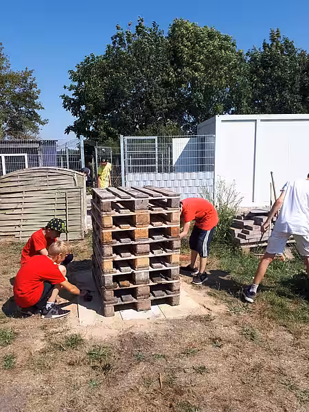 Ihr Insektenhotel besteht aus Euro-Paletten, Natur- und Ziegelsteine, Stöcken und Stroh. Auf dem Dach befindet sich ein Bio-Kräutergarten, bestehend aus Gemüsezwiebeln, Cola-Kraut, Ananas-Minze, Limo-Kraut, Minze und Curry- Kraut.