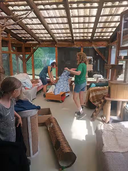 Die Lottihof-Ferienkinder halfen uns tatkräftig beim Saubermachen im Katzenhaus mit. Allein dort haben aktuell 52 Katzen ihre Unterkunft, die sich natürlich auch über ausgiebiges Schmusen mit den Kindern freuten.