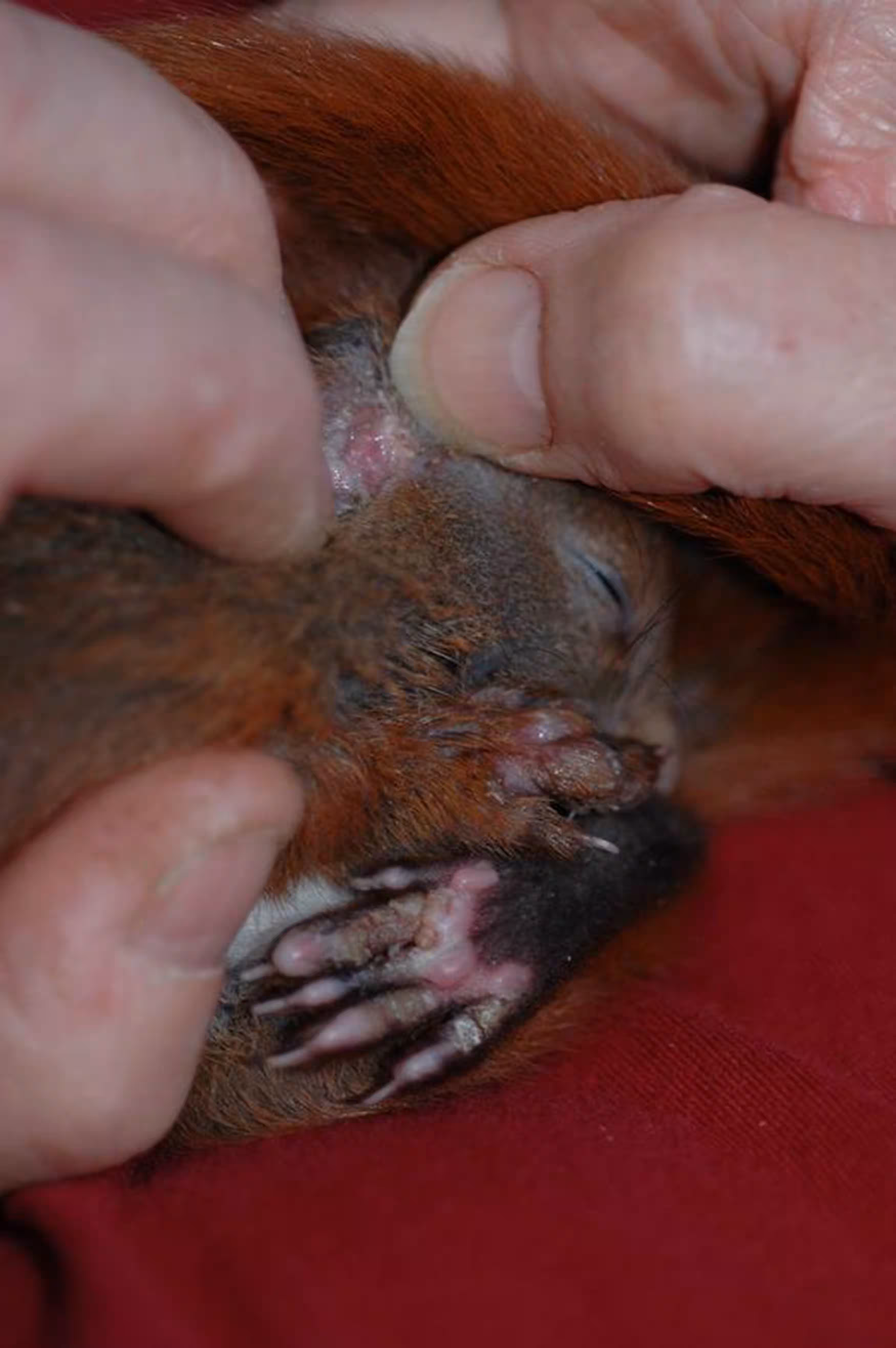Menschen und Haustiere sind nicht gefährdet. Auch erwachsene Hörnchen stecken sich nicht an. Aber für die betroffenen Jungtiere kann es wirklich die Hölle sein. Die Krankheit beginnt relativ harmlos mit krustigen schorfigen Hautveränderungen an den Füßen, den Händen und/oder den Ohrrändern. Bei schlimmerem Verlauf bilden sich am gesamten Schwanz dicke feste Krusten, die ein Bewegen des Schwanzes recht schmerzhaft gestalten. Auch am Geschlechtsteil, After und am übrigen Körper können Schorfstellen auftreten. Die Haut an den krustigen Stellen reißt ein, das verursacht unglaubliche Schmerzen, die schlimmstenfalls von Kopf bis Fuß auftreten. Durch die offenen Stellen können Keime eintreten, und die Wunden entzünden sich, und manchmal werden sie suppig und feucht. Das ist das schlimmste Stadium, und die Tiere müssen mit Schmerzmitteln und gegebenenfalls Antibiotikum eingedeckt werden.