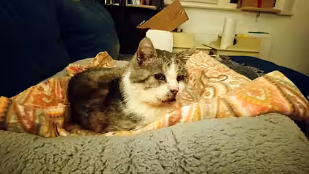 Im Dezember gab es Erleichterung Die Blutergebnisse kamen, und es wurde eine Niereninsuffizienz diagnostiziert. Ansonsten ist sein Blutbild (was für eine Erleichterung!) unauffällig. Der nette Kerl hat nach wie vor mit Schnupfen und Atembeschwerden zu kämpfen, wobei der Schnupfen besser wird. Da wir aber gesehen haben, dass es ihm im Tierheim einfach viel zu stressig ist und er doch viel Ruhe aber ebenso viel Aufmerksamkeit möchte ... wurde er von mir (Jacqueline) kurzerhand als Pflegling mitgenommen. Alle anderen Kolleginnen haben immer noch Kitten in Pflege, meine ehemaligen Pflegekitten Odin, Olena und Ottilie sind ja nun schon im Tierheim-Kindergarten und warten auf neue Dosenöffner.