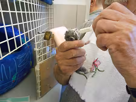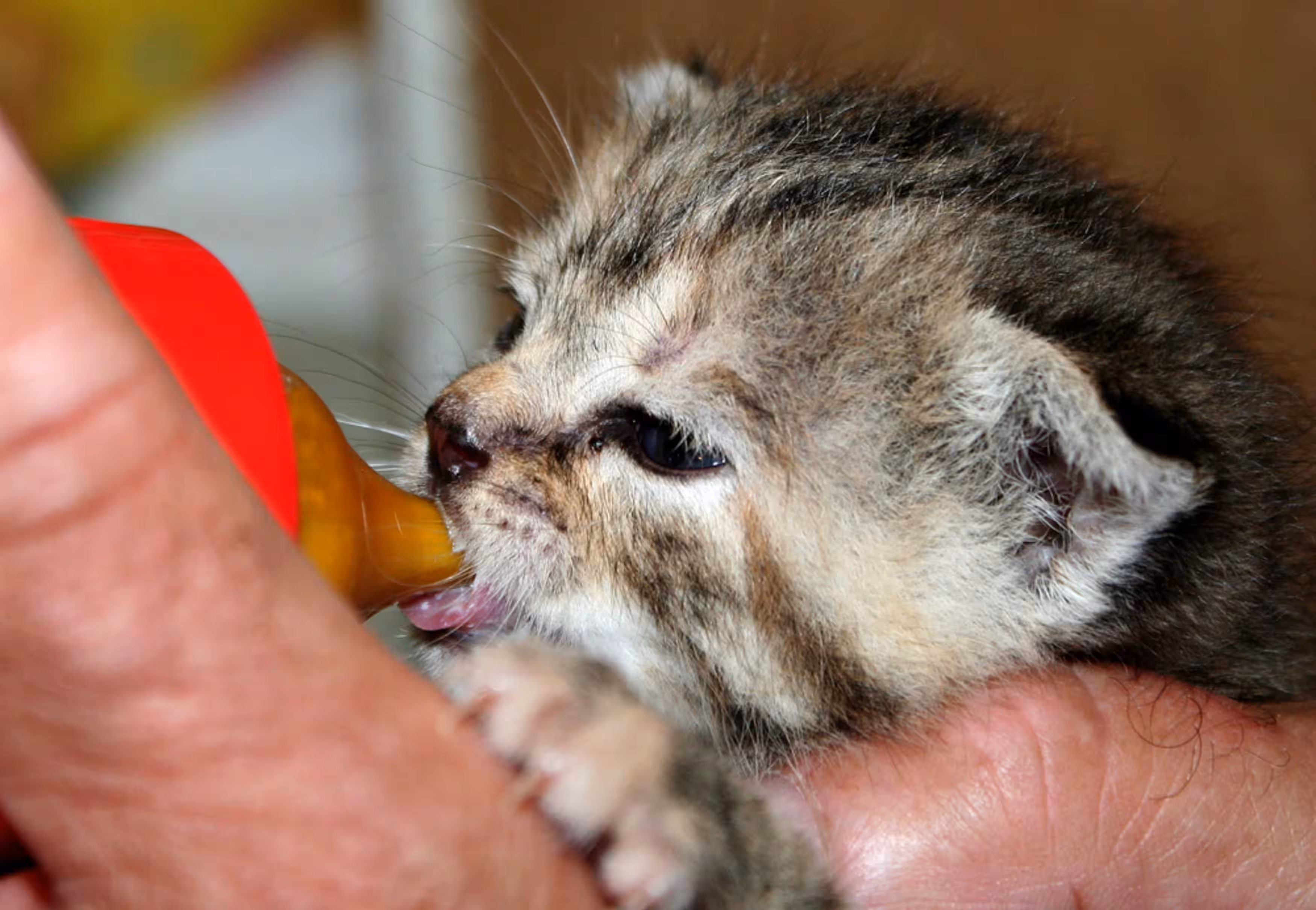 Babys ab der Geburt bis zum 14. Tag müssen alle zwei Stunden (Tag und Nacht) die Flasche bekommen. Sollten Sie Schwierigkeiten haben, den Babys die Flasche zu geben, nehmen Sie eine Einmalspritze 2ml als Ersatzflasche. Bitte nur Tröpfchenweise die Mutterersatzmilch ins Mäulchen geben, sonst besteht die Gefahr, dass Flüssigkeit durch die Luftröhre in die Lunge fließt. Das Baby könnte daran ersticken. Versuchen Sie immer wieder, mit der Flasche die Ernährung fort zusetzen. Vom 15. Tag bis zum 25. Tag alle drei Stunden, und vom 26. Tag bis zur 5. Woche alle vier Stunden. In diesem Zeitraum muss nachts zwischen 0.00 bis 6.00 Uhr nicht gefüttert werden. Ab der 5. Woche wird die Mutterersatzmilch mit gutem Nassfutter gemixt und den Babys alle vier Stunden gegeben, bis sie selbst fressen.