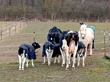 Außerdem war es heute ein besonderer Tag für unsere Vierlinge und ihre Mama Aurelia: Der Boden ist endlich weich und aufgetaut – und so konnte die kleine Familie zum ersten Mal ihren Unterstand verlassen. Sie wurden neugierig und freundlich von unseren Pferden begrüßt.