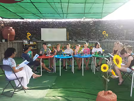 In den folgenden 14 Tagen hatten die Schülerinnen und Schüler verschiedenste Herausforderungen zu bewältigen. Nicht jede Aktivität brachte alle an ihre Grenzen, je doch waren die Unternehmungen so unterschiedlich gestaltet, dass jeder einzelne individuell herausgefordert wurde. Zu den von Familie Gonzalez geplanten und von aktion tier gesponserten Aktionen gehörten unter anderem der fast tägliche Theorieunterricht, das Zumbatraining und der Selbstverteidigungskurs, des Weiteren eine Fahrt in den Norden nach La Esperanza, um dort wie Tarzan in den Pinien zu schweben. Einige Kinder zuckten bei dem Anblick der zu bewältigenden Höhen zusammen und äußerten, dass sie sich niemals so hoch hinauf trauen würden. Nach gutem Zureden schafften dann aber doch alle den Kletterparcours und Pascal Timpen und Maxim Bahr erreichten sogar den höchsten Schwierigkeitsgrad. An einem anderen Tag ging es für die gesamte Truppe zu einem Kamel Park. Hier mussten die Schülerinnen und Schüler ihr reiterliches Können zeigen und konnten gleichzeitig das Erlernte aus dem Theorieunterricht anwenden. Der abendliche Besuch in der Burg von San Miguel sorgte für große Begeisterung. Hier konnten sie nicht nur eine Burg besichtigen, sondern die Ritter und Tiere hautnah erleben. Während der anschließenden Ritterspiele mussten sie ihr Abendessen, welches aus Suppe, Hähnchen und Kartoffeln bestand, ohne Besteck zu sich nehmen. Der krönende Abschluss dieses erlebnisreichen Tages bestand aus einer Capoeira-Show.