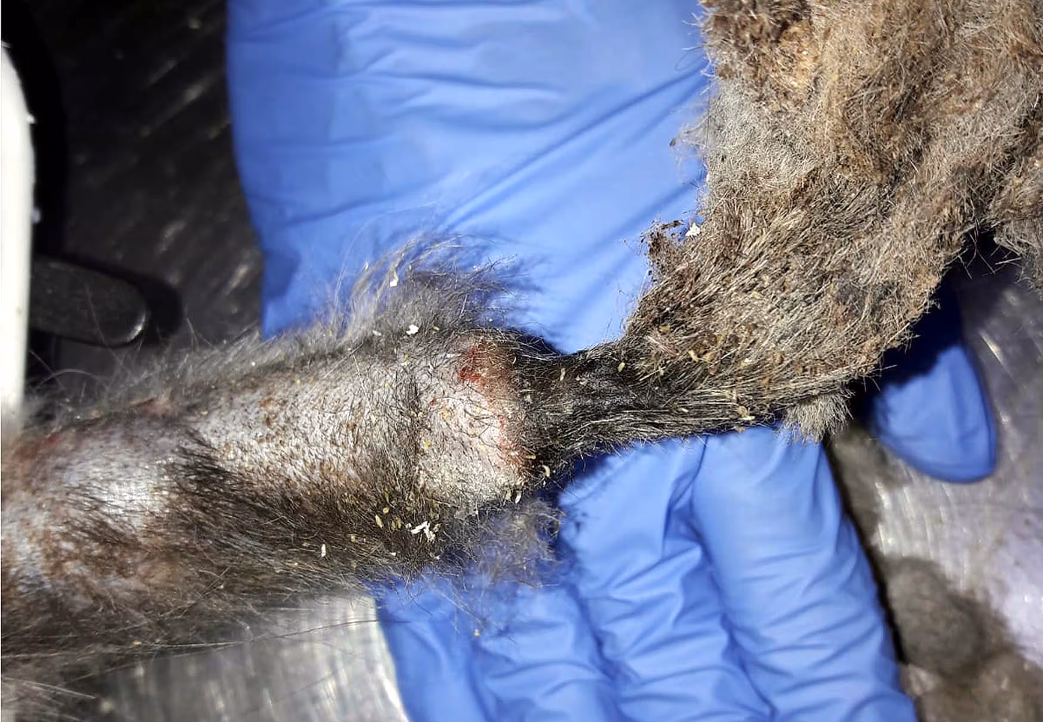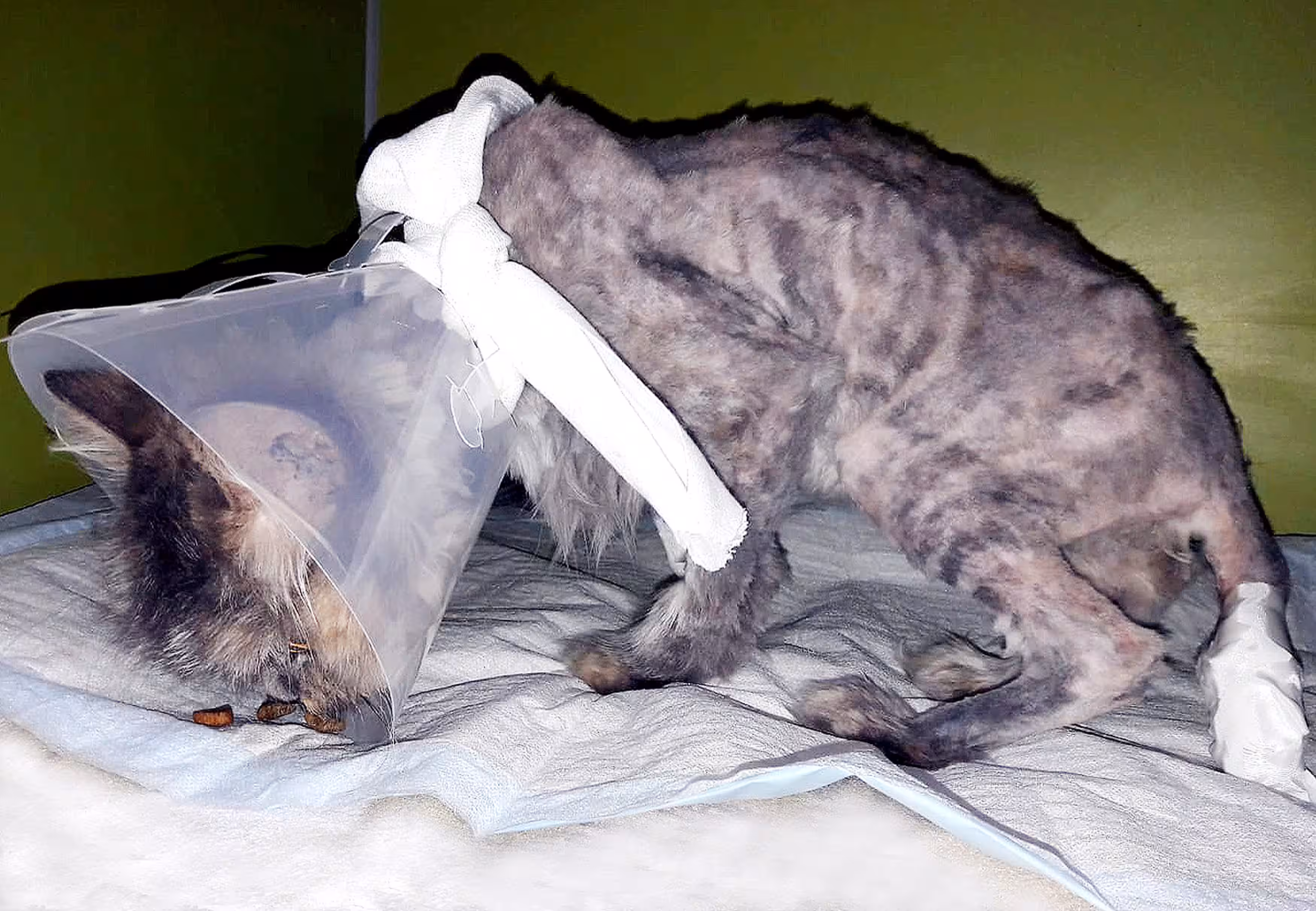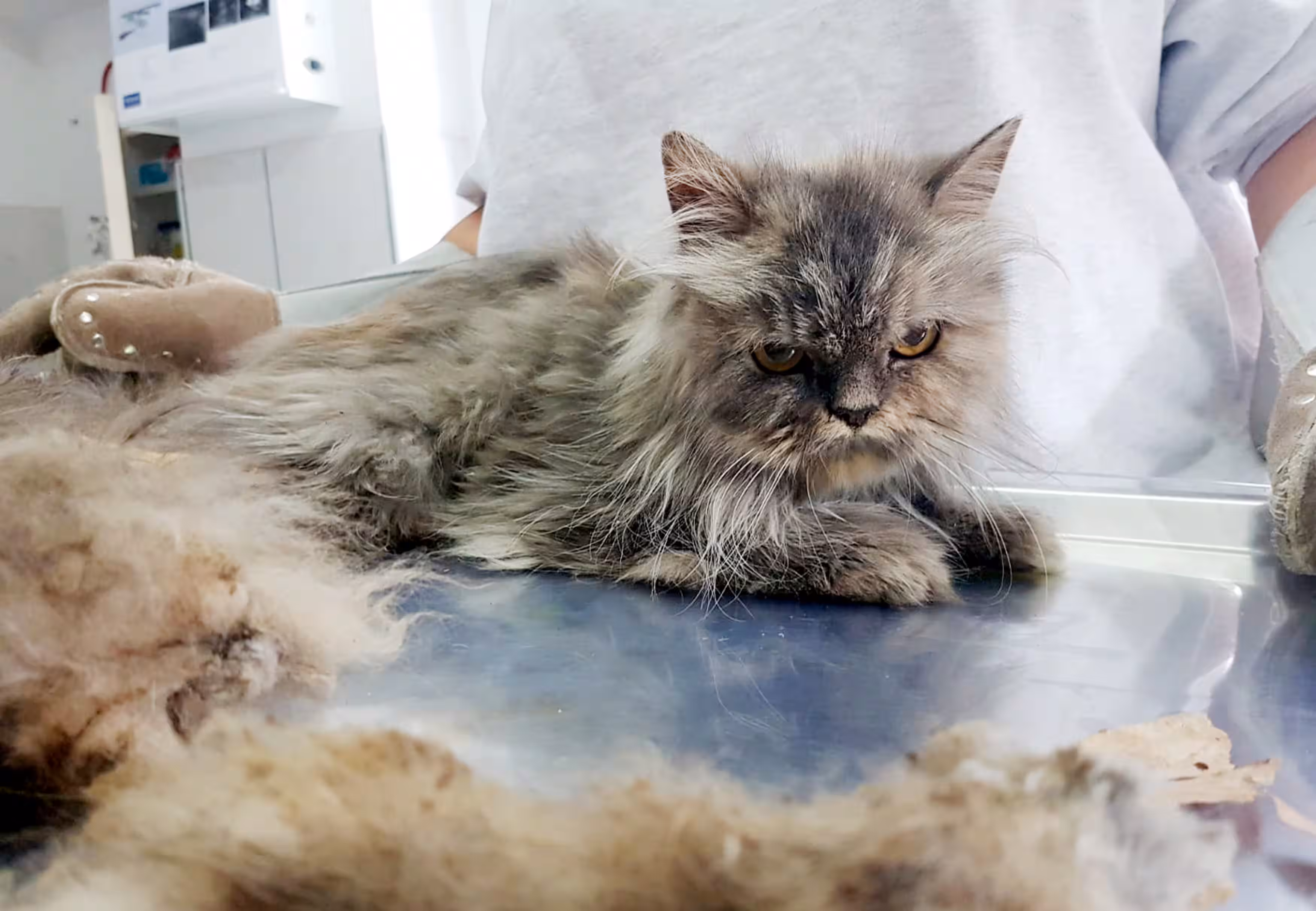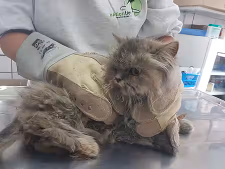 Da kein Mikrochip zur Kennzeichnung vorhanden war, wissen wir weder, wem `Puppe` gehört noch, wo sie gelebt hat oder wie es zu diesem Zaun-Unglück kommen konnte, der dem Tier beinahe das Leben gekostet hat. Jedoch magert eine Katze nicht von heute auf morgen derart ab und selbst bei Langhaarkatzen mit Freigang dauert es ein wenig, bis das Fell so stark verfilzt wie bei `Puppe`. Unser Findling muss also entweder von seinem Halter stark vernachlässigt worden sein oder bereits eine Weile draußen gelebt haben.