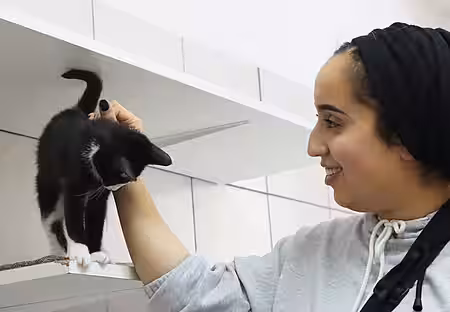 Anfang Oktober kamen Nuseyba und Rahmah von JUMA in unser Tierheim. Rahmah hat aktiv mitgeholfen, während Nuseyba eifrig gedreht hat. Die beiden jungen Frauen waren von unserer Einrichtung sehr angetan und lobten unter anderem, dass unsere Tiere so viel Platz und immer einen Auslauf haben. Nach einem Orientierungs-Rundgang wurden die Arbeiten besprochen, die in einem Tierheim täglich anstehen und Rahmah wurde schnell klar, dass Saubermachen eine zentrale Rolle spielt. Sie hat jedoch klaglos die Kothaufen in einem Hundeauslauf eingesammelt, die Toilettenecken in den Kleintiergehegen abgetragen und zwei Katzenklos gesäubert. Futter für die Kaninchen schnippeln war danach eine richtige Erholung und auch für Schmuseeinheiten mit Hunden und Katzen sowie eine längere Gassirunde mit Hündin Skuly war noch genug Zeit.