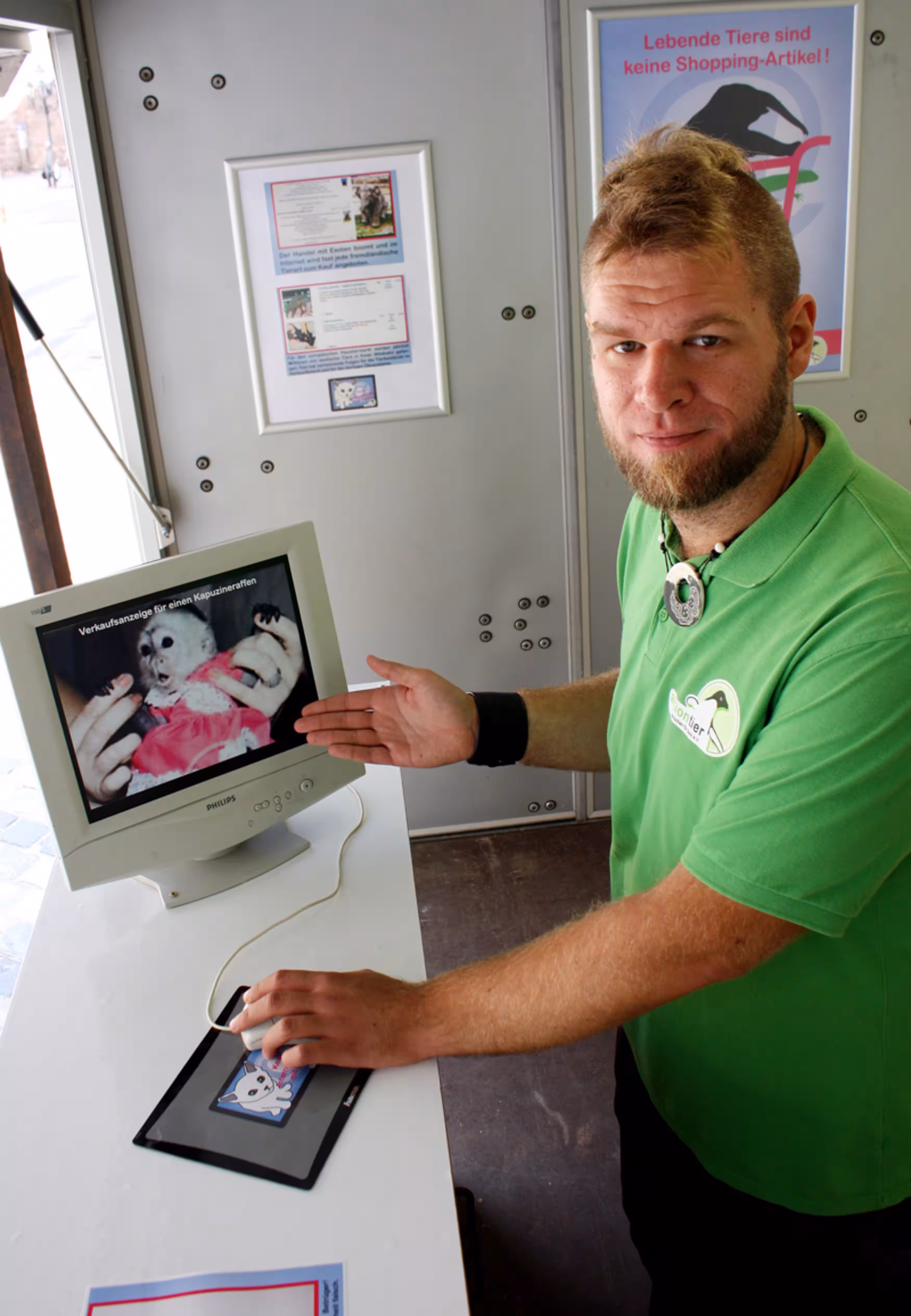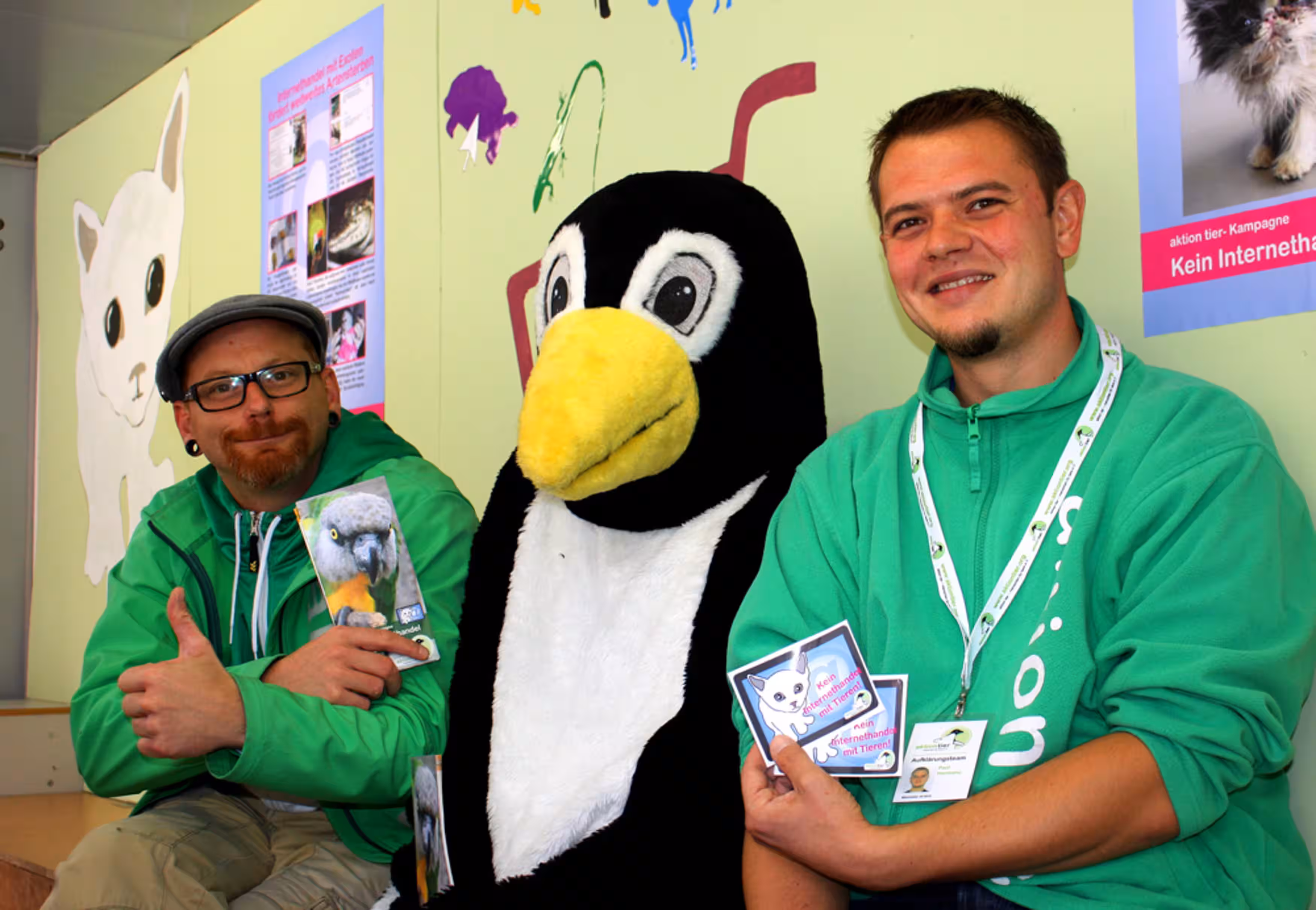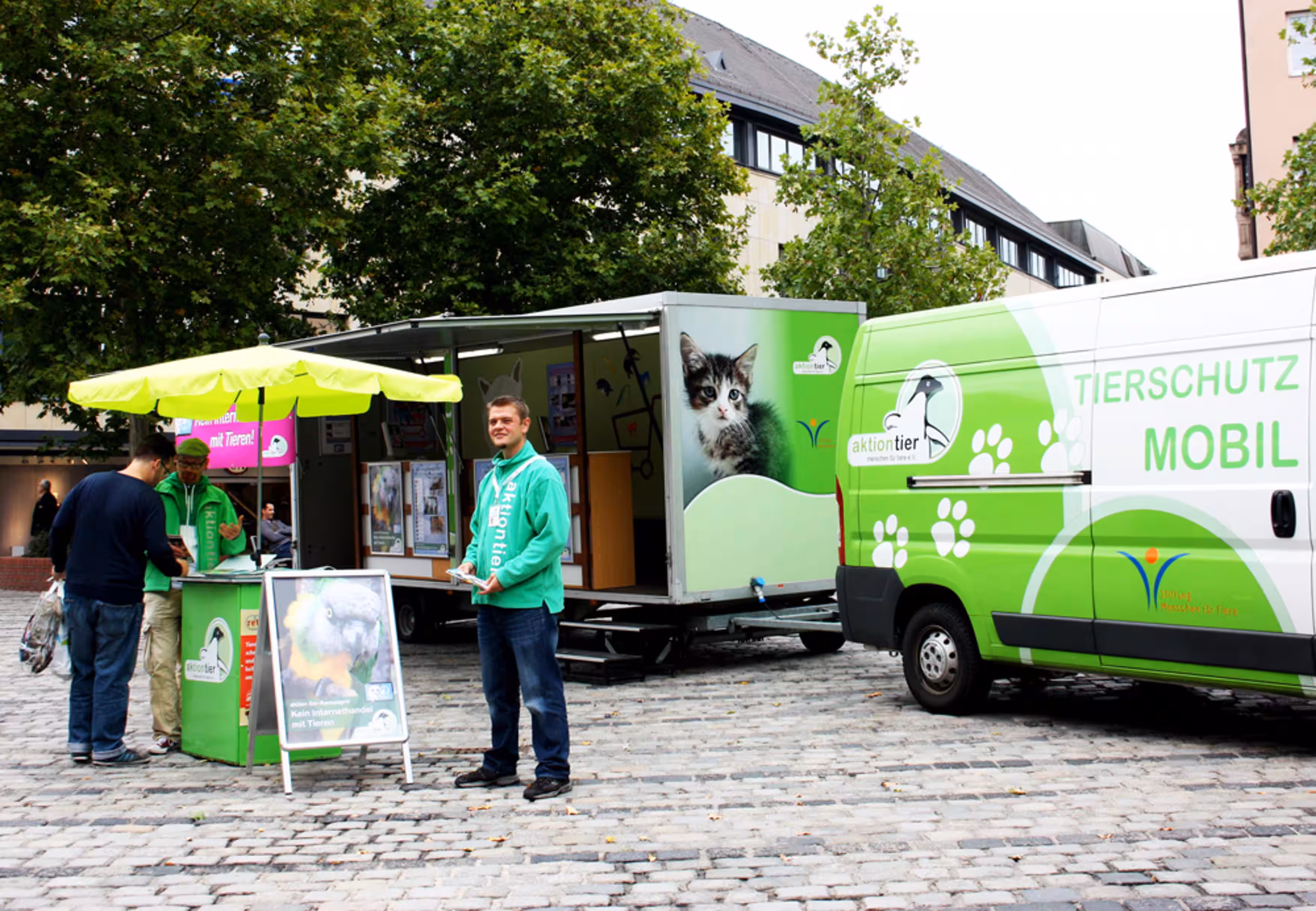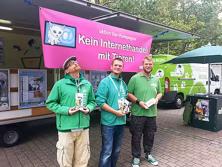 Zum Kampagnenstart herrschte reges Interesse an unserem großen aktion tier-Infostand und dem begehbaren Tierschutzanhänger, den wir passend zum Kampagnenthema gestaltet hatten. Viele Passanten sahen sich unser Hintergrundvideo an und zeigten sich entsetzt über die drohenden Gefahren beim Internethandel mit lebenden Tieren.