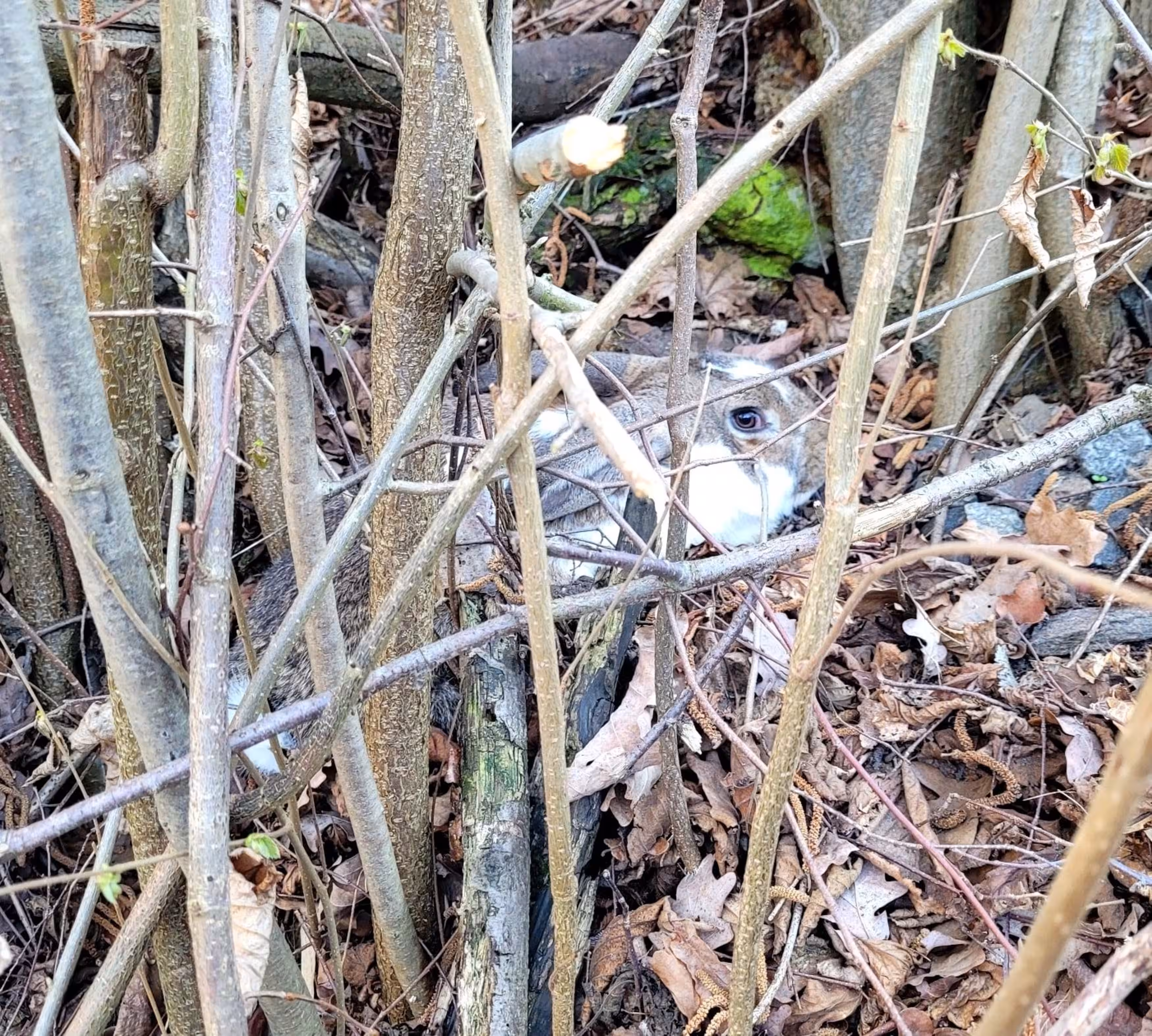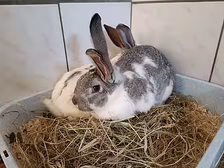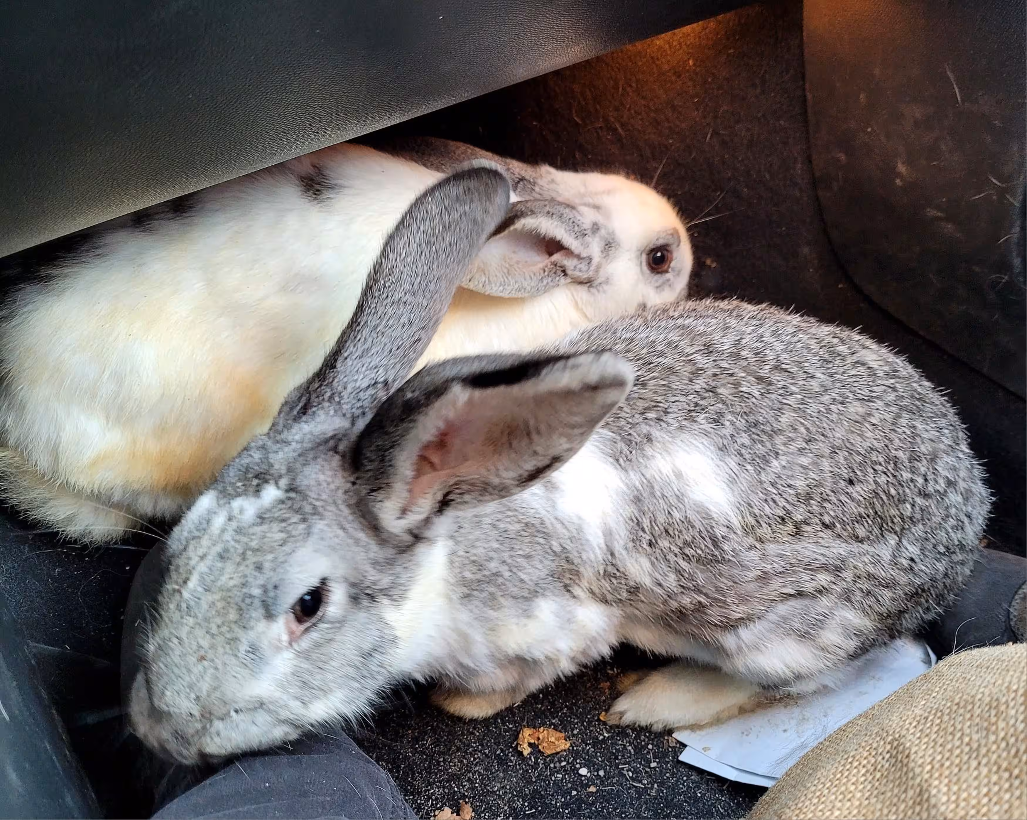 Zurückgekommen, machte sich Michaela gemeinsam mit ihrer Tochter daran, die Kaninchen langsam einzukreisen. Glücklicherweise waren die Tiere den Kontakt zu Menschen gewöhnt und deshalb nicht besonders scheu, sodass die beiden Kaninchen mit viel Ruhe und in guter Teamarbeit schnell gesichert werden konnten. Im Fußraum des Beifahrers wurden sie notdürftig untergebracht.