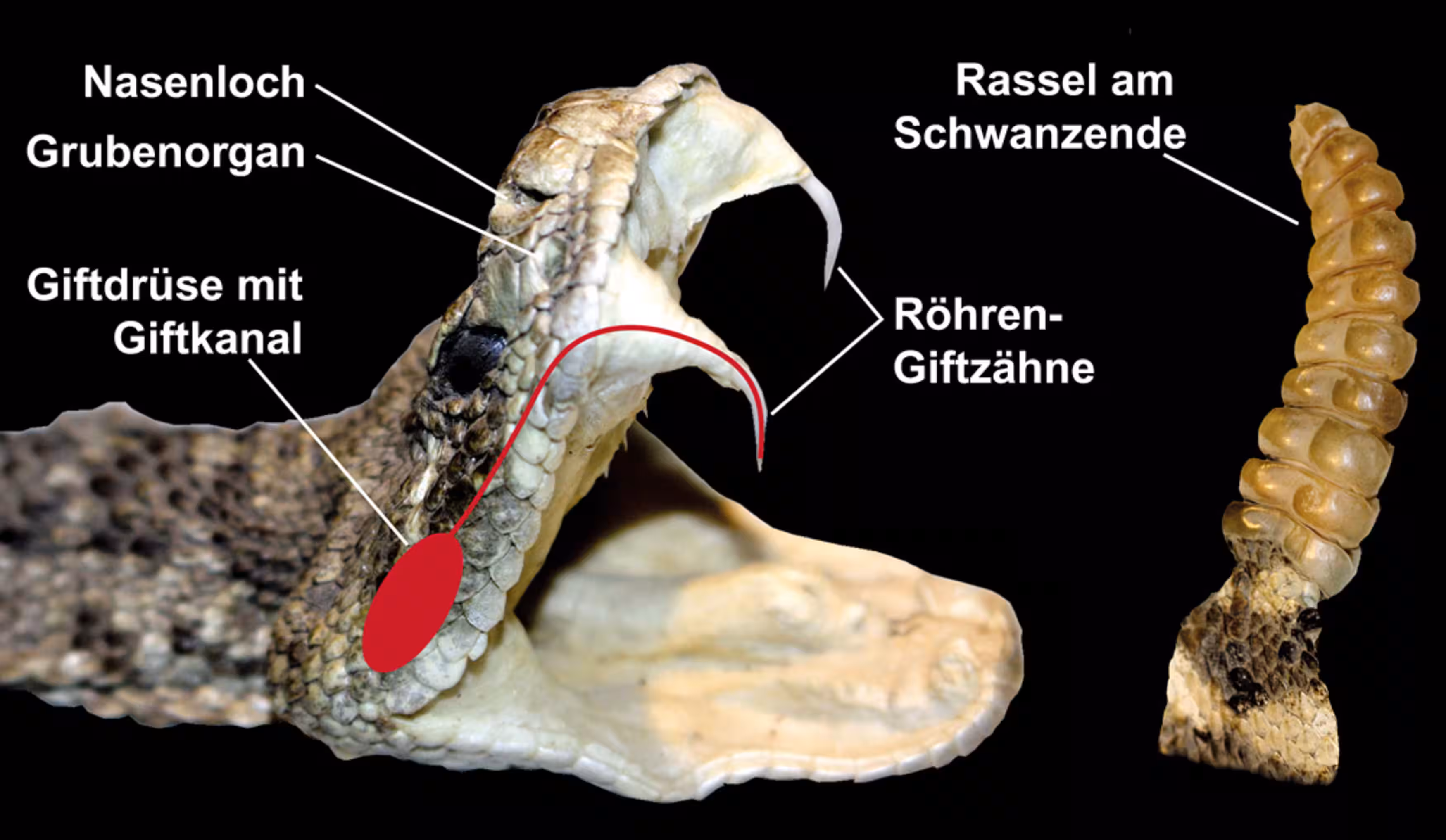 Sämtliche Klapperschlangen- Arten verfügen über einen hoch entwickelten Giftapparat, der wie die Kanüle einer Spritze funktioniert. Das in einer von Muskulatur umgebenen Drüse hinter den Augen produzierte Gift fließt beim Zubiss durch die röhrenförmigen Giftzähne und kann so von der Schlange genau dosiert und tief in die Beute oder den Gegner injiziert werden. Die beiden Giftzähne am vorderen Oberkiefer liegen normalerweise verdeckt im Mundraum eingeklappt und werden beim Öffnen des Maules dann nach vorne aufgestellt. Klapperschlangen benötigen ihr Gift zum Töten der Beutetiere und zur Vorverdauung derselben sowie zur Verteidigung gegen Feinde.