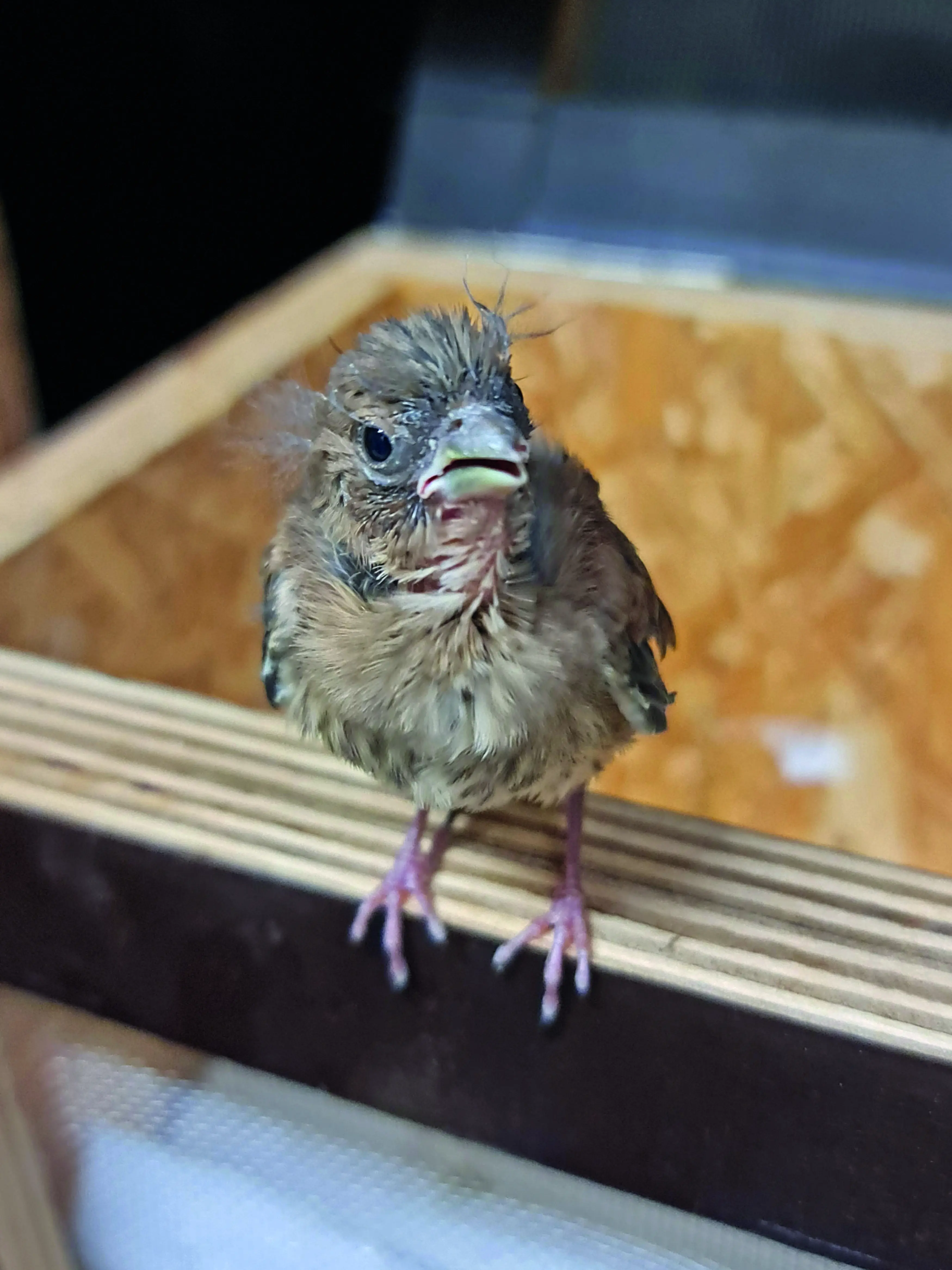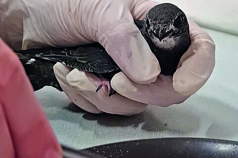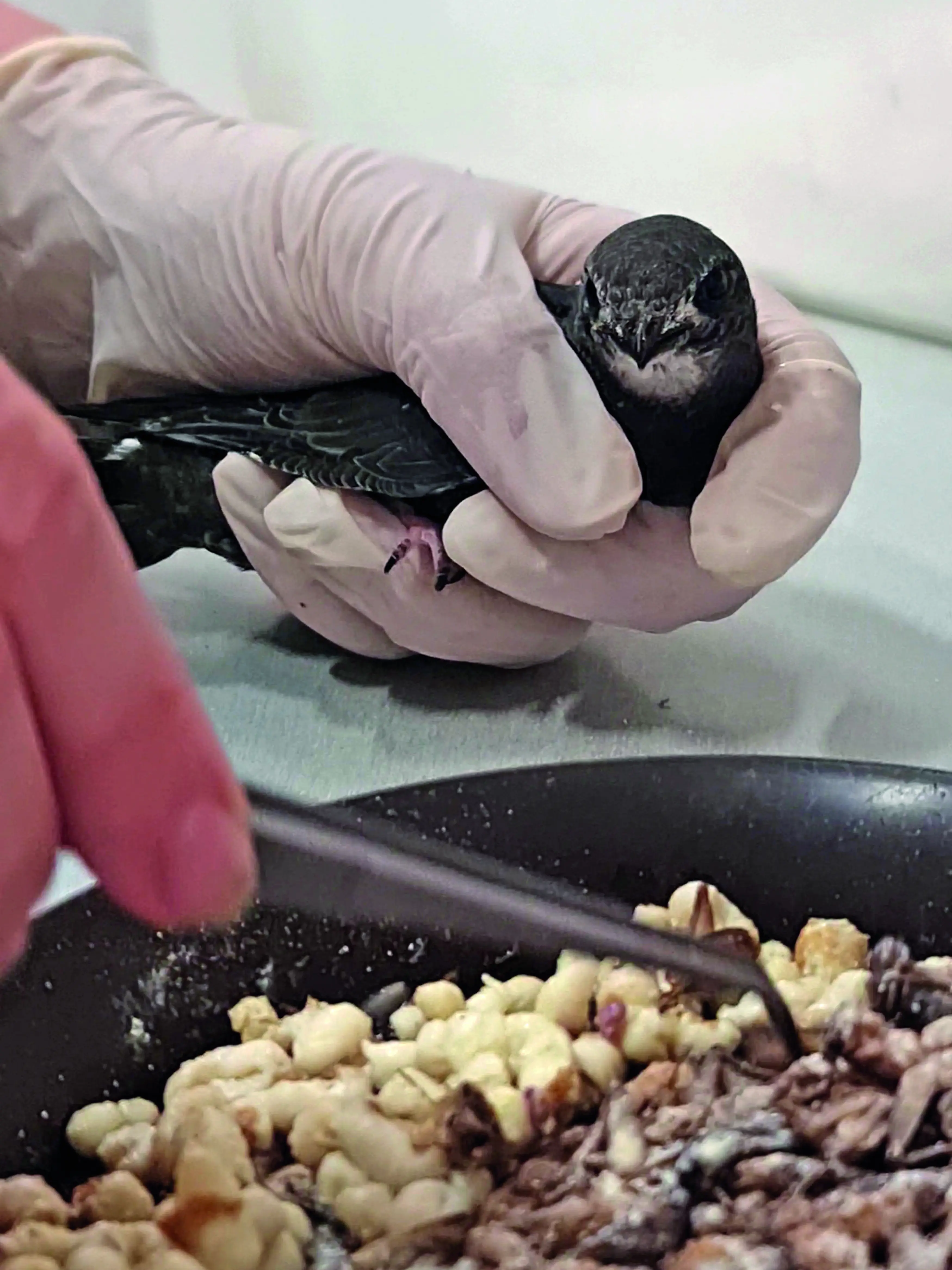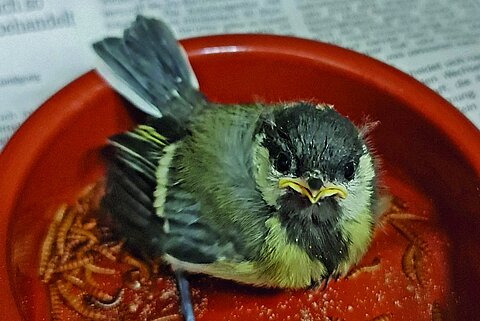 Als ich Zeit habe, mich weiter umzusehen, lockt mich lautes Vogelgezwitscher in einen weiteren Raum. Viele heimische Jungvögel werden hier aufgezogen und für ihren zweiten Start ins Leben vorbereitet. Karolin Schütte nimmt sich die Zeit, mir alle Arten vorzustellen. Unter ihnen sind auch viele Mauersegler-Jungtiere, die während der letzten heißen Sommertage aus ihrem Nest gesprungen sind. Ich lerne, dass es nur selten gelingt, sie wieder ins Nest zu setzen, da sie danach wieder die Flucht aus der Hitze ergreifen. Später werde ich auch noch bei ihrer Fütterung zusehen dürfen.