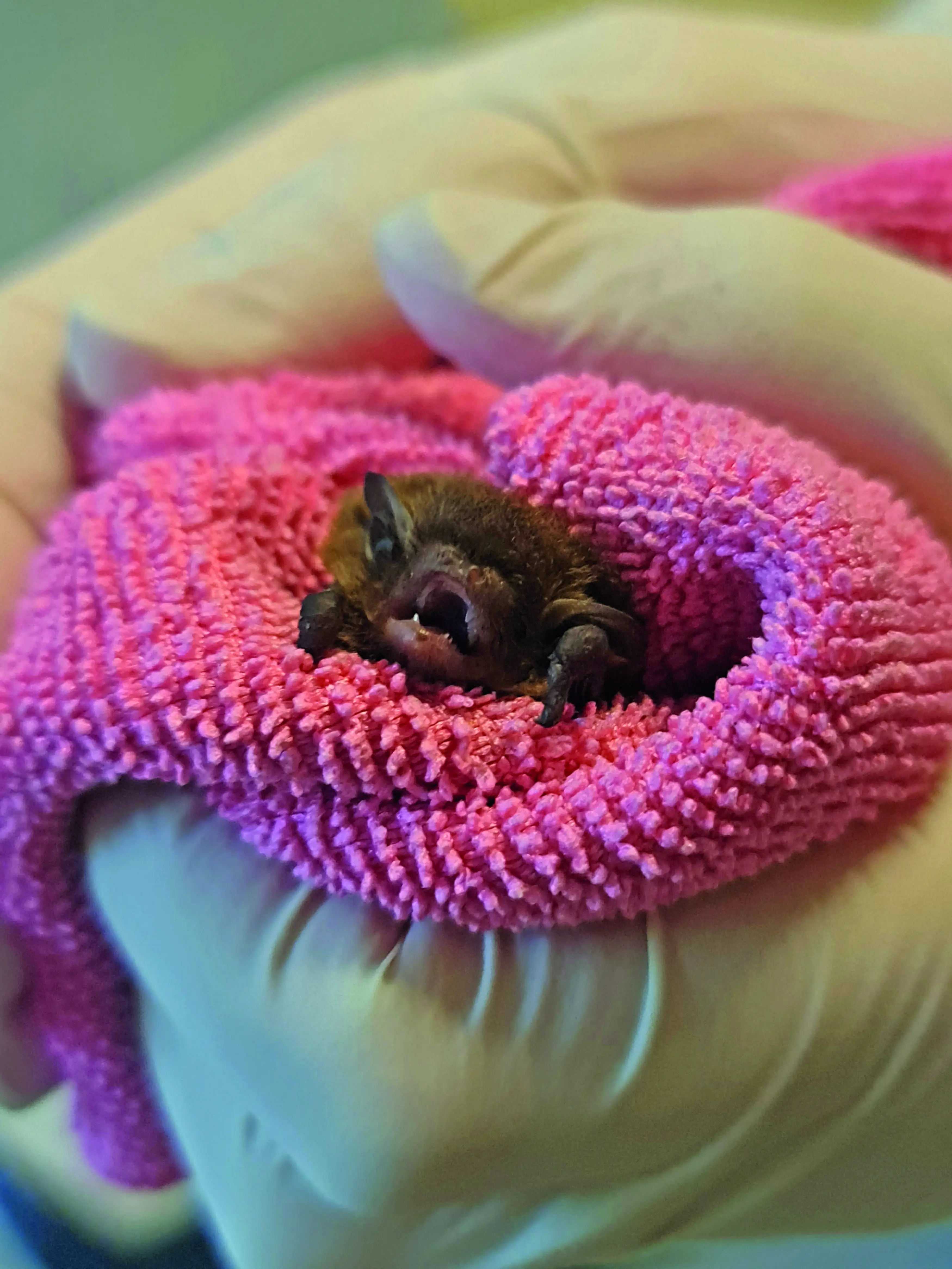 Karolin Schütte kündigt nun an, dass wir jetzt Flugtests mit zwei Fledermäusen machen werden. Sie holt nacheinander eine Mückenfledermaus und einen Kleinabendsegler aus ihren Fledermauskästen. Die Mückenfledermaus wurde mit zwei Jungtieren hier abgegeben, und die kleine Familie erholt sich gut. Ihr Flugtest verläuft gut, und lautlos fliegt sie den langen Gang zwischen den Stationszimmern hinauf, wendet und landet wieder am Ende des Gangs. Der Kleinabendsegler hat leider seine Schwierigkeiten, möchte nicht so richtig starten und landet nach ein paar Metern immer wieder auf dem Boden. Er muss noch in Behandlung bleiben.