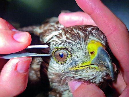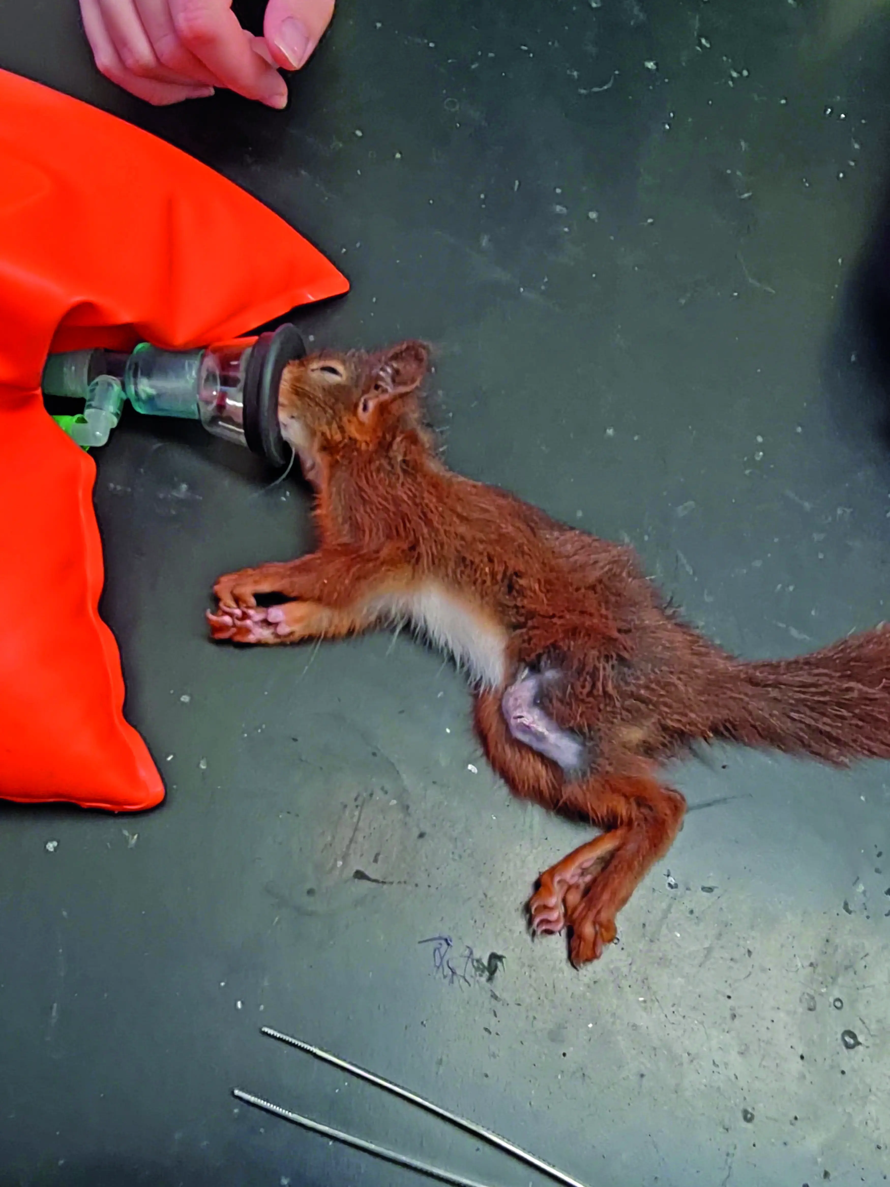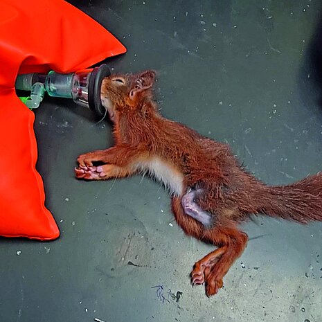 Im Anschluss widmet sich Karolin Schütte einem ganz anderen Patienten. Ein Eichhörnchen wird in einer der Außenvolieren gesichert und muss nun in den Behandlungsraum. Es wurde mit einer Verletzung am Bein eingeliefert, die bereits genäht wurde. Heute ist der Kontrolltermin – und mit etwas Glück werden die Fäden gezogen. In einer kleinen Box wird es in eine Atemnarkose gelegt. Als es schläft, wird es auf den Behandlungstisch gelegt und ihm wird eine Atemmaske angelegt, durch die es das Narkosegas weiter einatmet. So kann die Wunde in Ruhe betrachtet werden. Und tatsächlich sieht alles gut verheilt aus, und Karolin Schütte beschließt, die Fäden zu ziehen. Alles geht kurz und schmerzlos, und nach der Aufwachzeit flitzt das Eichhörnchen in seiner Voliere aus der Box.