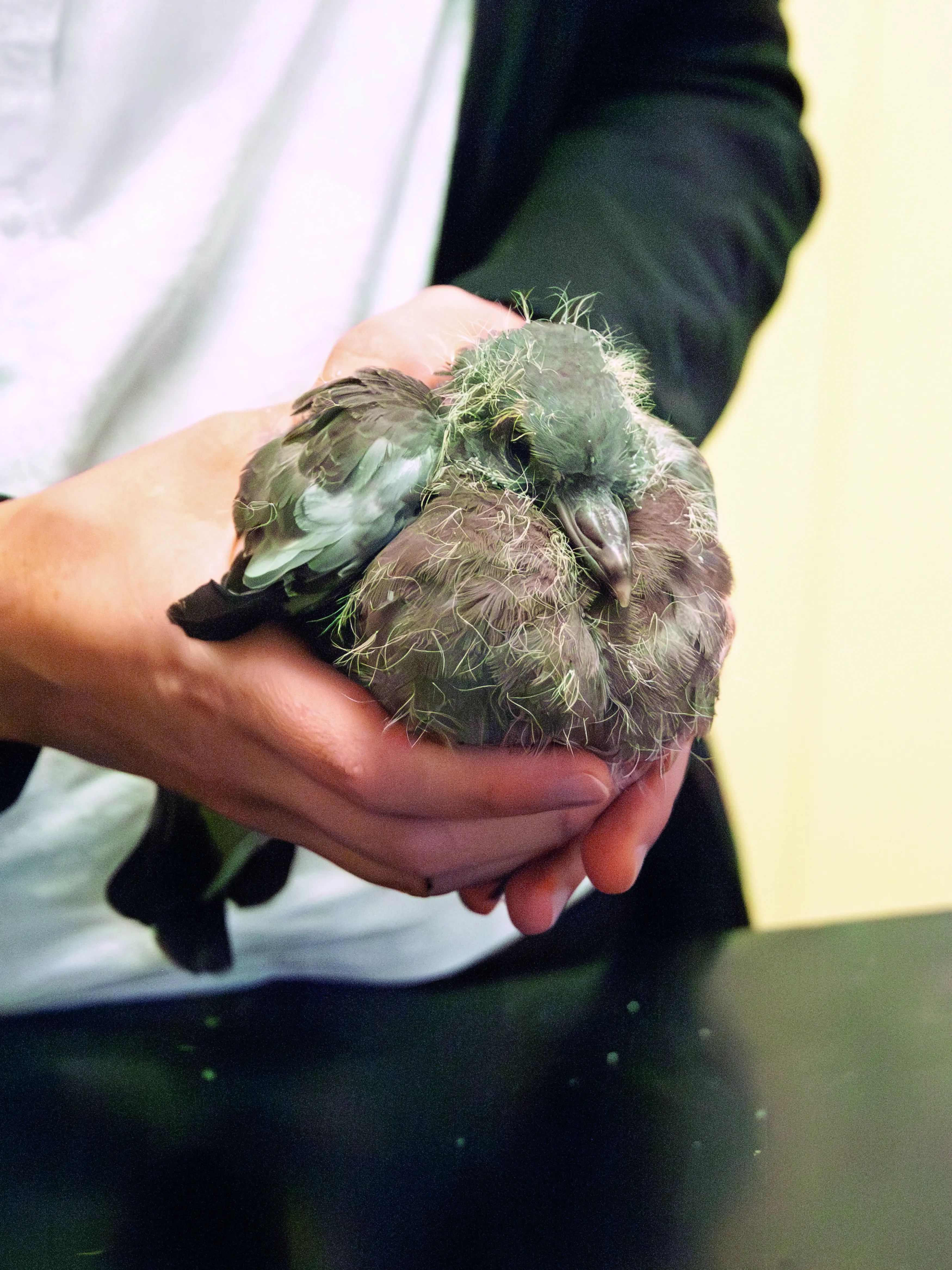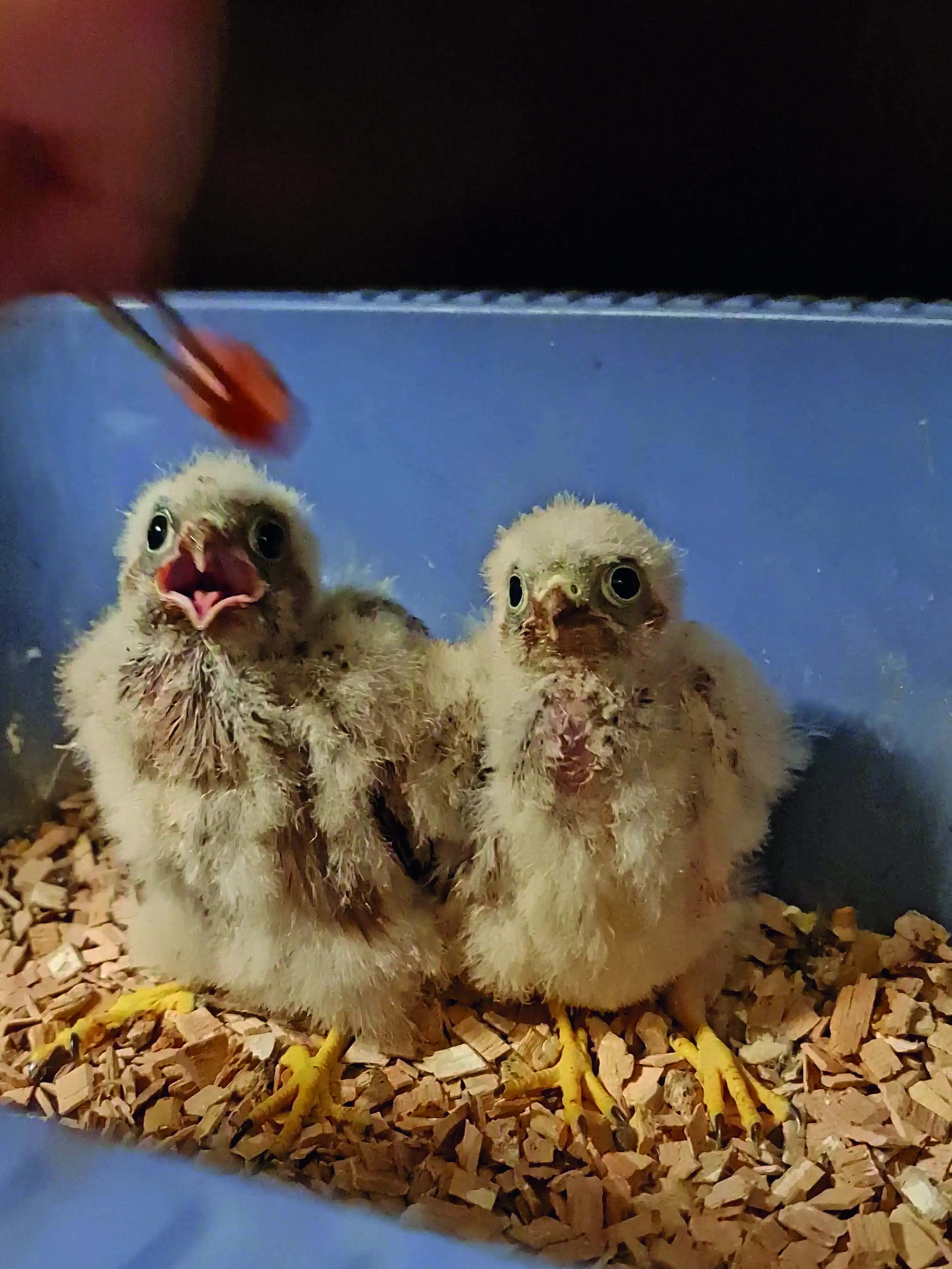 Die Turmfalkenjungen werden gefüttert – es gibt Kükengeschnetzeltes. Dieses Thema ist nicht so einfach für mich als Veganerin. Mir ist bewusst, dass viele Tiere sich von anderen Tieren ernähren. Doch ich hadere mit dem Prinzip, und irgendwie bin ich froh, dass ich das nicht entscheiden muss, denn auch die jungen Turmfalken sollen groß und stark werden. Mir wird gesagt, dass sie inzwischen kleine Knochen und Federn verdauen können. Am Anfang wurden sie noch stündlich gefüttert und nun in immer größeren Abständen. Die Tierpflegerin achtet darauf, dass jedes der Jungen seine Portion erhält, und ich bin froh, dass ich so etwas erleben darf.