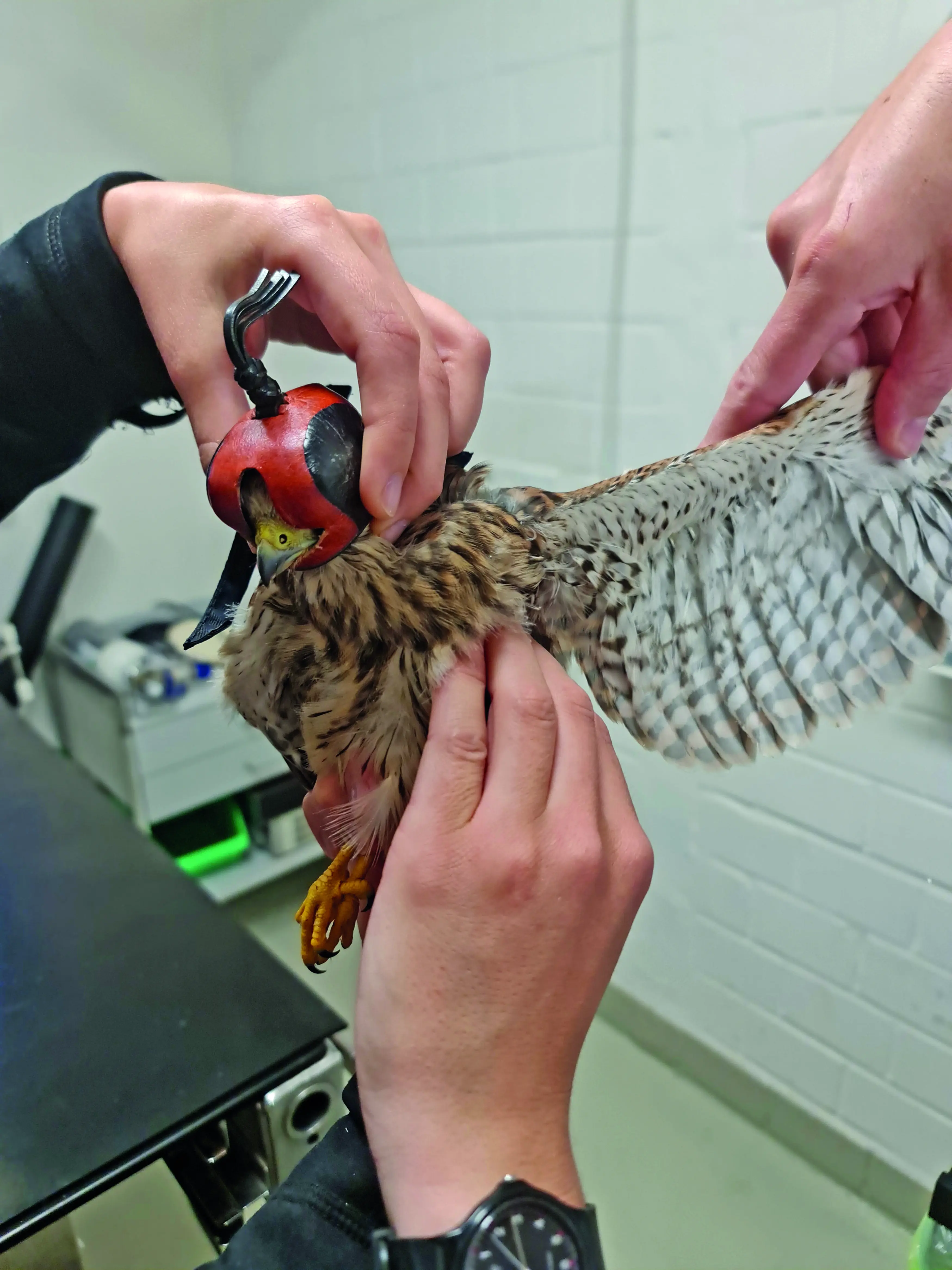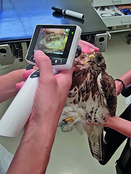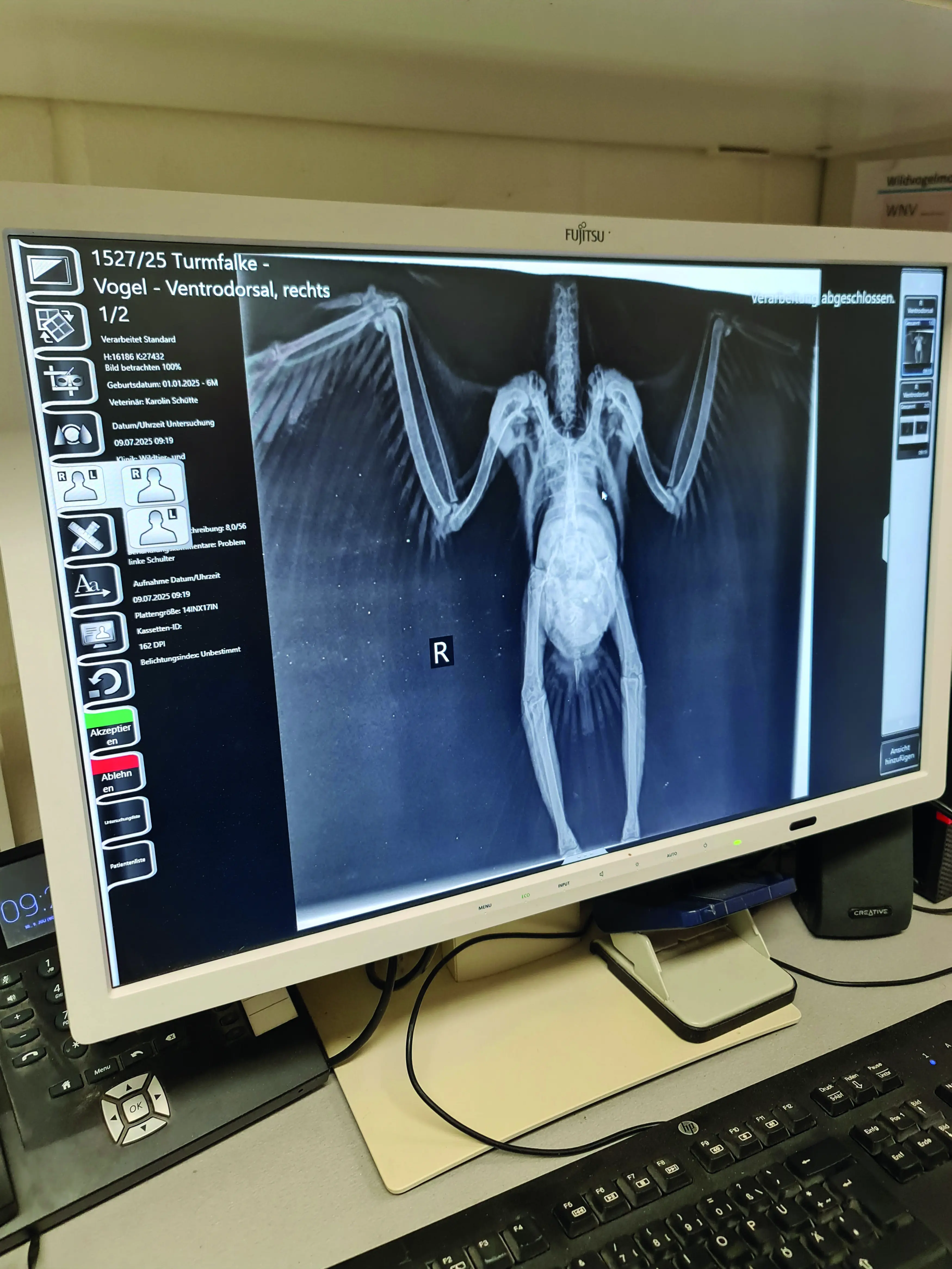 Der nächste Patient ist ein junger Turmfalke, der seinen Findern durch eine Fehlhaltung des linken Flügels aufgefallen ist. Seit ein paar Tagen war er in ihrer Nachbarschaft unterwegs gewesen, dann konnten sie ihn einfangen und zur Wildtierstation bringen. Er wird von der Tierärztin erst gründlich abgetastet, dann wird geröntgt. Auch dort zeigt sich keine Auffälligkeit. Sein Flügel wirkt unauffällig. Er erhält einige Tage Ruhe zur Beobachtung.