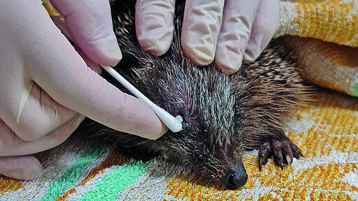 Weiter geht’s ins Igelzimmer. Hier fühle ich mich gleich so richtig heimisch. Am Tag zuvor war ein Igel mit trüben Augen abgegeben worden. Er war geschwächt, mager, leicht dehydriert und fiel eben auch durch seine trübe Augenhornhaut auf. Der Kotausstrich soll uns verraten, ob er von inneren Parasiten befallen ist. Unter dem Mikroskop findet Karolin Schütte tatsächlich Darmhaarwurmeier und Lungenwurmlarven. Er bekommt eine Entwurmung. Nachdem sie auch seine Augen genau untersucht hat, bekommt er eine Augensalbe und darf danach wieder in seine Stationsbox, um sich weiter zu erholen.