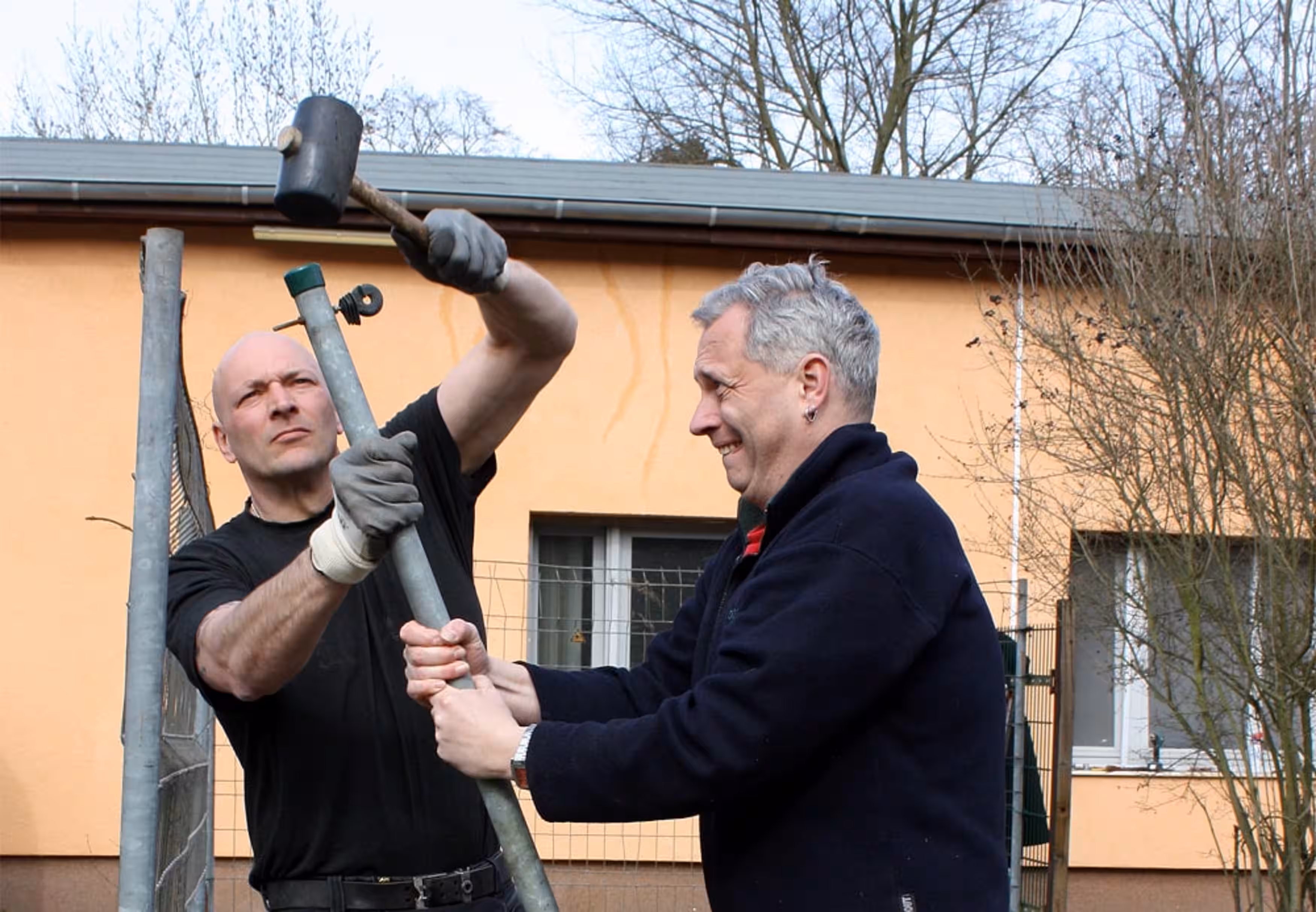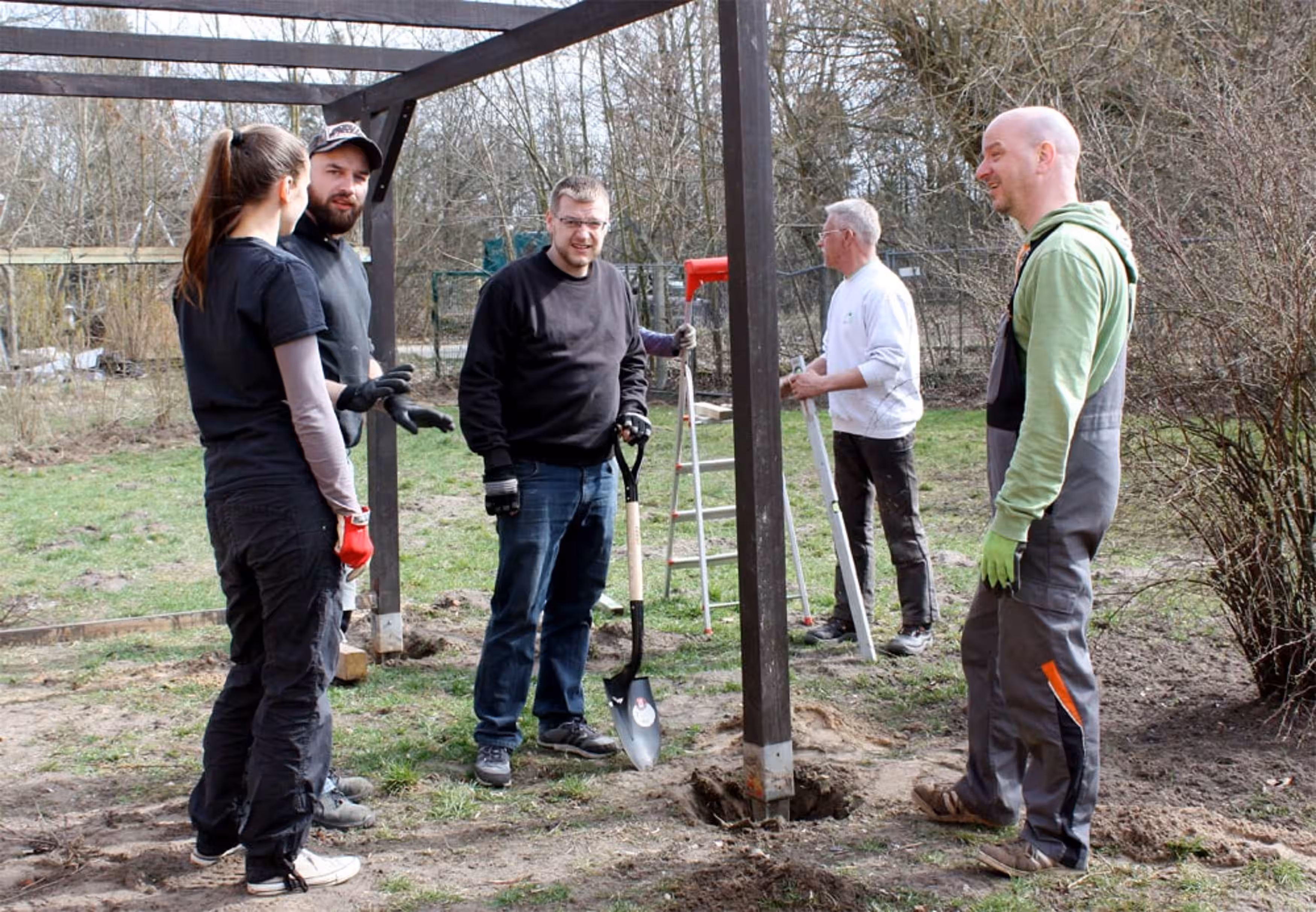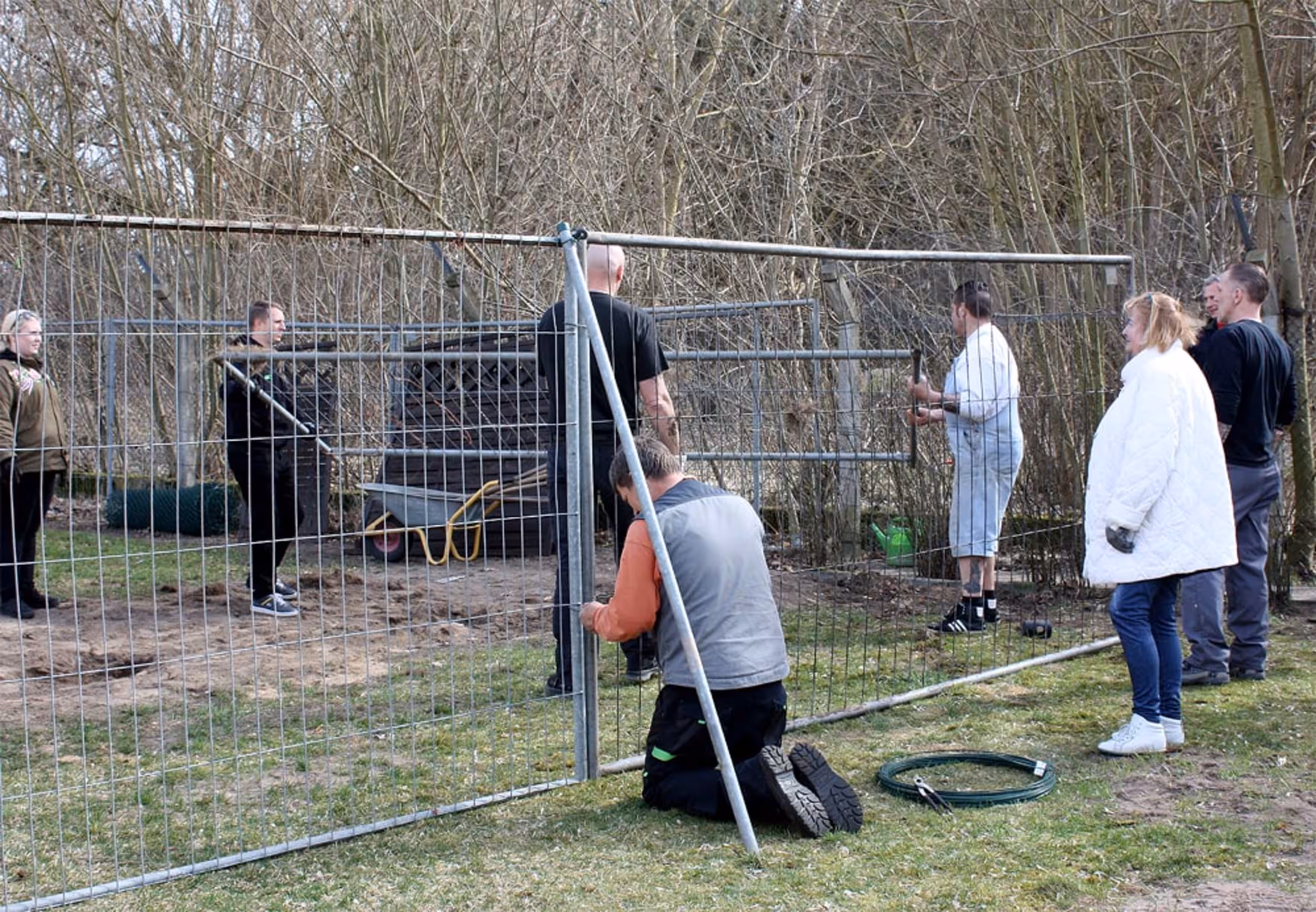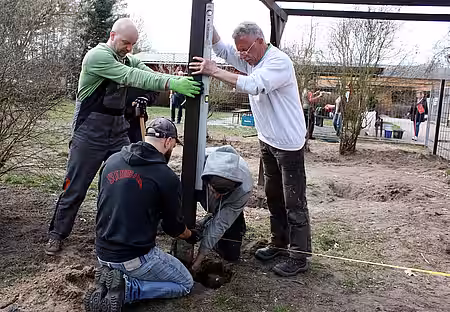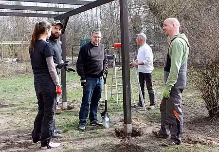 Um 11 Uhr gingen die Arbeiten los: Der alte Militärzaun wurde abgerissen, die Fläche geebnet und die Grundpfeiler für die neuen Holzhütten wurden ebenfalls befestigt. Ein ungenutzter Carport bietet hierfür das Grundgerüst. „Solche Hütten wie wir sie brauchen, gibt es so nicht zu kaufen. Den Carport auszubauen erscheint mir am sinnvollsten“, so Hausmeister Thomas Kaminski. Gedämmt, gefliest und beheizt werden das richtig tolle Unterkünfte für die Hunde.“