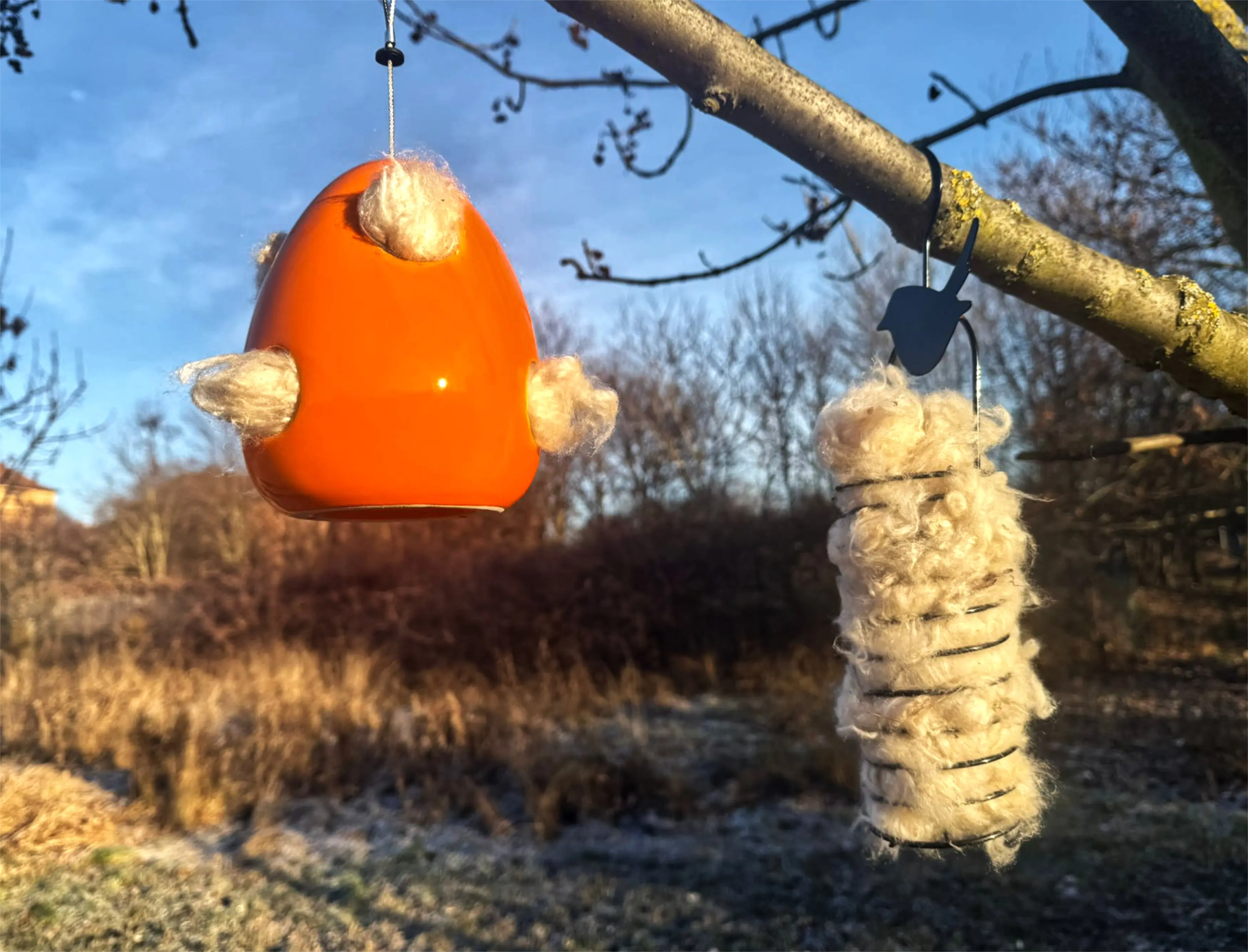 Geeignete Nistmaterialien können in einer Schale oder auf einem Tablett an einer erhöhten Stelle platziert oder in einer Astgabel befestigt werden. Alternativ eignen sich spezielle Spender oder die Halterungen für lose Futterknödel. Wichtig ist, dass der Standort katzensicher ist.