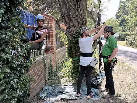 Daher hat Pia am Morgen zuerst in der aktion tier- Eichhörnchenhilfe in Teltow gedreht. Am Nachmittag trafen wir uns dann am Seil und Pia bestaunte die einfache aber wirksame Konstruktion. Für ihre jungen Zuschauer wollte sie dann gerne Beweise, dass tatsächlich Eichhhörnchen über die `Luftbrücke` rennen. Unser Seilexperte Alex Geist hatte schon verschiedene Kletterseile an dem Zielbaum angebracht, an dem auch die Wildtierkamera hängt. Diese sollte Pia holen und später den Speicherchip auf Fotos von Hörnchen durchsuchen. Die sportliche Schauspielerin stellte sich sehr geschickt an und kletterte mit Alex nach ein paar Instruktionen zügig an ihrem Seil nach oben. In etwa 9,5 m Höhe bargen die beiden Kletterer dann die Kamera und schon ging es wieder nach unter. Pia war sehr gespannt und tatsächlich fand sie schon beim schnellen Durchsehen der Kamerabilder mehrere Fotos von Eichhörnchen in Aktion.