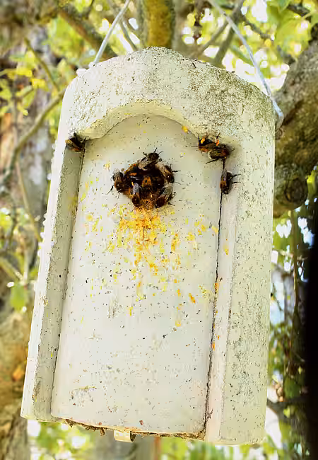 Hummeln sind zwar hübsch und nützlich, aber auch Vögel sind auf Nistkästen angewiesen, da natürliche Brutstätten wie Baumhöhlen selten geworden sind. Um beiden Tierarten gerecht zu werden, können einfach mehr und am besten unterschiedlich große Vogelkästen aufgehängt werden. Für die Hummeln kann man an einer Nisthilfe das Einflugloch auf ca. 2 cm Durchmesser verkleinern. Das mögen die Insekten gerne, und es geht ganz leicht zum Beispiel mit einer Metallblende mit Loch. Wer ein spezielles Hummelhaus möchte, kann dieses entweder selbst bauen oder fertig kaufen. Im Handel gibt es viele verschiedene Modelle – sowohl für unterirdisch als auch oberirdisch nistende Arten.