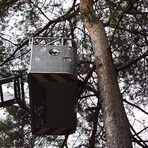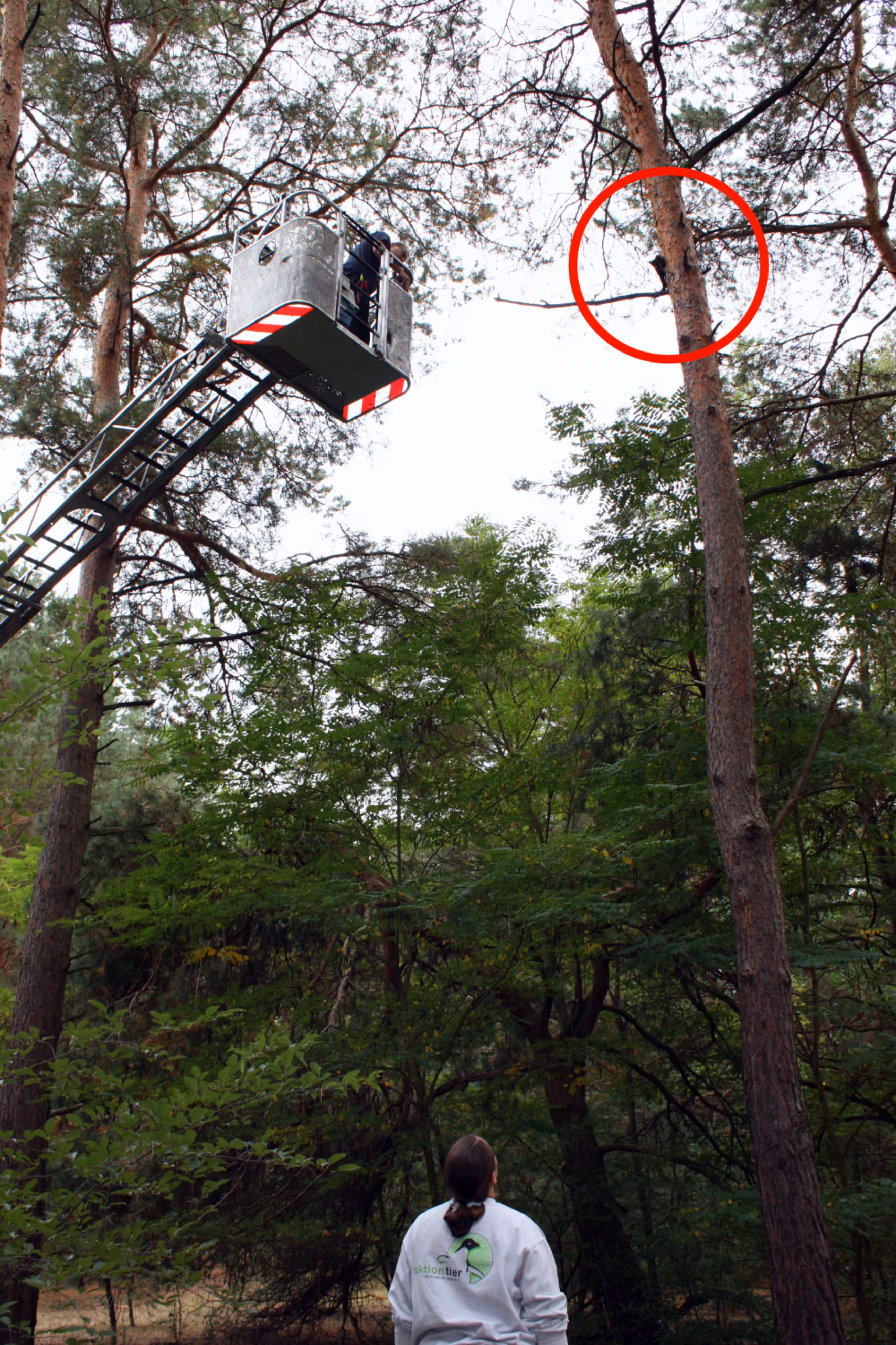 Er alarmierte unsere Mitarbeiter, die sich umgehend ein Bild von Lage machten und versuchten, mit Hilfe einer Leiter und eines Keschers, die beiden Zwerge aus ihrer misslichen Lage zu befreien. Leider saßen die beiden so weit oben, dass ein Herankommen nicht möglich war. Es war klar, dass Unterstützung her musste, und so riefen wir bei der Freiwilligen Feuerwehr Wünsdorf an. Diese fackelte nicht lange und schickte uns zwei Männer mit Leiterwagen vorbei, um die beiden unfreiwilligen Äffchen von den Bäumen zu holen. Leicht war es für die Kollegen der Feuerwehr nicht mit dem schweren Gerät im Wald zu rangieren. Trotzdem gelang es den Männern schnell den Wagen in Position zu bringen, und trotz des Lärms blieben beide Kätzchen auf ihren Ästen sitzen.