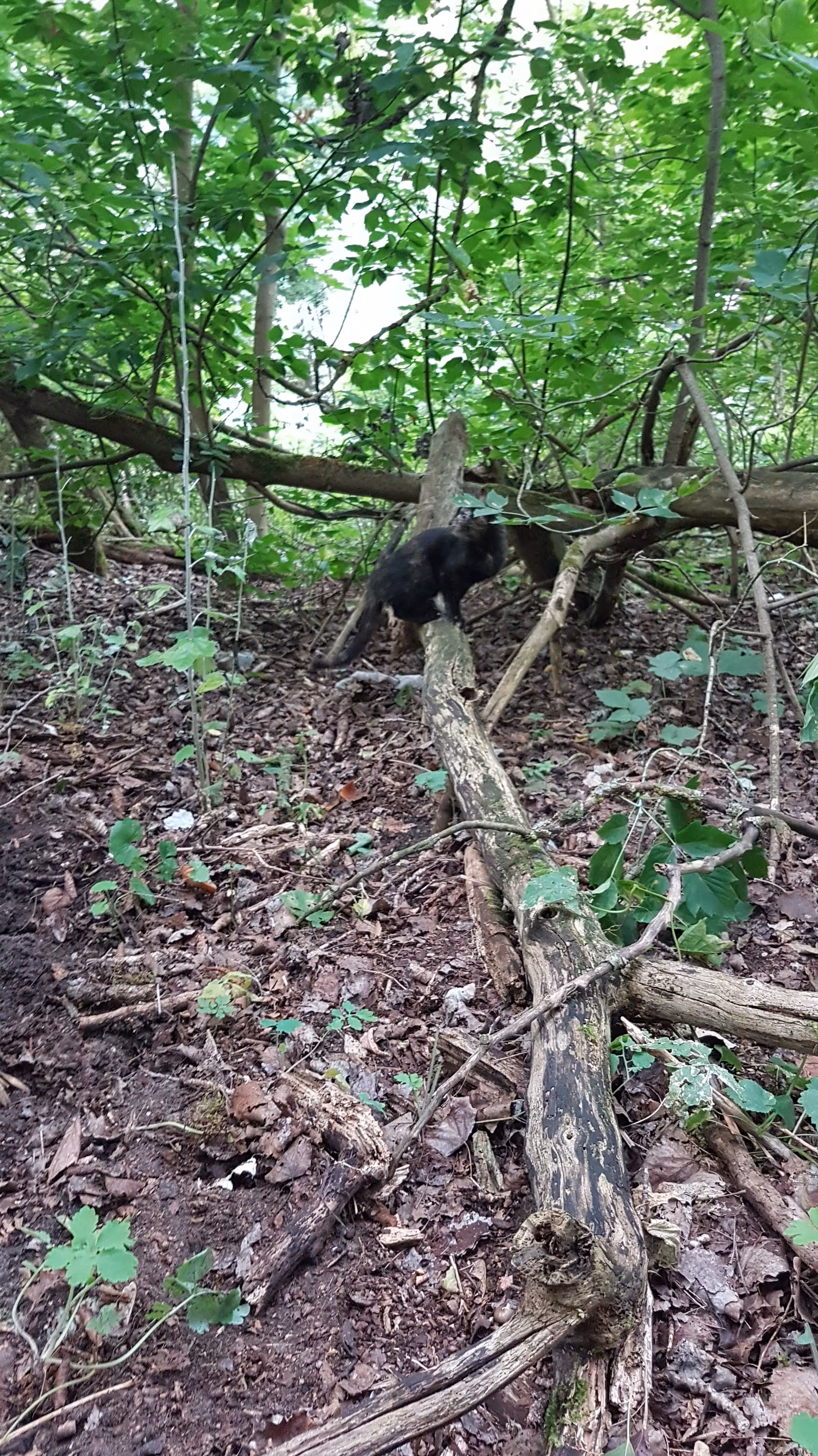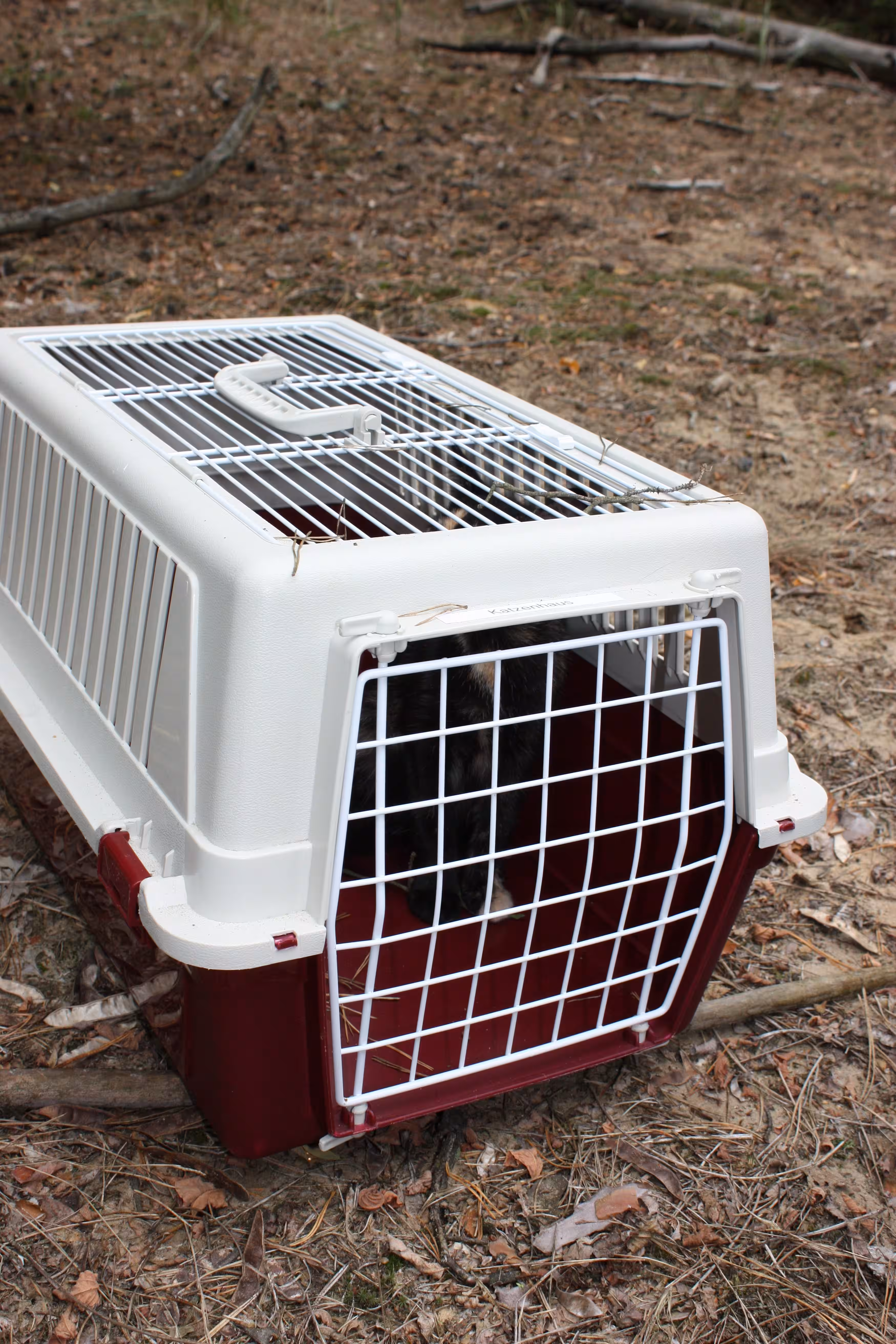 Der erste kleine Pechvogel war schnell befreit und sicher in der Transportbox verstaut. Beim zweiten Kätzchen musste sich der Feuerwehrmann schon ziemlich lang machen, aber durch das gute Zureden aller Beteiligten, traute sich auch diese kleine Maus in die Richtung der rettenden Hände. Leider läuft solch eine Rettungsaktion nicht immer nach Plan, und so erschrak sich das Kätzchen vor einem Geräusch, sprang in die Tiefe und flüchtete in den Wald. Wir nahmen zwar umgehend die Verfolgung auf, allerdings verkroch sie sich im Dickicht, sodass wir sie nicht fanden. Darum beschlossen wir am nächsten Tag, nachdem sich der Trubel gelegt würde, erneut nach ihr Ausschau zu halten. Wir brachten unsere gerettete Katze erst einmal in die Sicherheit des Tierheims.