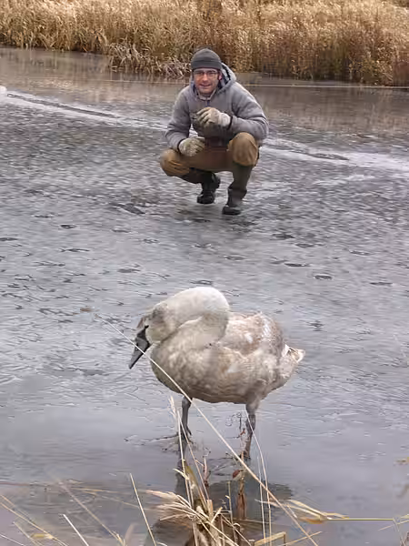 Nach ein paar Tagen im warmen Katzenzimmer erholte er sich schnell. Die Wärme und gutes Futter (eingeweichte Haferflocken, Getreide...) brachten ihn schnell wieder auf die Beine. Nach 5 Tagen beschlossen wir, ihn zu unseren Gänsen ins Gehege zu setzen. Unsere Gänse waren zwar nicht sehr erbaut von dem Neuankömmling, aber Schwan und Gänse gingen sich aus dem Weg. Die Nacht verbrachte er getrennt von den Gänsen in der Blockhütte bei den „Teichpiraten“ (so heißt unser Gänsegehege), und am nächsten Tag startete er über den gefrorenen Teich und flog los.