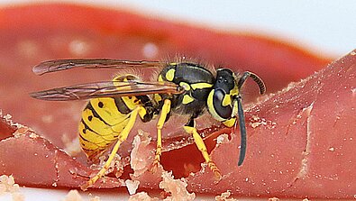 Von den etwa 700 in Deutschland vorkommenden Wespenarten sind nur die Arten Deutsche Wespe (Vespula germanica) und Gemeine Wespe (Vespula vulgaris) an unseren Lebensmitteln interessiert. Auf der Suche nach Nahrung lecken sie gerne an Süßem oder knabbern an Grillfleisch und Wurst. Die übrigen Spezies interessieren sich meist weder für Menschen noch für Nahrungsmittel.