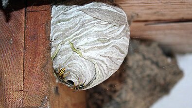 Oft gibt es sogar recht einfach umsetzbare Möglichkeiten, sich zu schützen und das Nest am Standort zu erhalten. Zum Beispiel, indem man eine mobile Stellwand oder ein breites Brett mit etwas Abstand vor den Nestausgang stellt, damit die Wespen beim Ausflug nach oben umgeleitet werden und nicht mehr automatisch zum Beispiel über den Hauseingang oder den Balkon fliegen. Wespen, deren Nester sich im Zwischenraum beispielsweise eines Terrassenbodens befinden, haben in der Regel Ausflugmöglichkeiten. Hier kann mit einer Plane der Boden oben abgedeckt werden, so dass diese Richtung verwehrt und der Bereich wieder gefahrlos nutzbar ist.