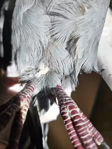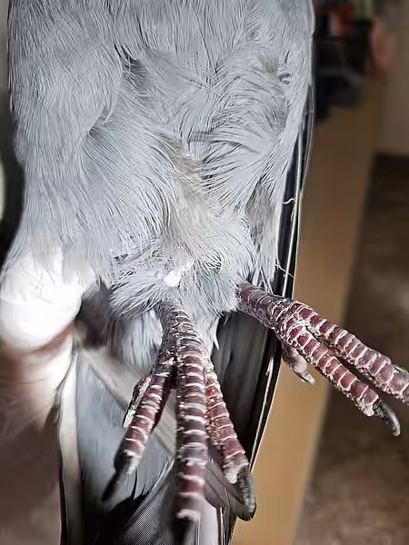 Was jedoch auffällig war, waren deutlich dunkelrot bis blau verfärbte Ständer (= Füße). Bei genauerer Betrachtung fiel eine weiße Schnur unter den Federn auf. Dieses sorgte dafür, dass die Beine der Taube überkreuzt, sehr eng aneinandergebunden waren. Es kommt immer wieder vor, dass Schnüre, Haare oder ähnliches sich um die Taubenbeine wickeln und Einschnürungen verursachen. Dies sind meistens jedoch sehr dünne lange Schnüre, die sich mehrfach kreuz und quer um die Beine und Zehen wickeln.