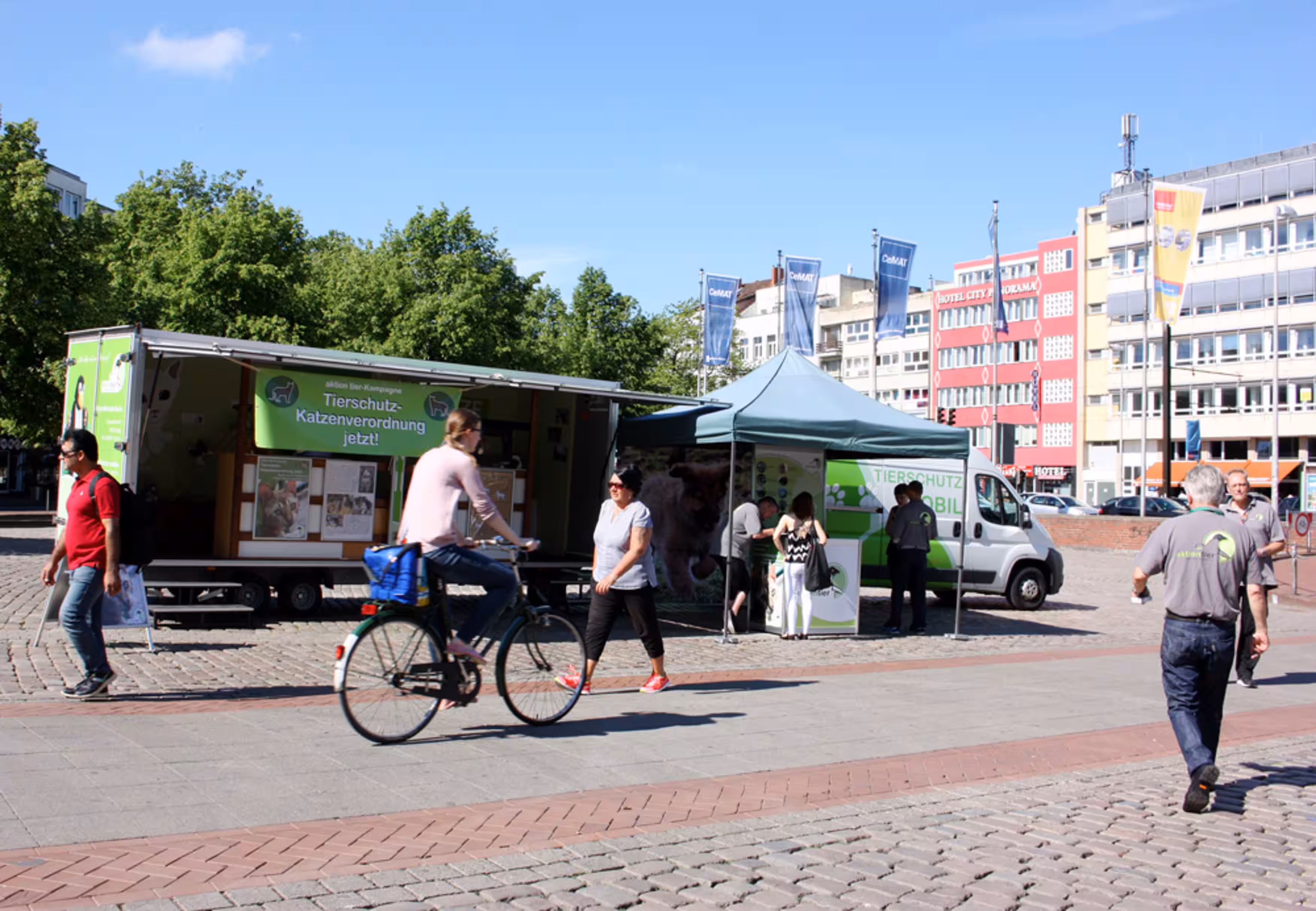 Zwischen dem 31. Mai 2016 und dem 3. Juni 2016 startet unsere Kampagne "Tierschutz-Katzenverordnung jetzt" bundesweit in verschiedenen Städten. In Hannover waren wir am letzten Maitag mit unserem großen Tierschutzanhänger vor Ort und konnten Interessierten hier unser Thema besonders anschaulich näherbringen.