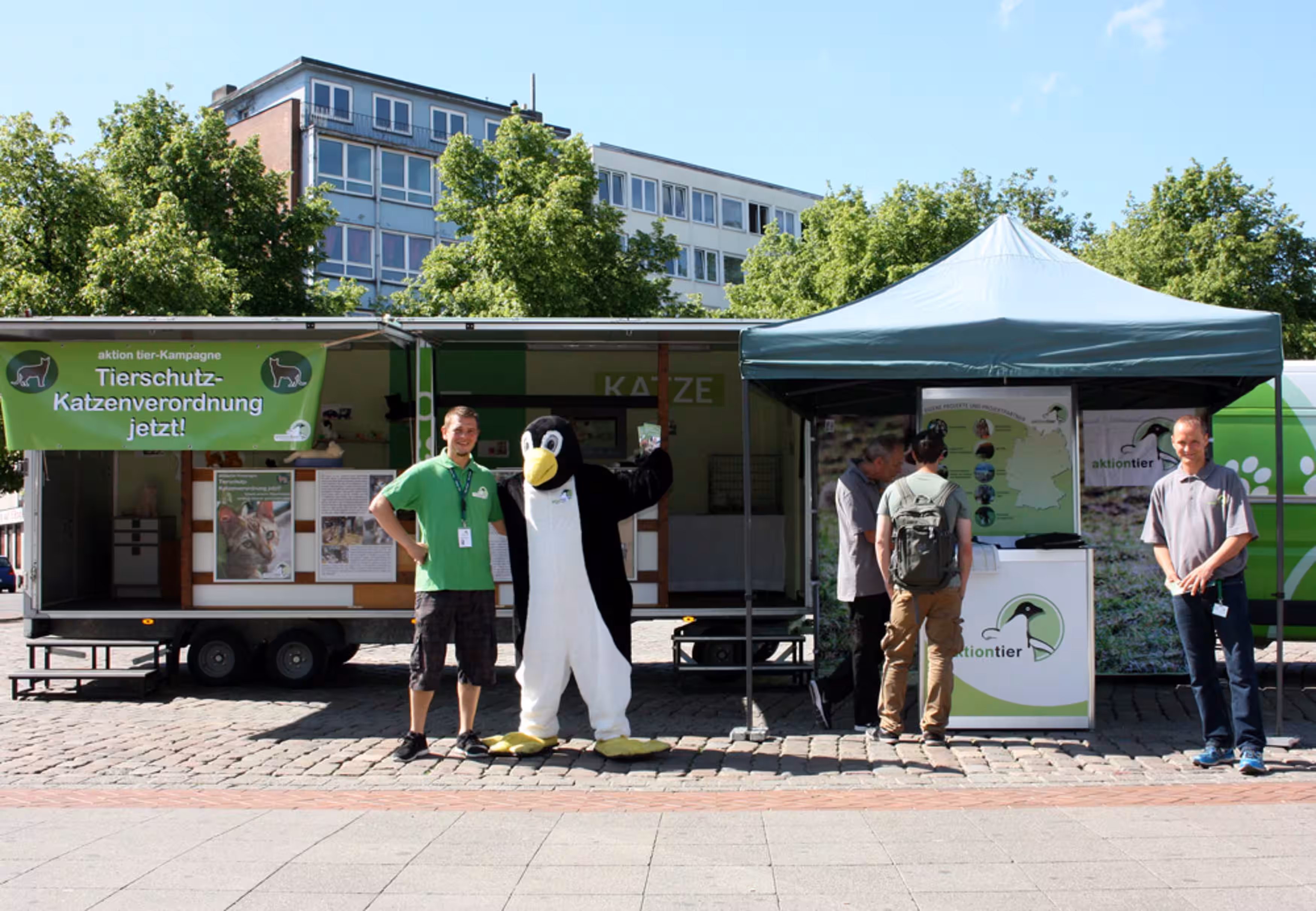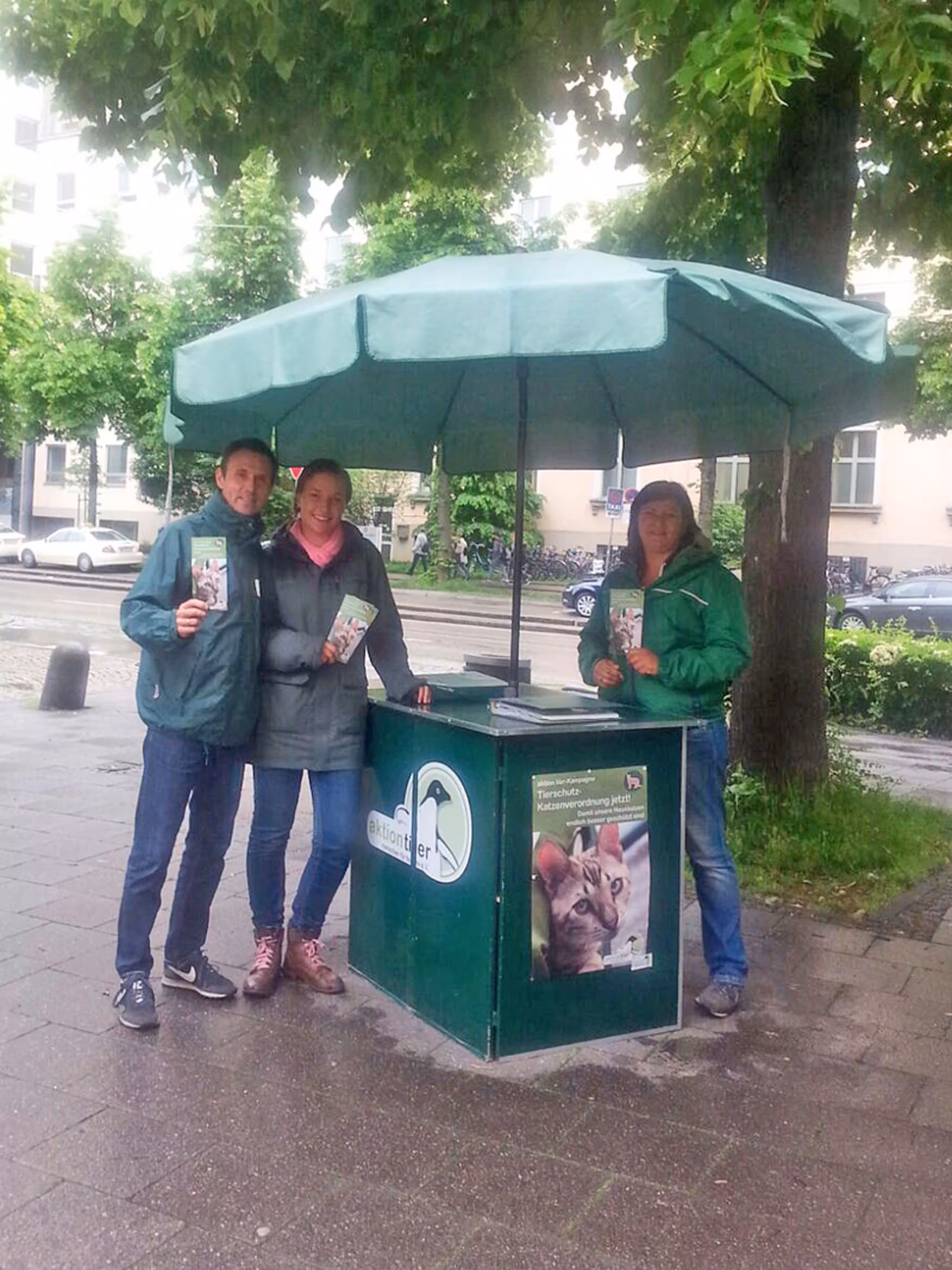Viele Menschen nahmen an einer Führung durch das Mobil teil und trugen sich am Ende auch in unsere Unterschriftenlisten ein. Aber auch an den folgenden Tagen stand das Thema Tierschutz-Katzenverordnung bei aktion tier auf dem Programm: ob Potsdam, Ulm oder München, in ganz Deutschland verbreiteten unsere Mitarbeiter Flyer und führten viele spannende Gespräche mit Passanten. Trotz des durchwachsenen Wetters ist uns ein schöner Start mit unserer neuen Aufklärungskampagne gelungen.