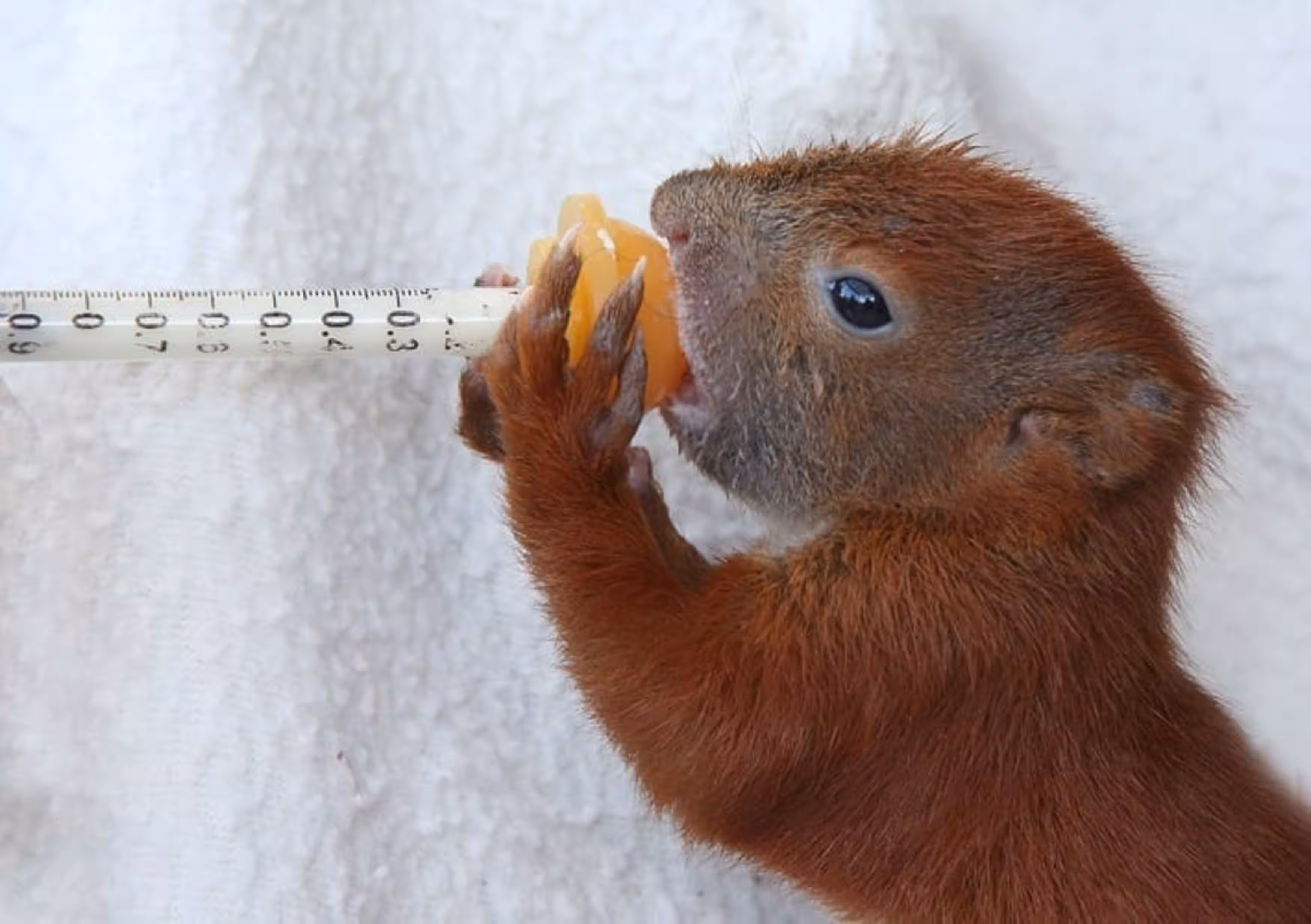 Wir bekommen öfter Eichhörnchen, die durch einen Sturz oder die Kollision mit einem Auto ein schweres Schädel-Hirn-Trauma haben. Sie benötigen viel Ruhe, Medikamente und können oft nicht allein Nahrung aufnehmen. Wir füttern sie, auch adulte Tiere, bis sie wieder selbst fressen können