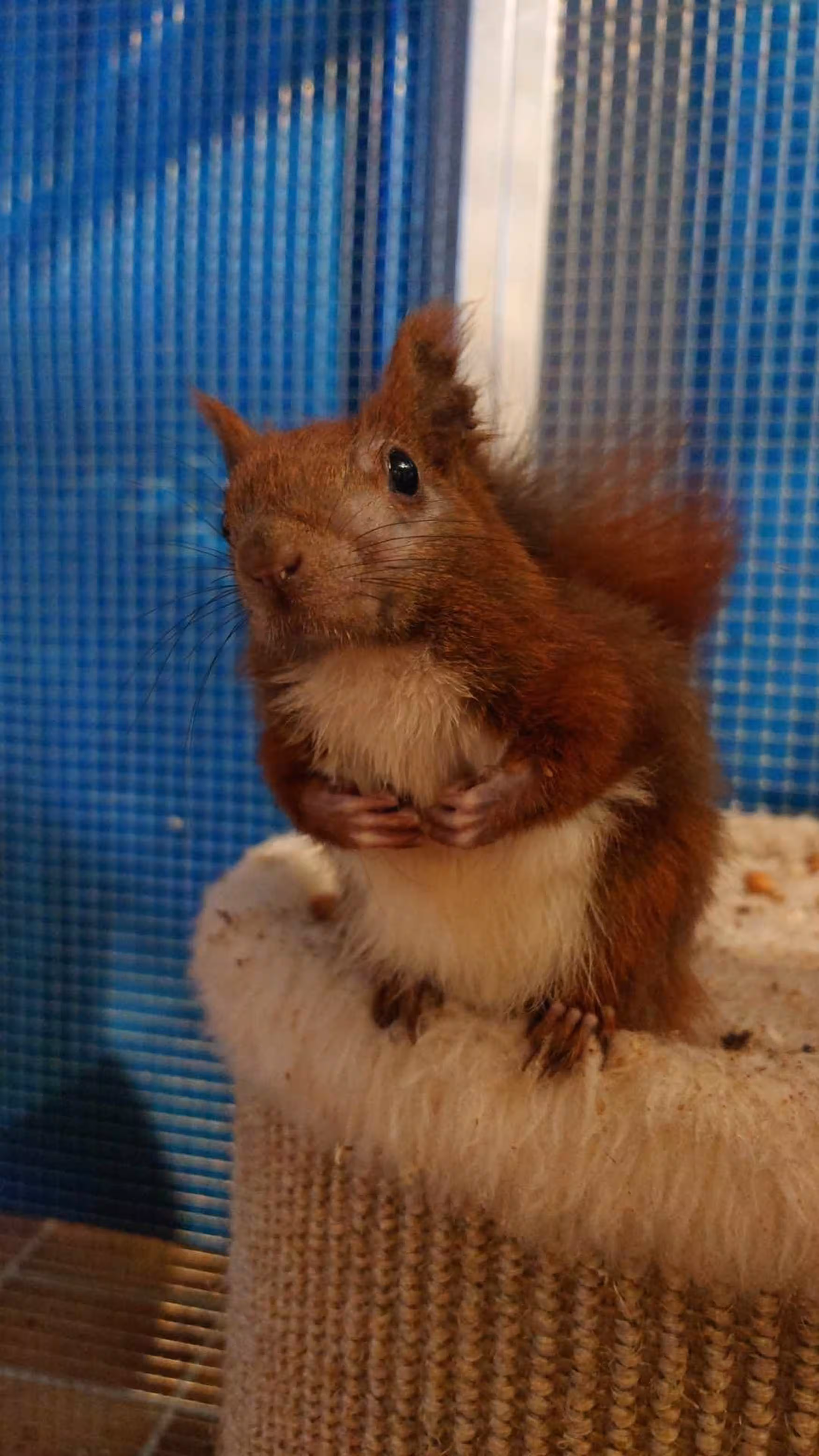 Wir haben Hörnchen aus Katzennetzen befreit, die meisten entlassen wir vor Ort wieder. In einem Fall wurde uns ein im Katzennetz hängendes Hörnchen gemeldet. Die Mieter waren verreist und die Wohnung befand sich im dritten Stock, so dass wir mit der Leiter nicht herankamen. Hier hatten das Hörnchen und wir Glück und bekamen Hilfe vom THW.